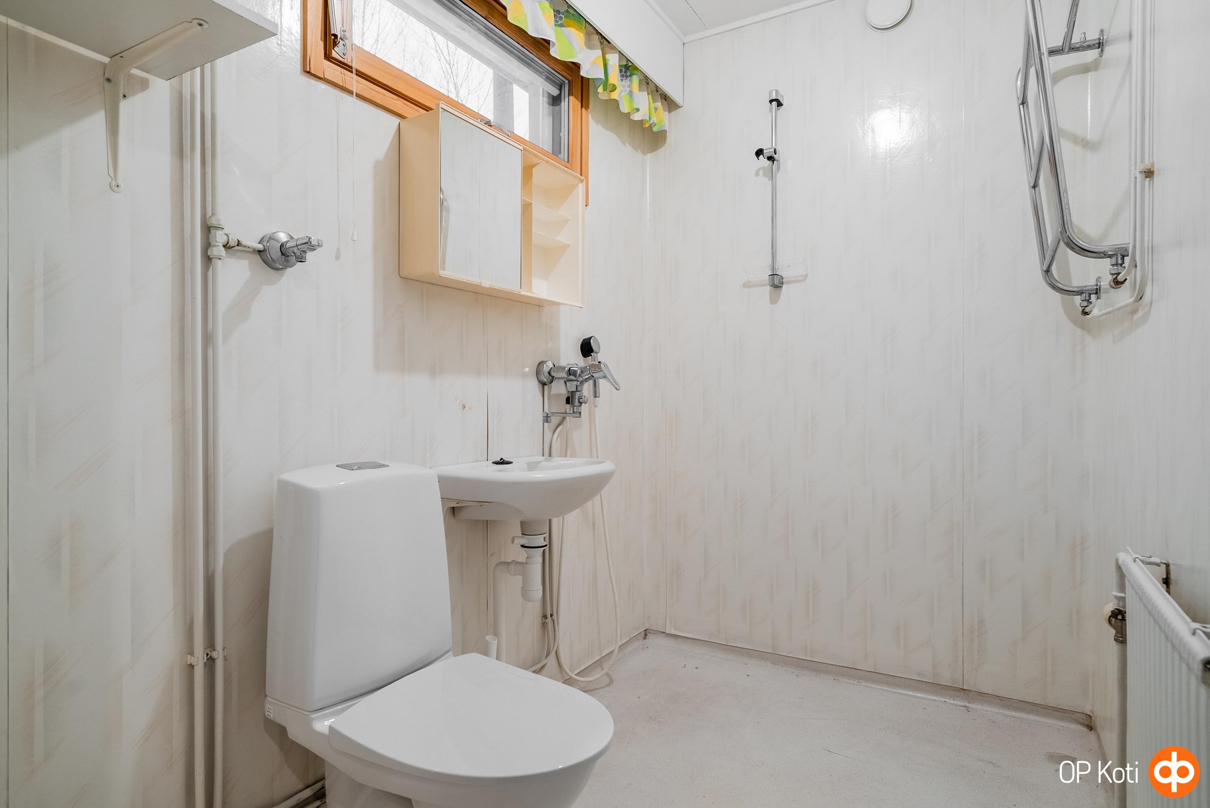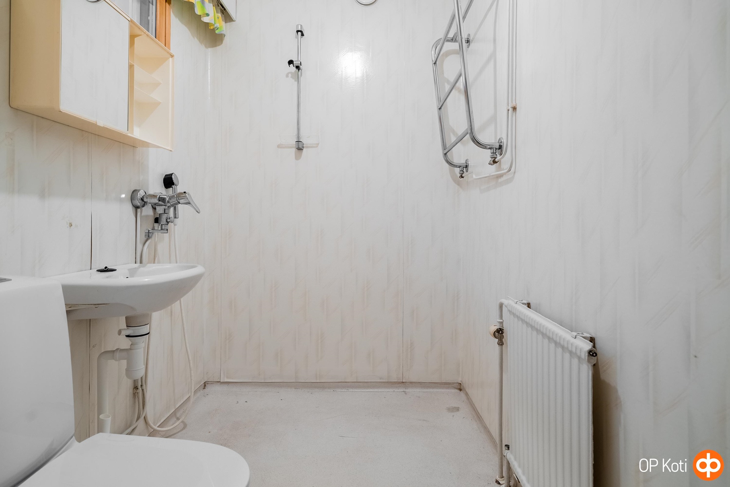 - Kylpyhuone, suihku, peilikaappi Toinen lasi rikki, kaapit, pesukoneliitäntä. Remontoitava, alkuperäiskuntoinen