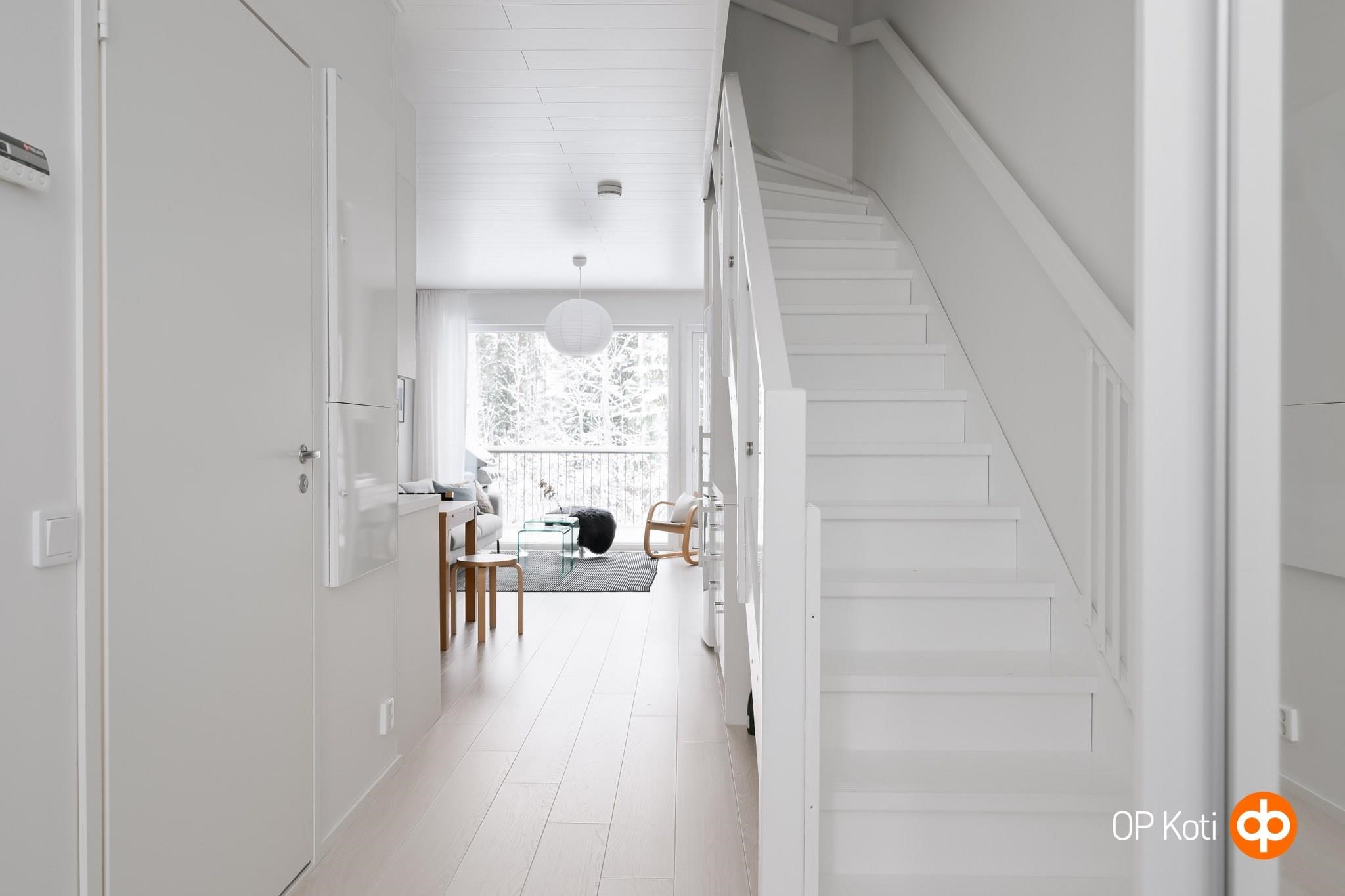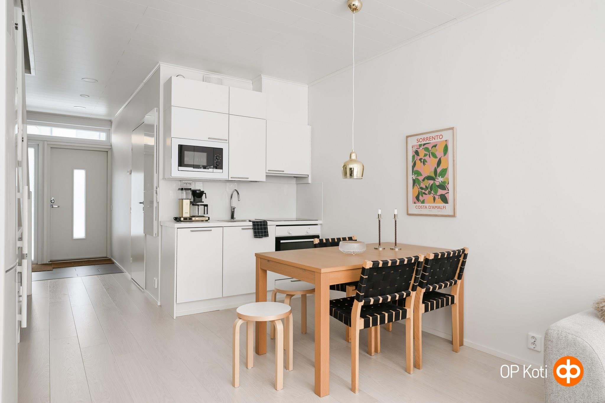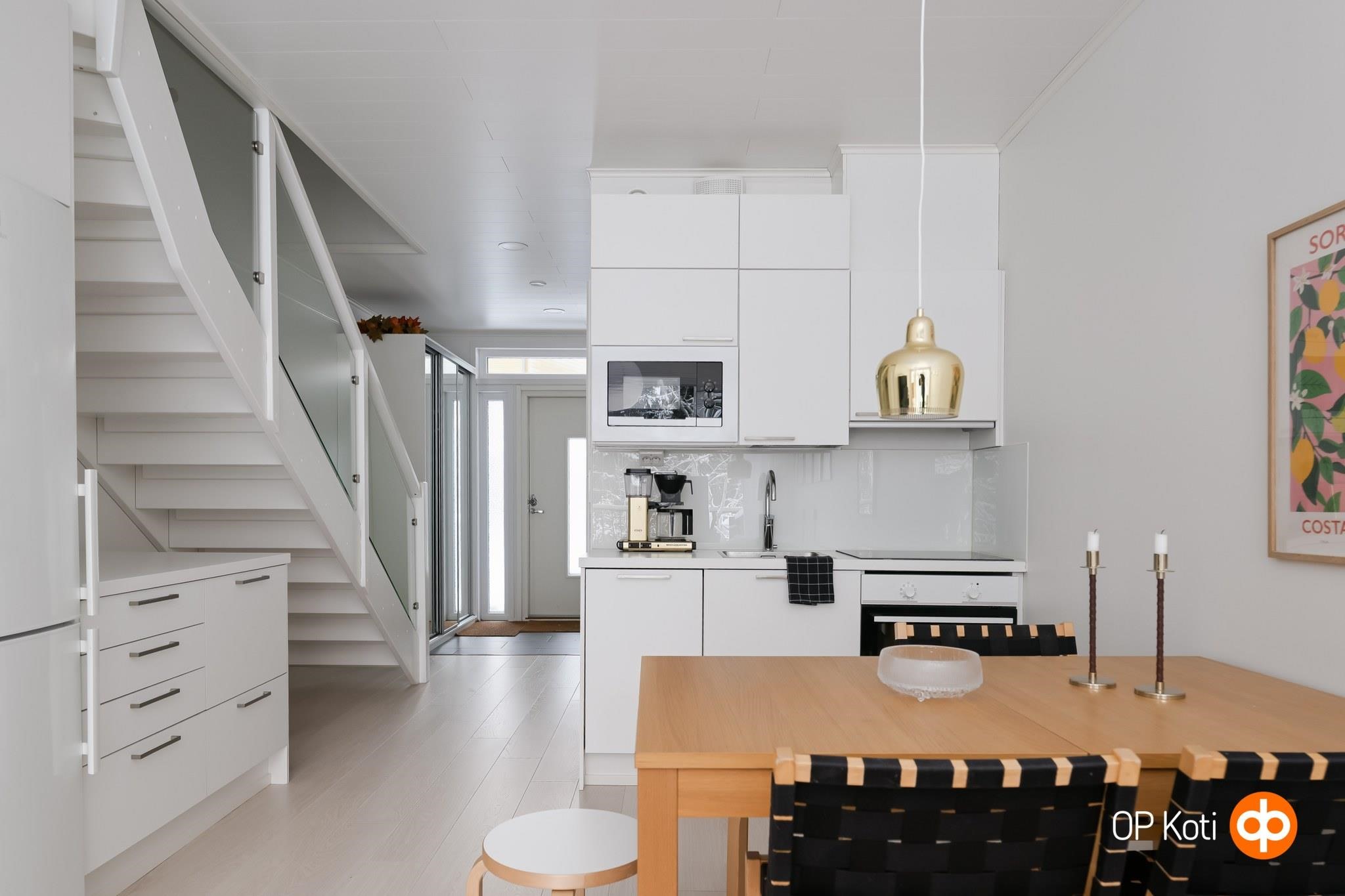 Kodissa on raikkaat vaaleat pinnat ja toimiva pohjaratkaisu kahdessa kerroksessa. Alakerrassa sijaitsevat tyylikäs keittiö ja avara olohuone, josta on suora käynti takapihalle. Takapihalla on myös terassi, joka kutsuu nauttimaan kesäpäivistä. Alakerrasta löytyvät myös pesuhuone ja sauna, jotka tuovat arkeen ripauksen luksusta. Yläkerrassa on kaksi makuuhuonetta, kylpyhuone sekä upea kattoterassi, joka on täydellinen paikka rentoutumiseen tai vaikka aamukahville. Autokatoksen perällä oleva varasto tarjoaa runsaasti säilytystilaa.