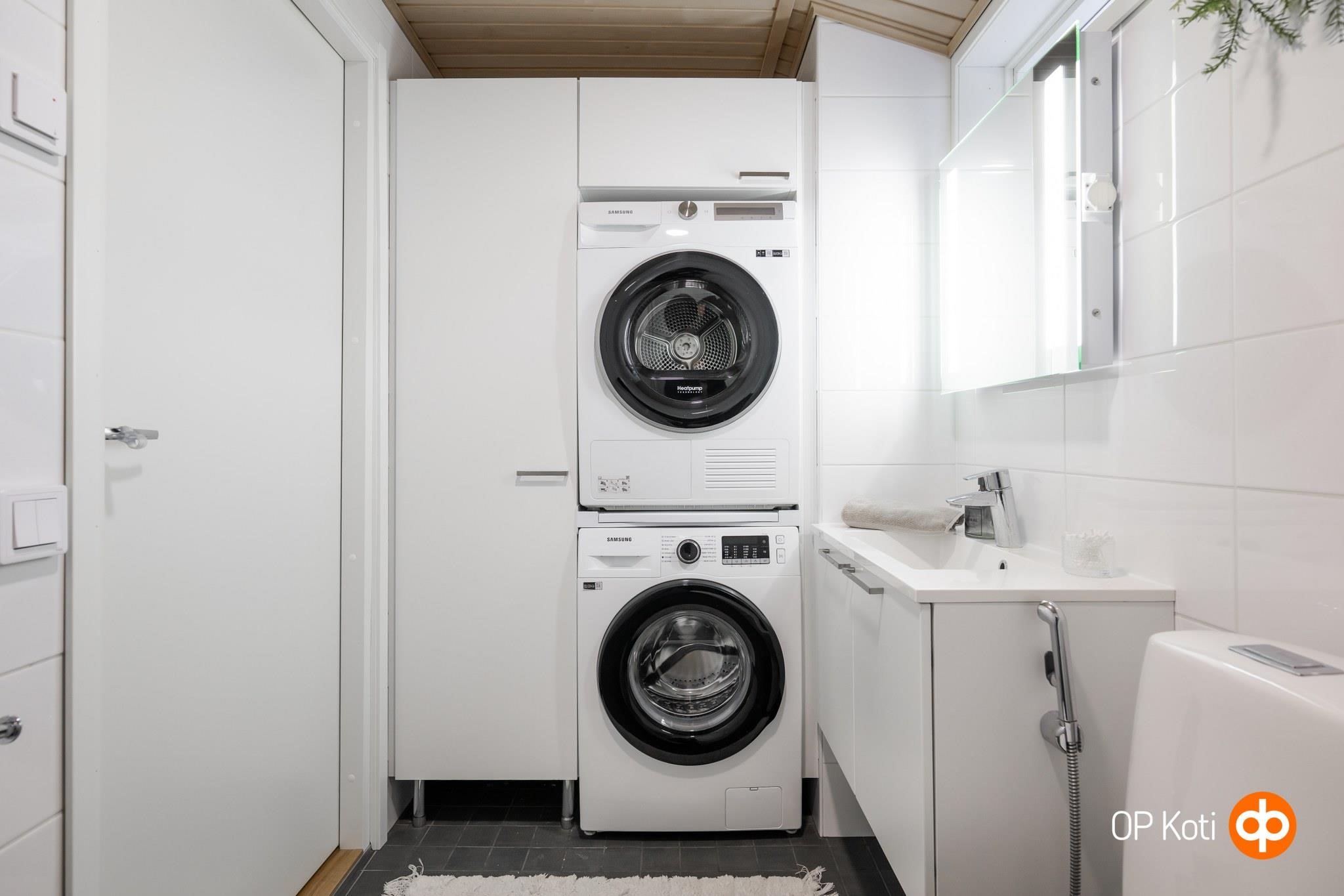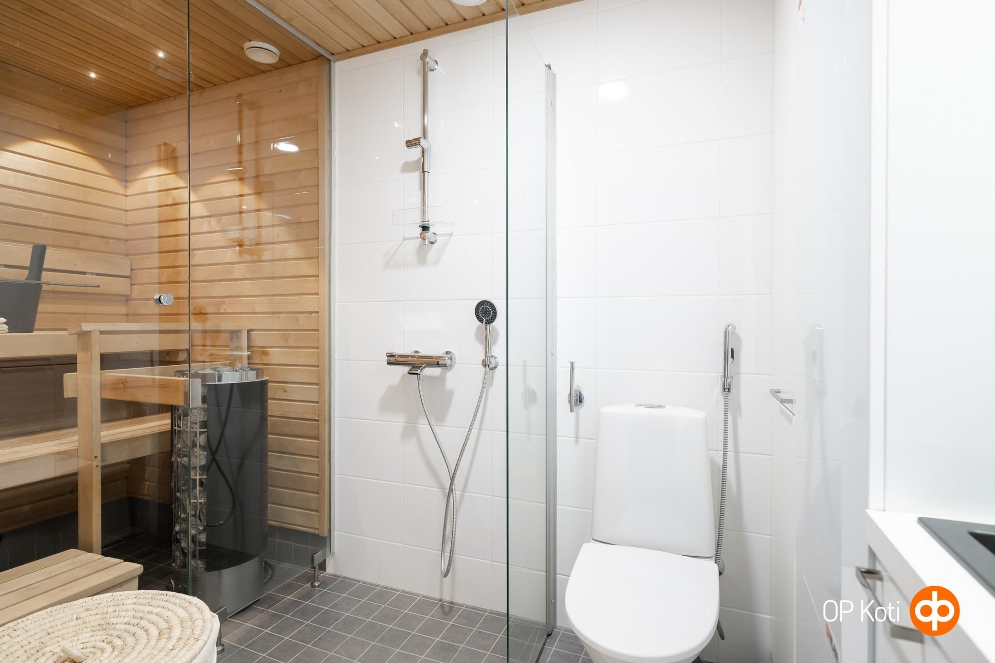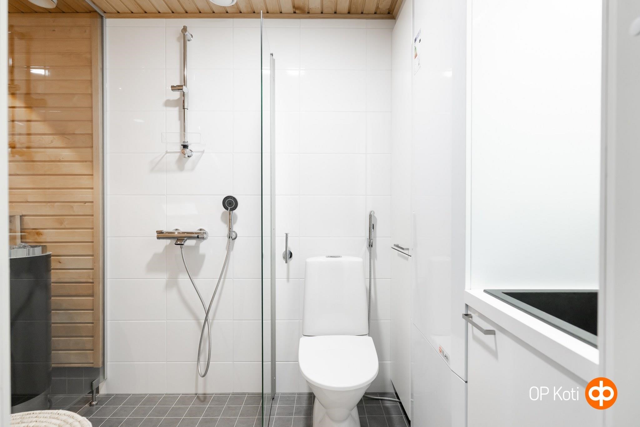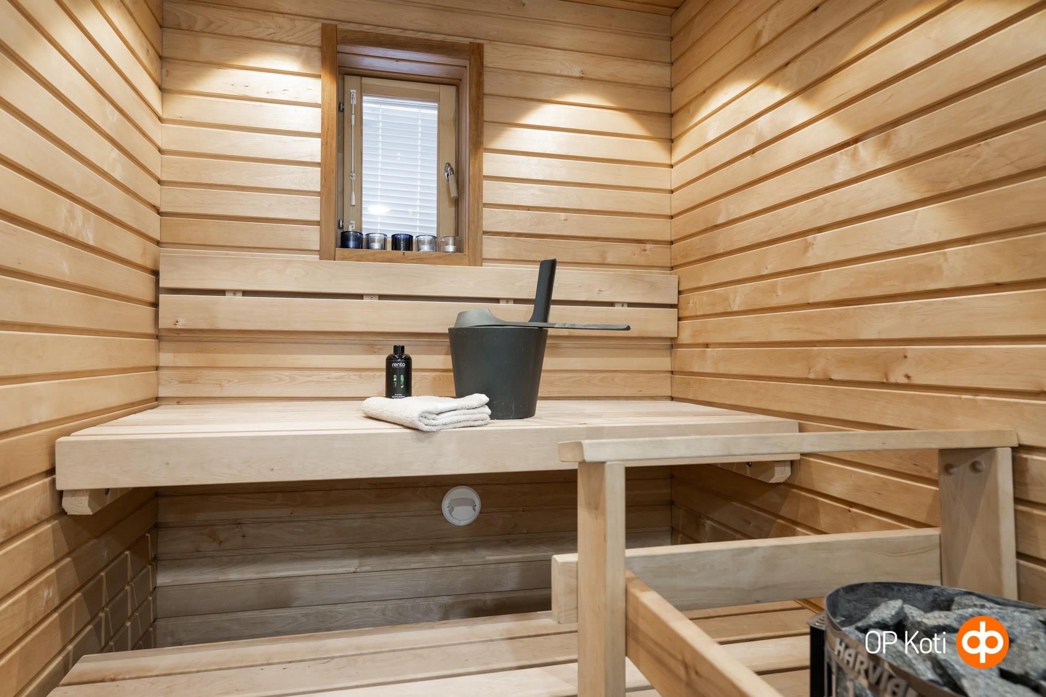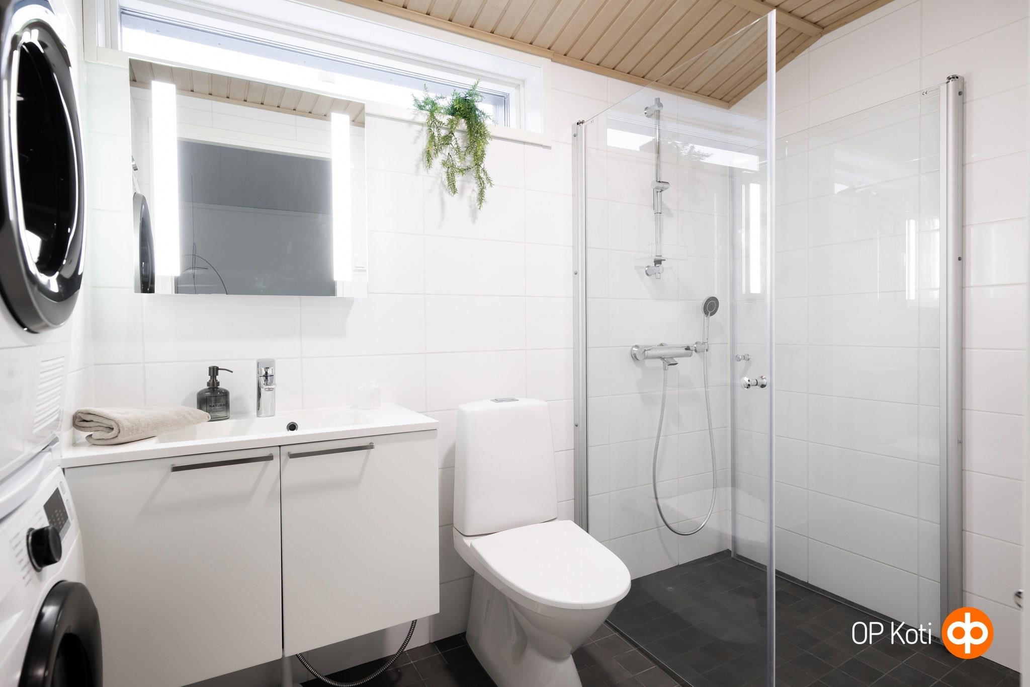 - Sauna, sähkökiuas, kylpyhuone Molemmissa kerroksissa, suihku, suihkuseinä, peilit, kaapit, allaskaappi, pesukoneliitäntä Yläkerrassa, lattialämmitys, kiinteät valaisimet.
