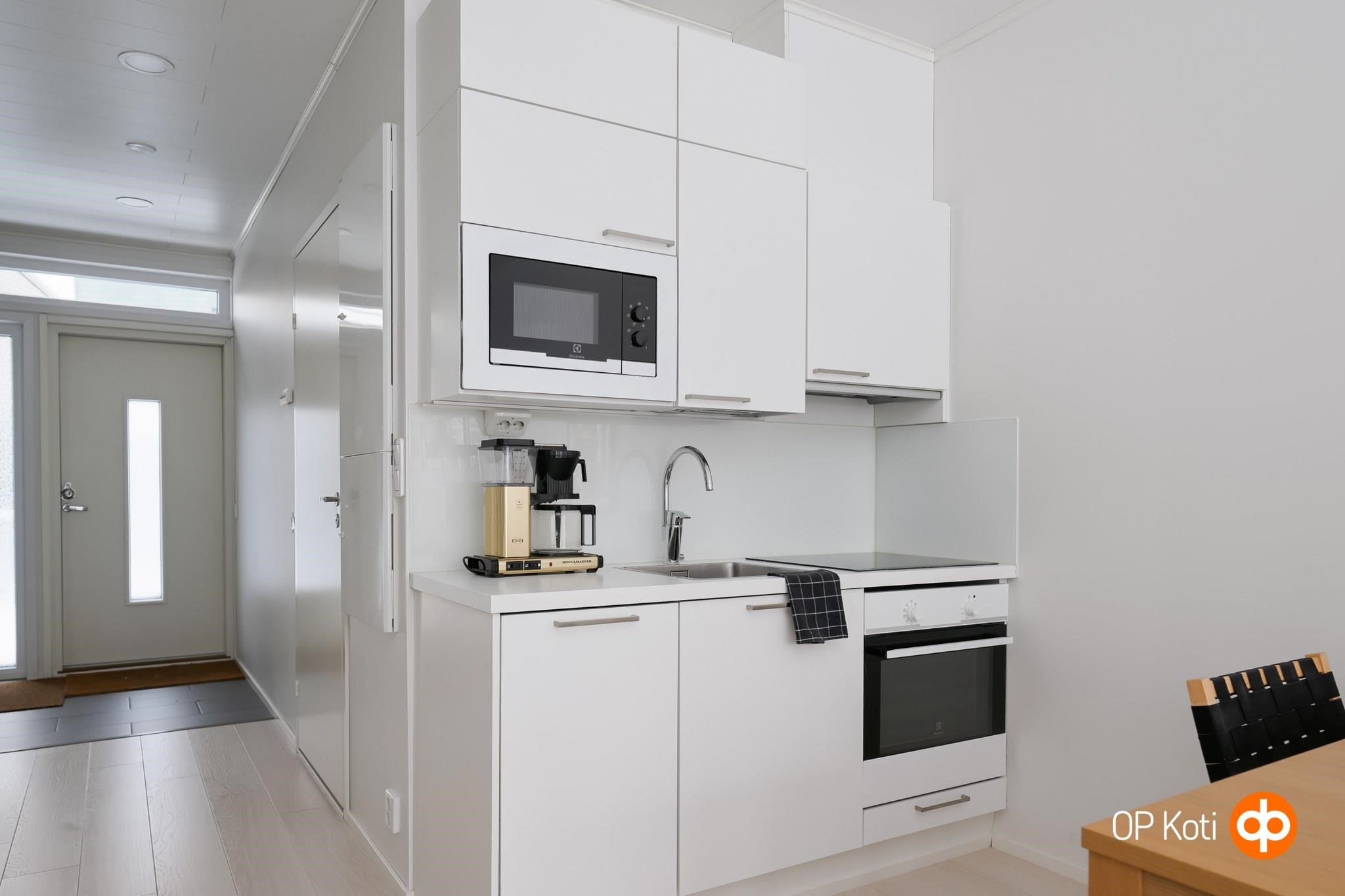 - Jääkaappipakastin, induktioliesi, liesituuletin, mikroaaltouuni, astianpesukone, kaapistot, kiinteät valaisimet.
