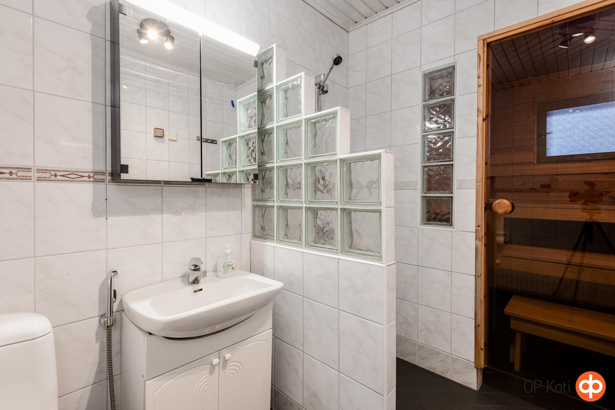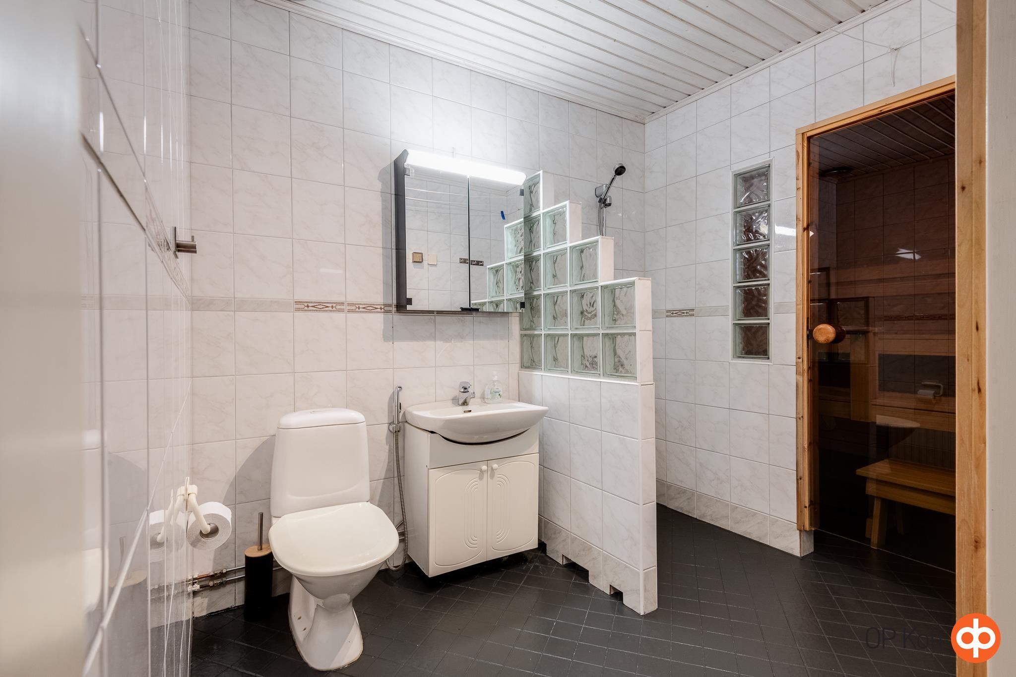 - Sauna, sähkökiuas, kylpyhuone, erillinen wc, suihku, suihkuseinä, peilit Alakerran wc, peilikaappi Yläkerran wc, kaapit, allaskaappi, pesukoneliitäntä, lattialämmitys Kylpyhuoneessa, kiinteät valaisimet.