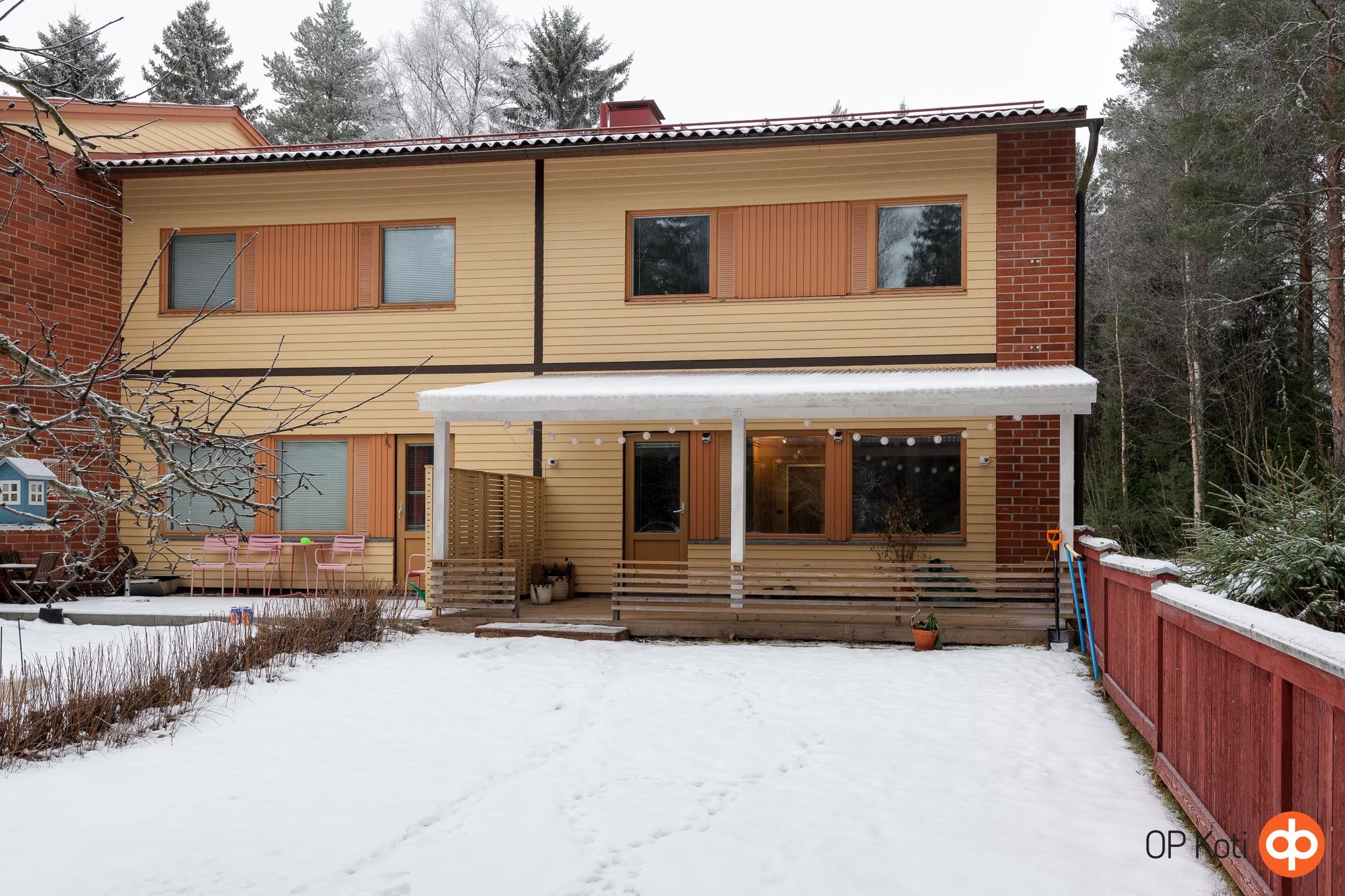 Huoneisto jakautuu kahteen kerrokseen ja on kooltaan 105 m². Alakerrassa sijaitsevat avara olohuone, moderni keittiö sekä erillinen wc. Yläkerrassa on kolme makuuhuonetta, kylpyhuone ja sauna, mikä tarjoaa perheelle erinomaiset tilat arjen pyörittämiseen. Keittiö on remontoitu vuonna 2018, ja kylpyhuone sekä sauna vuonna 1995. Huoneistossa on myös kaksi vaatehuonetta ja ulkovarasto, jotka tarjoavat runsaasti säilytystilaa. Terassi ja piha-alue ovat kuin luodut kesäpäivien viettoon, ja ilmalämpöpumppu takaa miellyttävän sisäilman ympäri vuoden.