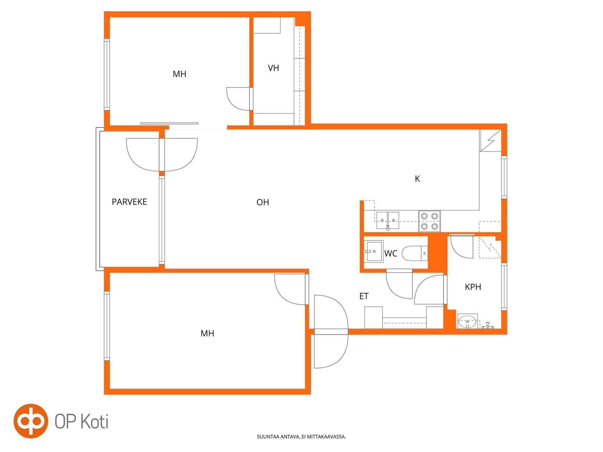 - Parveke, olohuone ja makuuhuoneet noin länteen. Keittiö itään.