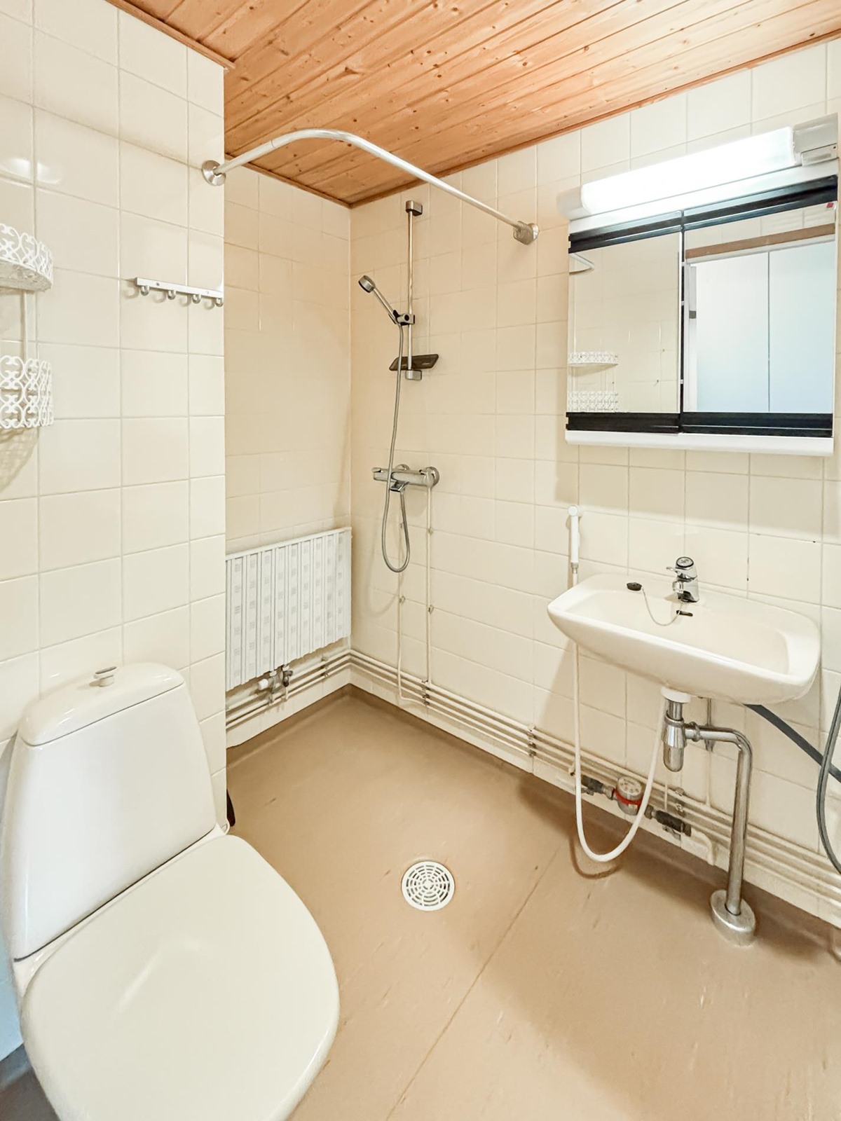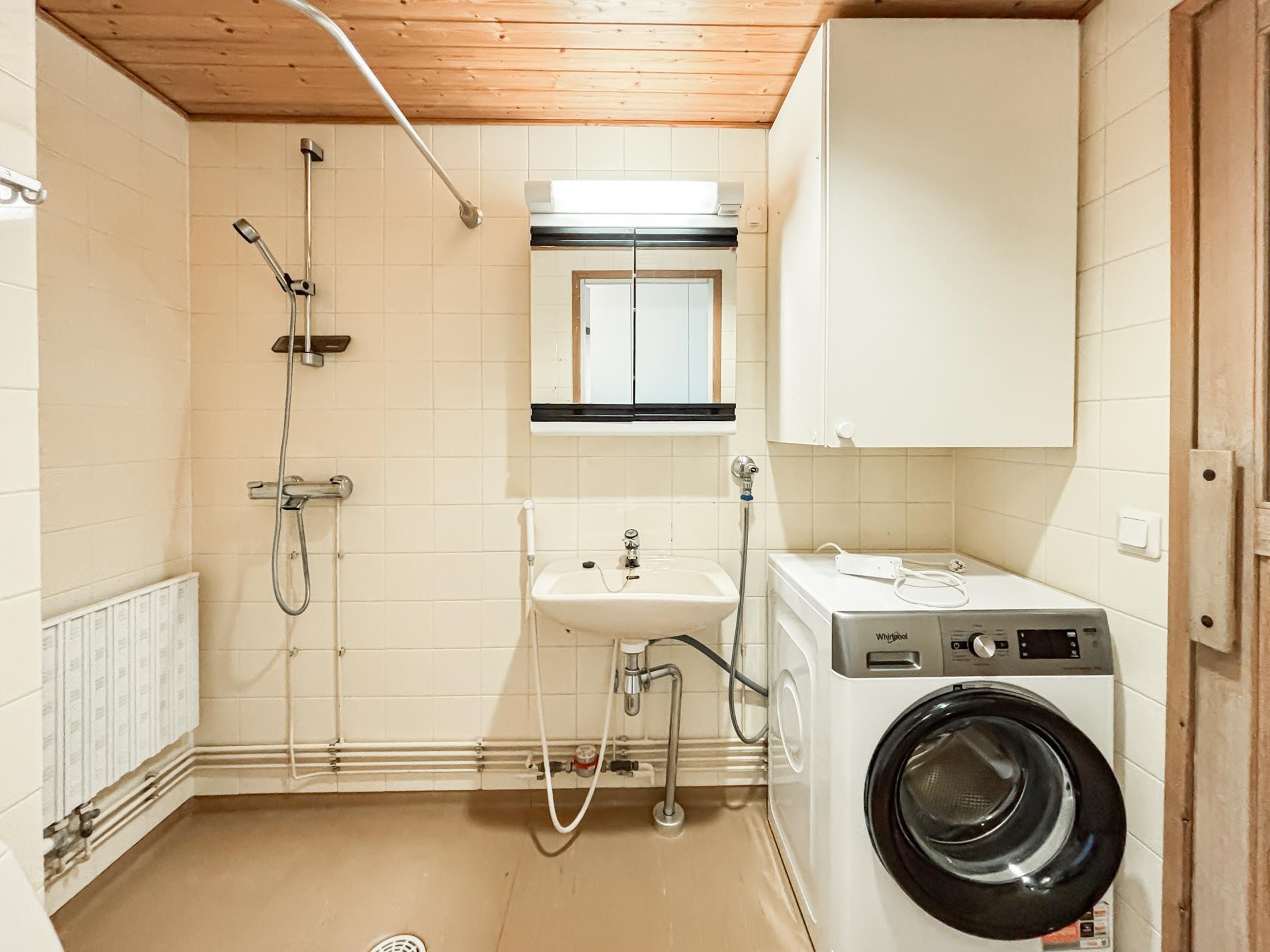 - Sauna, sähkökiuas, kylpyhuone, suihku, peilikaappi, pesukoneliitäntä, kiinteät valaisimet.