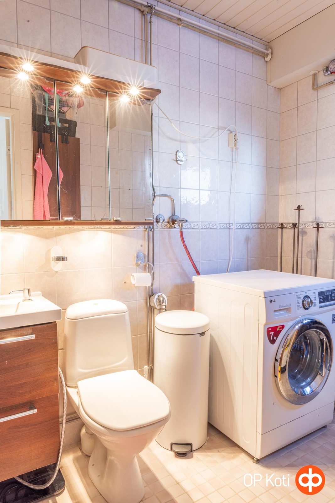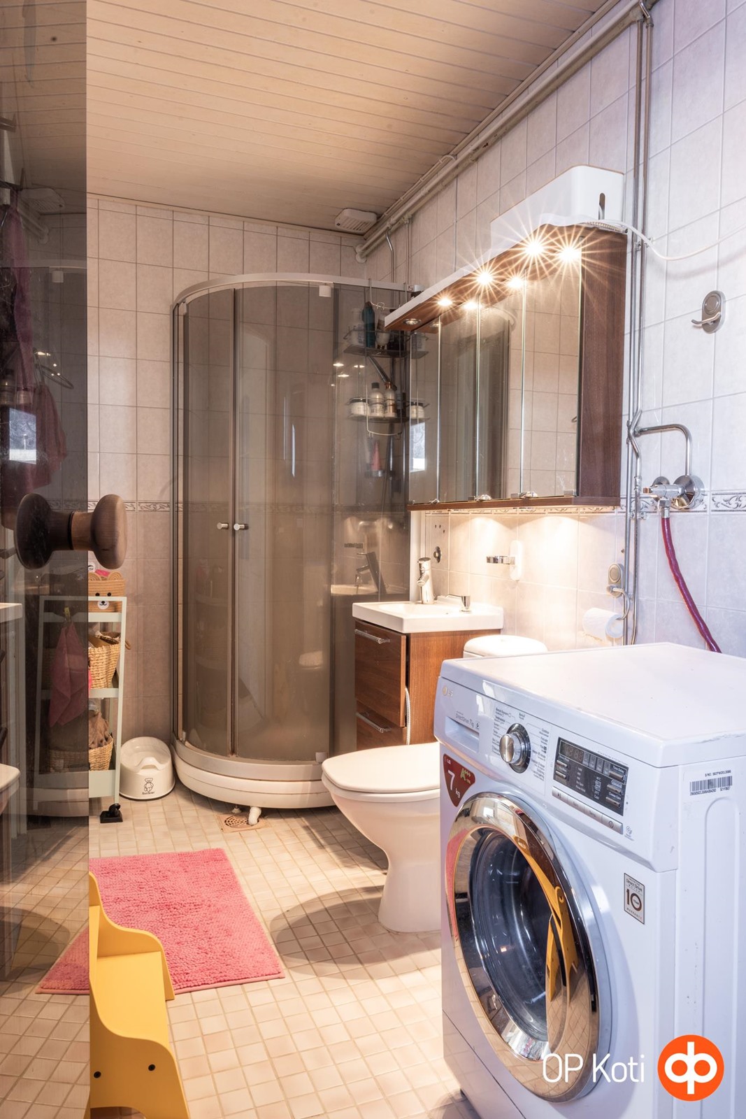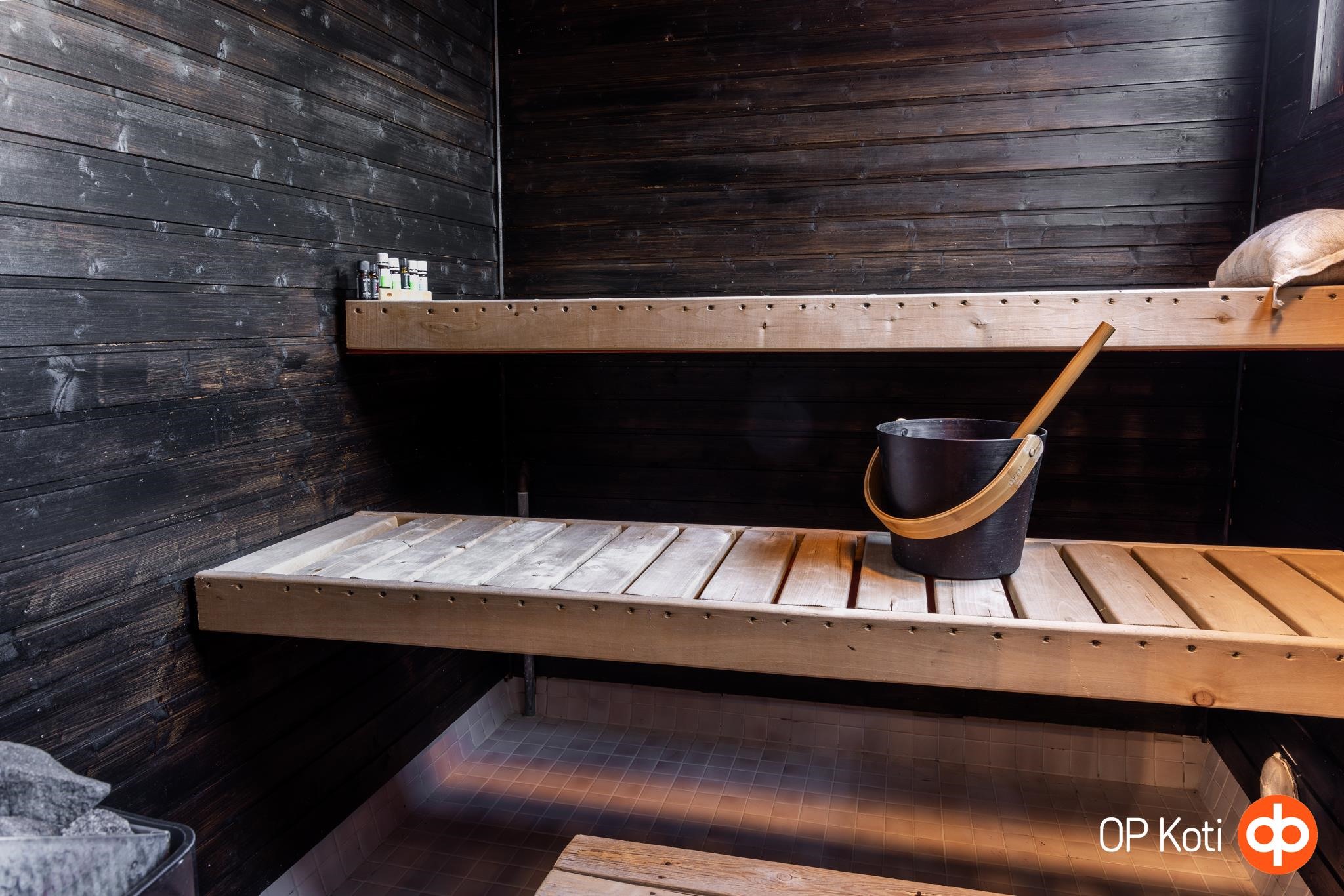 - Sauna, sähkökiuas, kylpyhuone, suihkukaappi, peilikaappi, kaapit, allaskaappi, pesukoneliitäntä, lattialämmitys, kiinteät valaisimet.