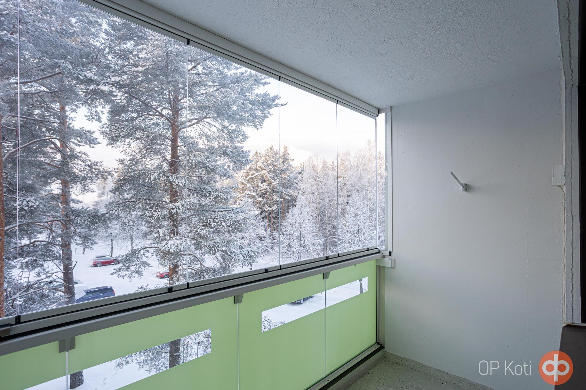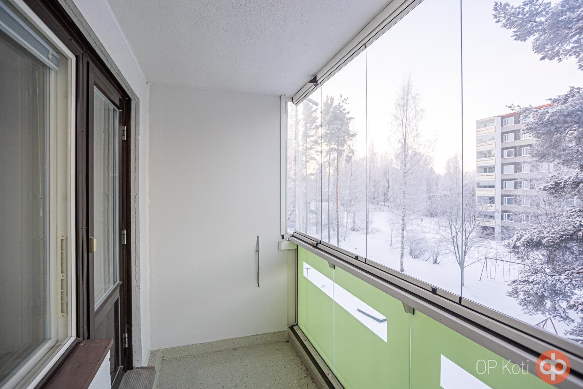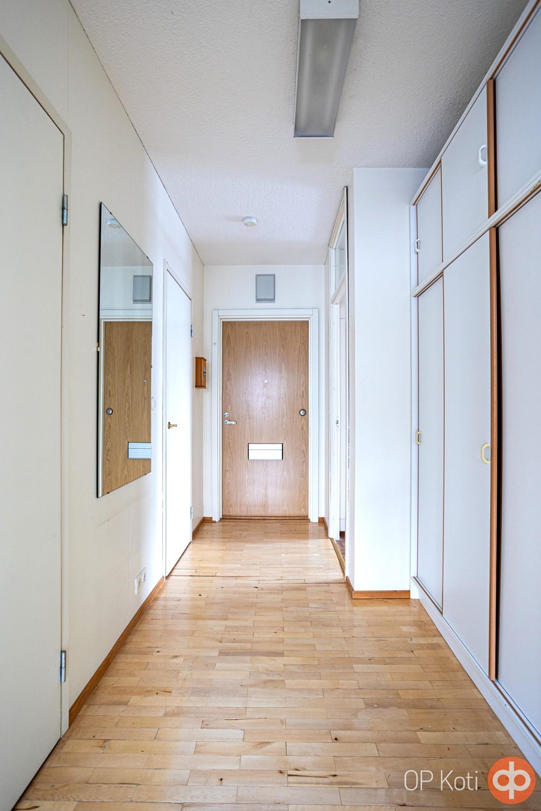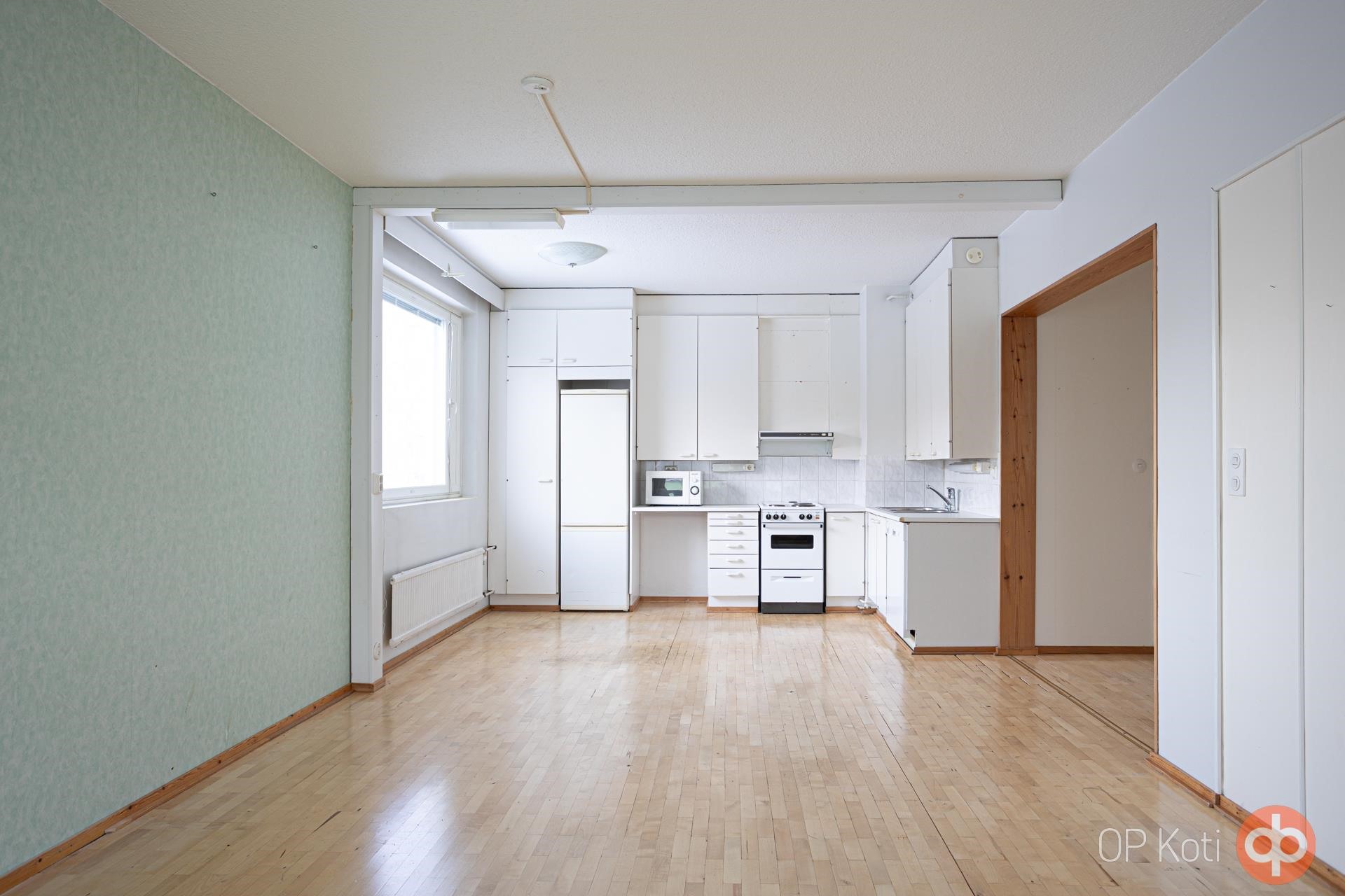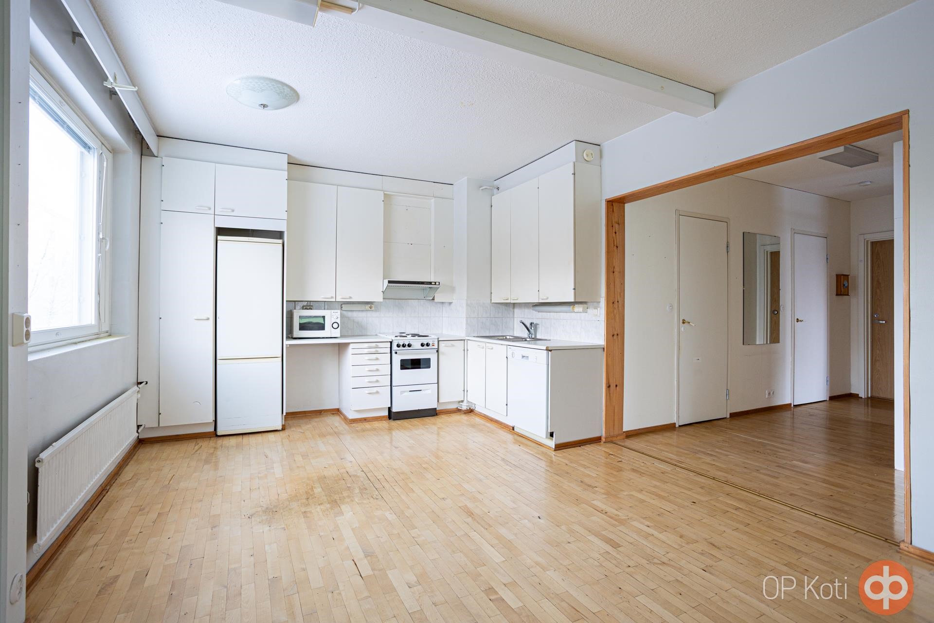Tämä tilava asunto sijaitsee hissitalon kolmanessa kerroksessa. Keittiö ja olohuoneen välinen seinä on purettu pois, jolloin saatu asuntoon valoisuutta ja avaraa tilaa. Huoneistossa on parkettilattiat ja kylpyhuoneen kolme seinää ja lattia on kaakeloitu ja yksi seinä on paneelilla. Huoneiston pinnat ja parkettilattiat kaipaavat uudistamista.