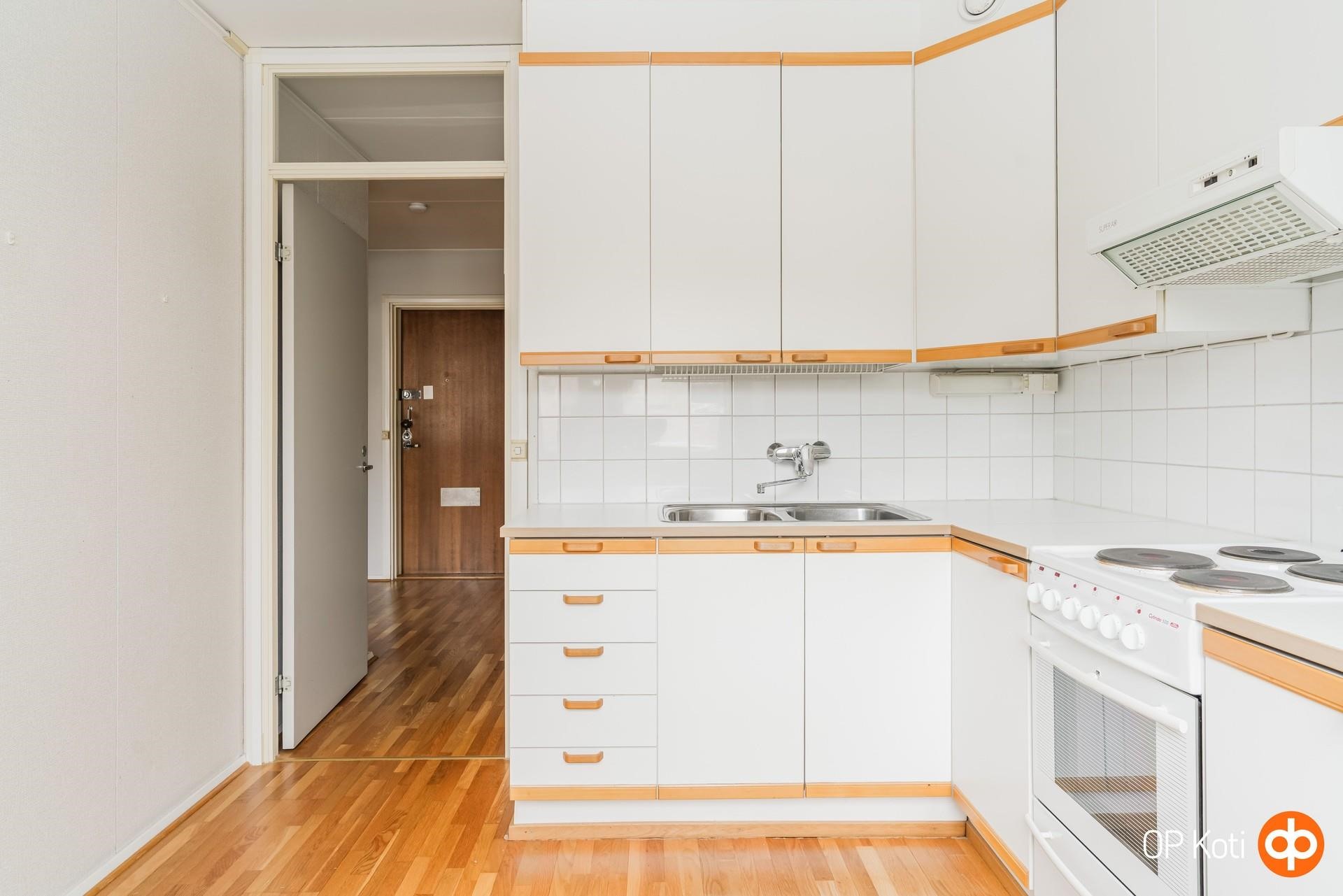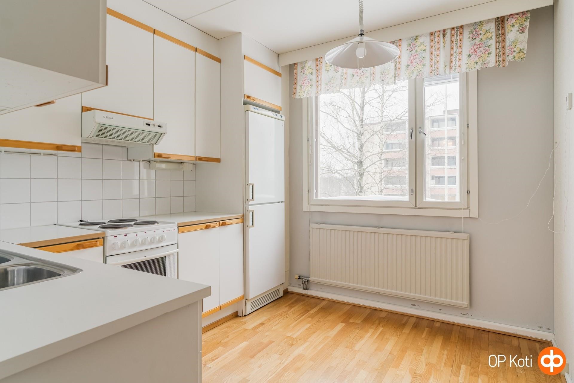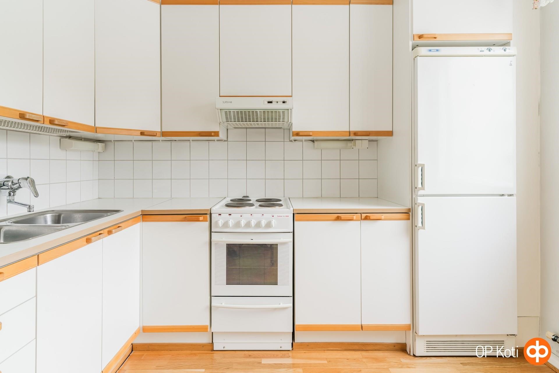 - Jääkaappipakastin, sähköliesi, liesituuletin, kaapistot, kiinteät valaisimet.