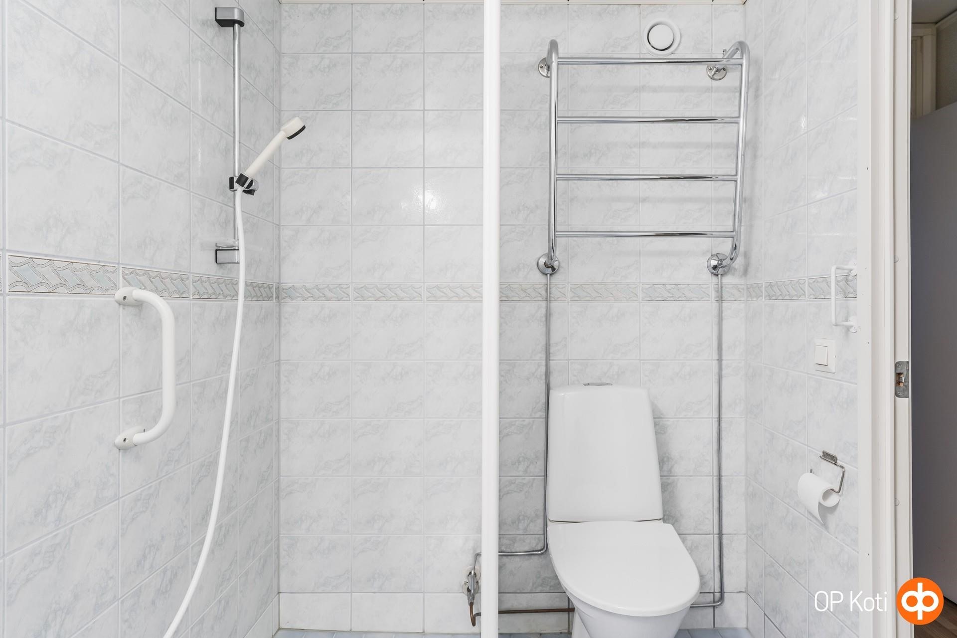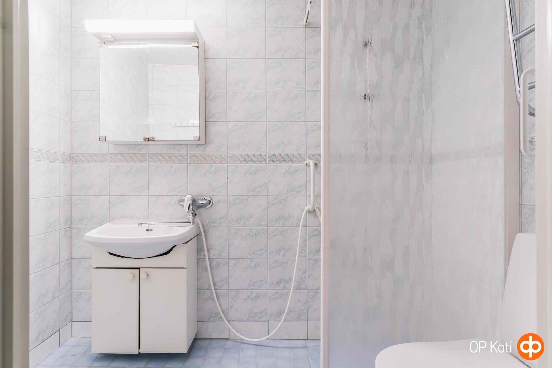 - Kylpyhuone, suihku, suihkuseinä, peilikaappi, allaskaappi, pesukoneliitäntä, kiinteät valaisimet.