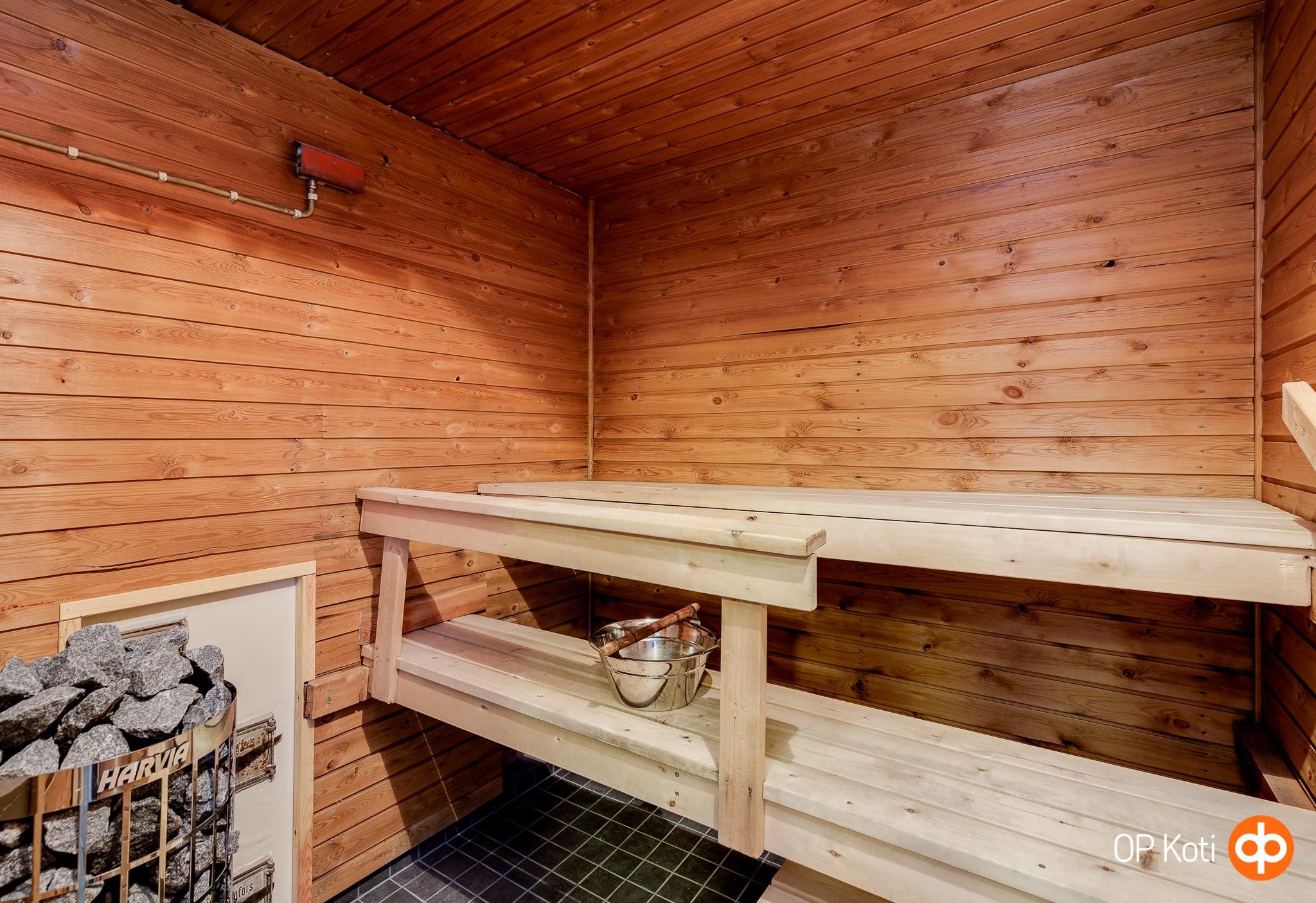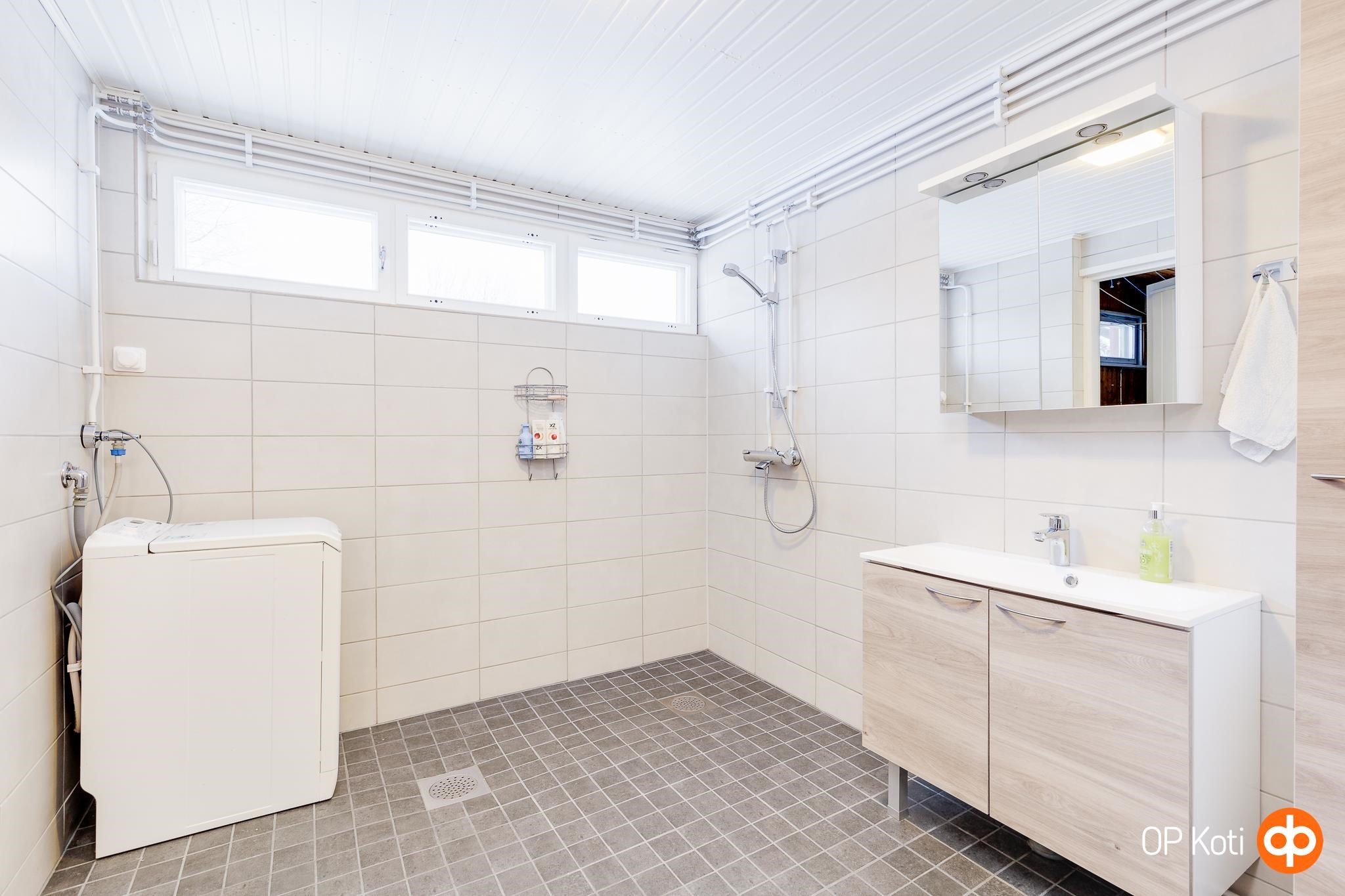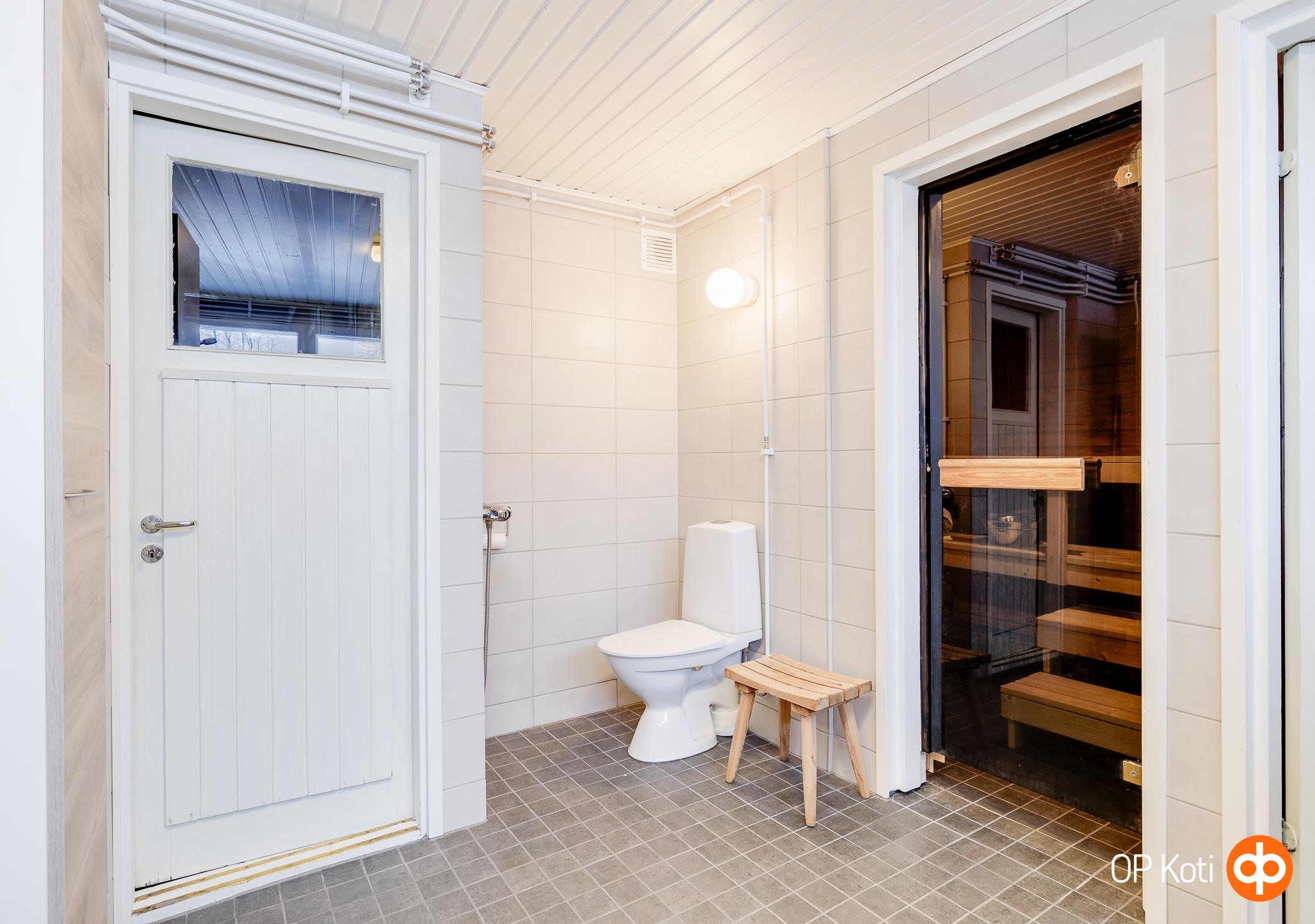 - Sauna, sähkökiuas, kylpyhuone / wc, erillinen wc, suihku, peilit, kaapit, pesukoneliitäntä, lattialämmitys (vesikiertoinen, kylpyhuoneessa), kiinteät valaisimet.