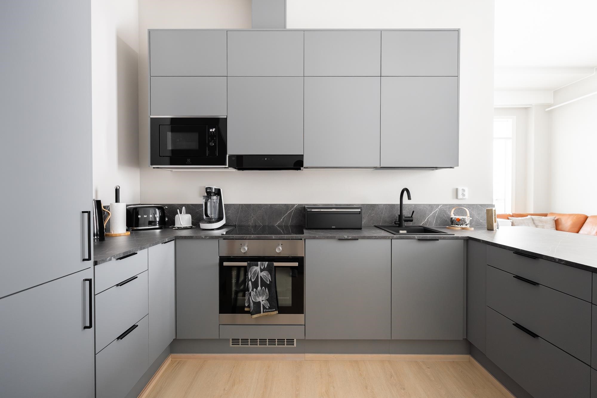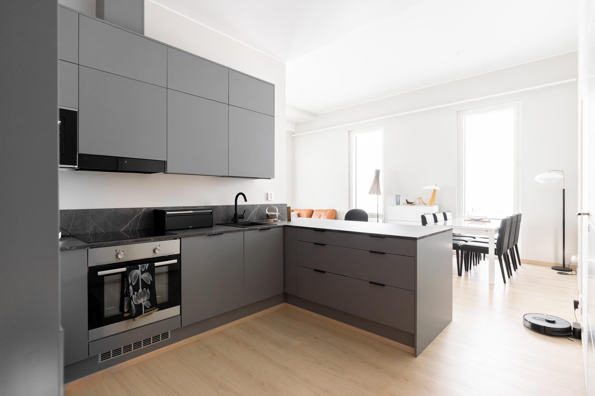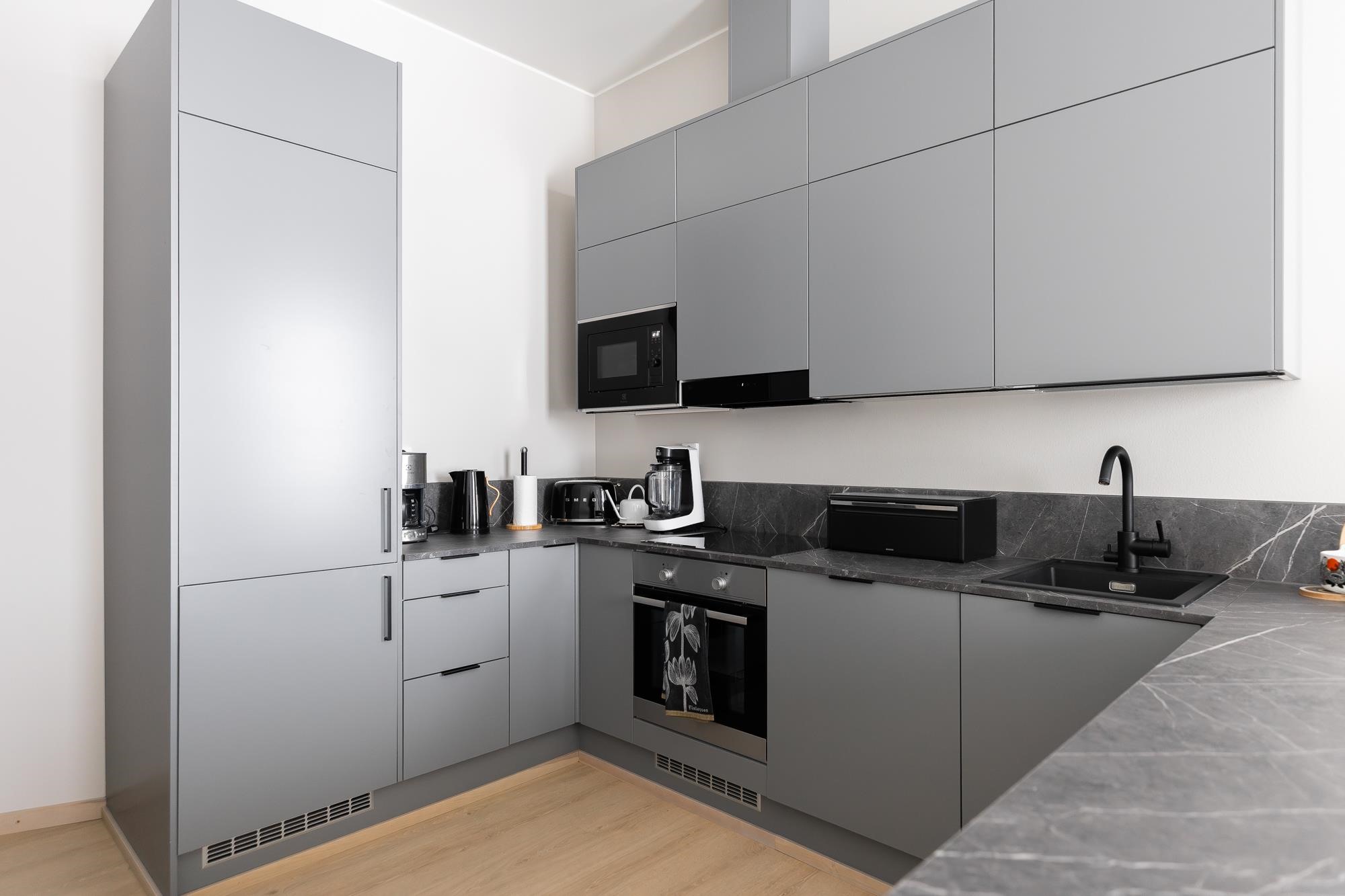 - Jääkaappipakastin Integroitu, induktioliesi, liesituuletin, mikroaaltouuni Integroitu, astianpesukone, kaapistot, kiinteät valaisimet.