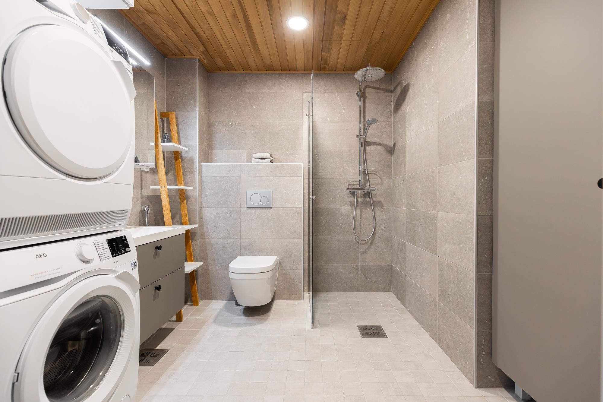 - Kylpyhuone, suihku, suihkuseinä, peilit, peilikaappi, kaapit, allaskaappi, pesukoneliitäntä, lattialämmitys, kiinteät valaisimet.