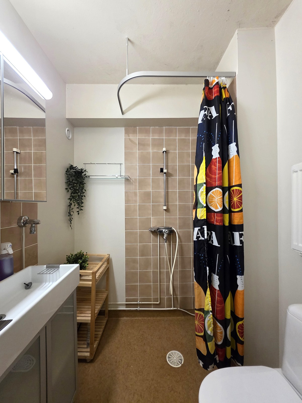 - Kylpyhuone, suihku, peilikaappi, allaskaappi, pesukoneliitäntä, kiinteät valaisimet.