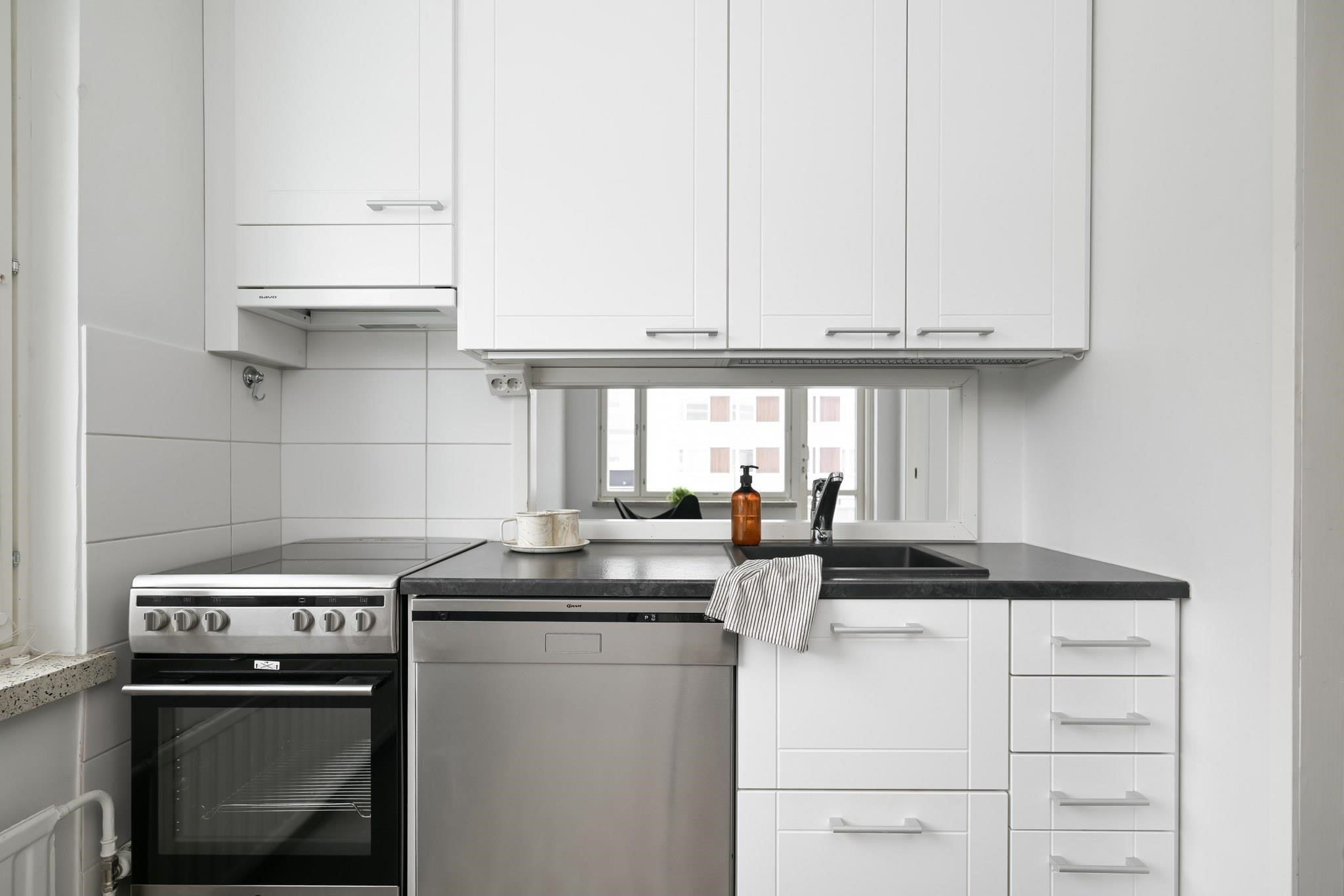 - Jääkaappipakastin, erillisuuni, keraaminen liesi, liesituuletin, astianpesukone, kaapistot.