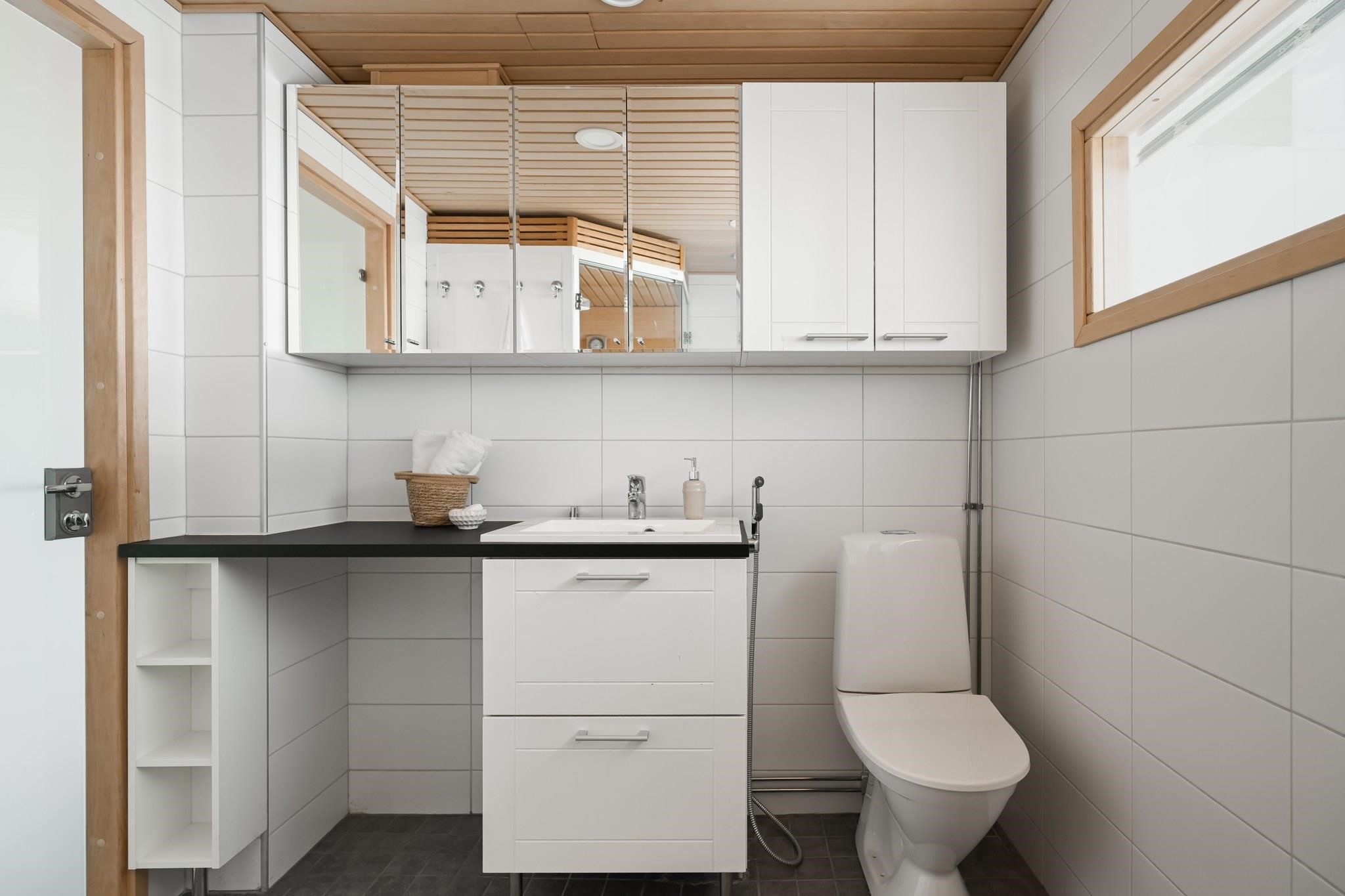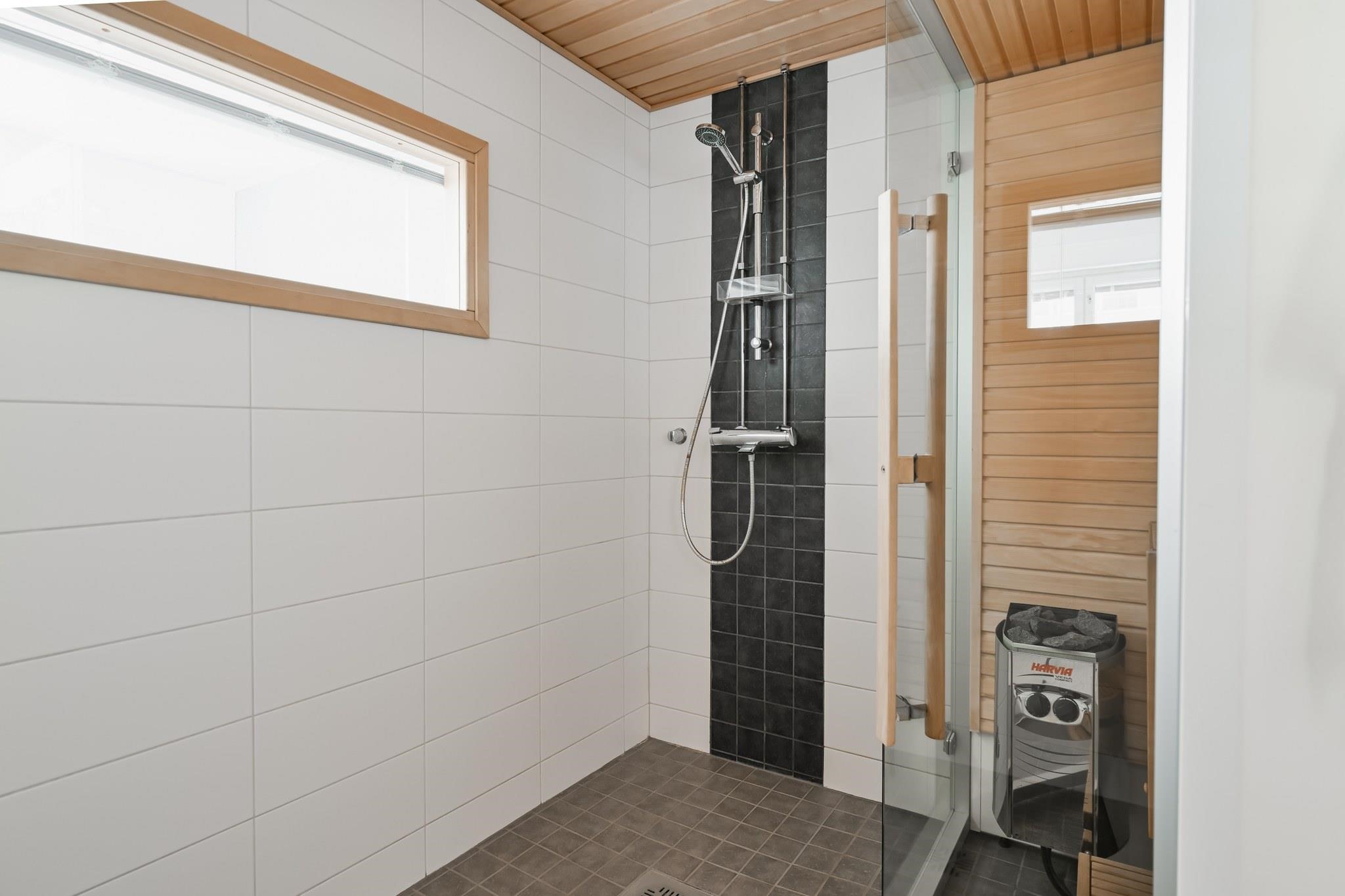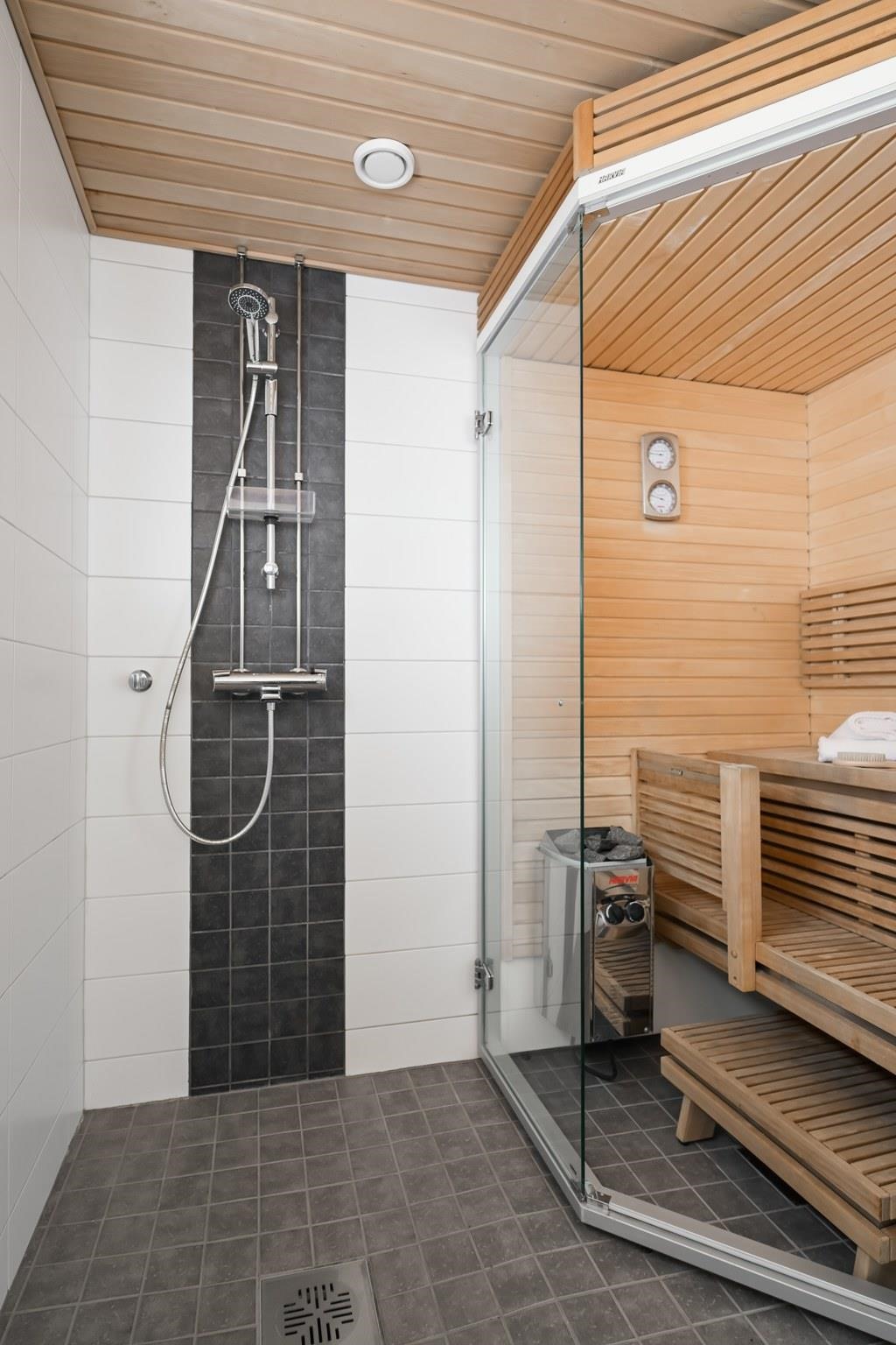 - Sauna (Harvia), sähkökiuas, kylpyhuone, suihku, peilikaappi, allaskaappi, pesukoneliitäntä, lattialämmitys (vesikiertoinen).