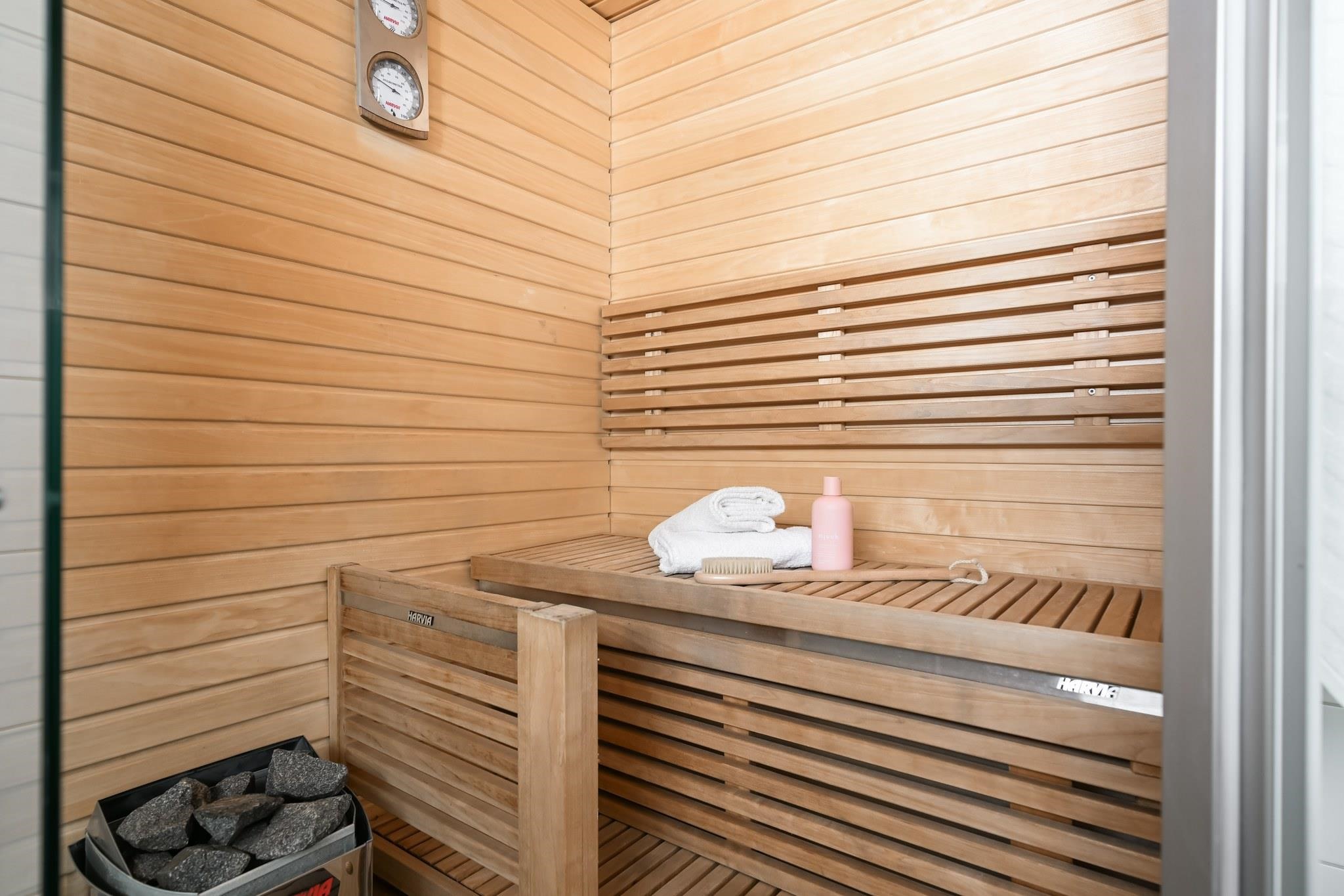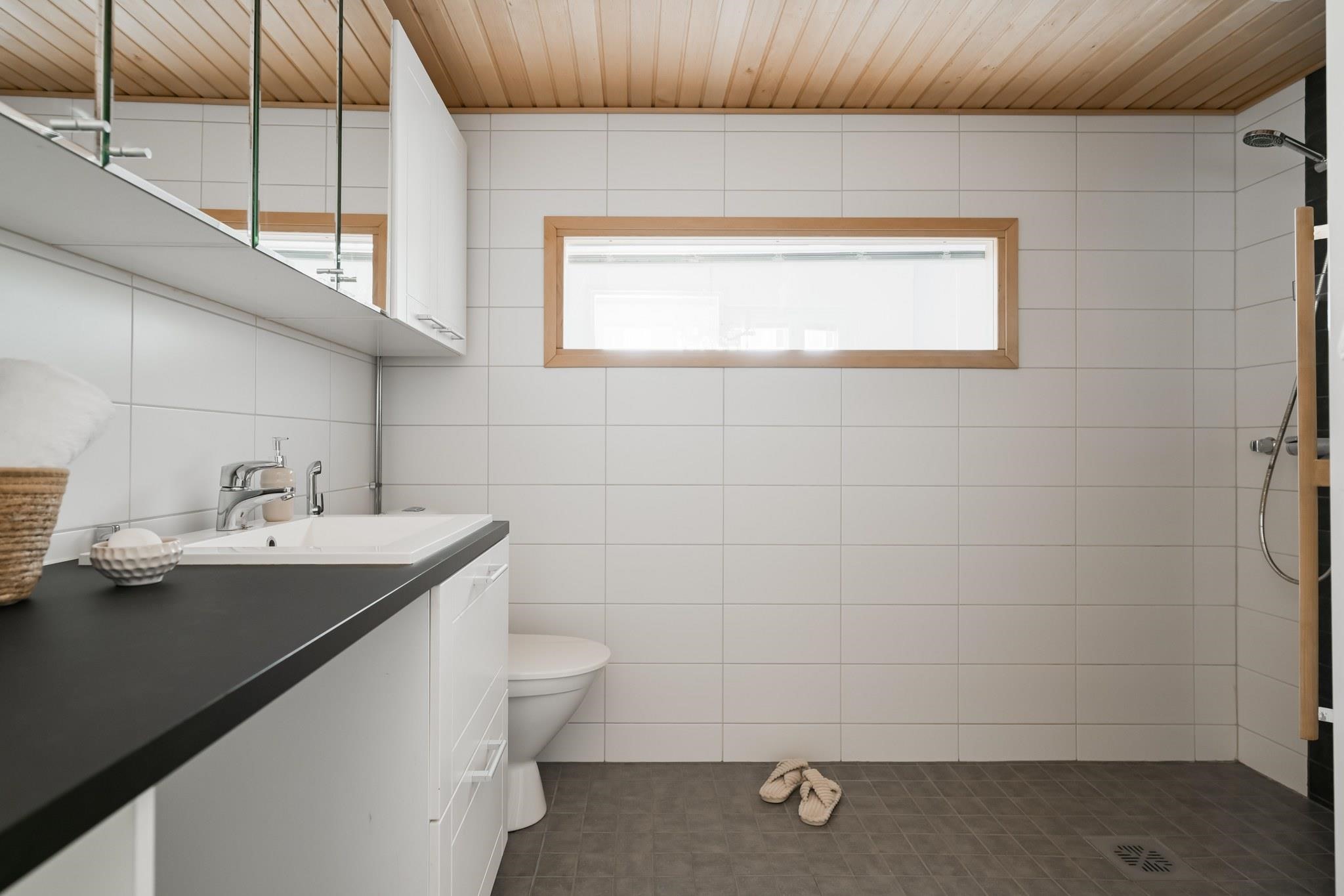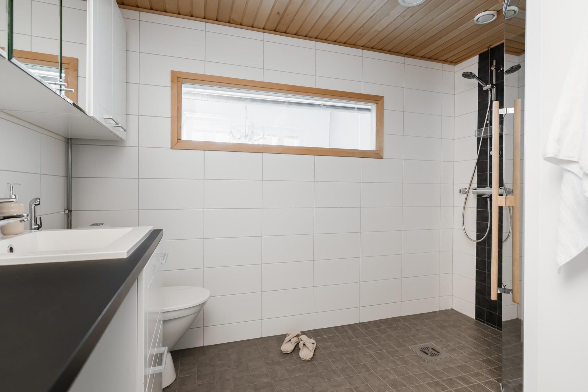 - Sauna (Harvia), sähkökiuas, kylpyhuone, suihku, peilikaappi, allaskaappi, pesukoneliitäntä, lattialämmitys (vesikiertoinen).