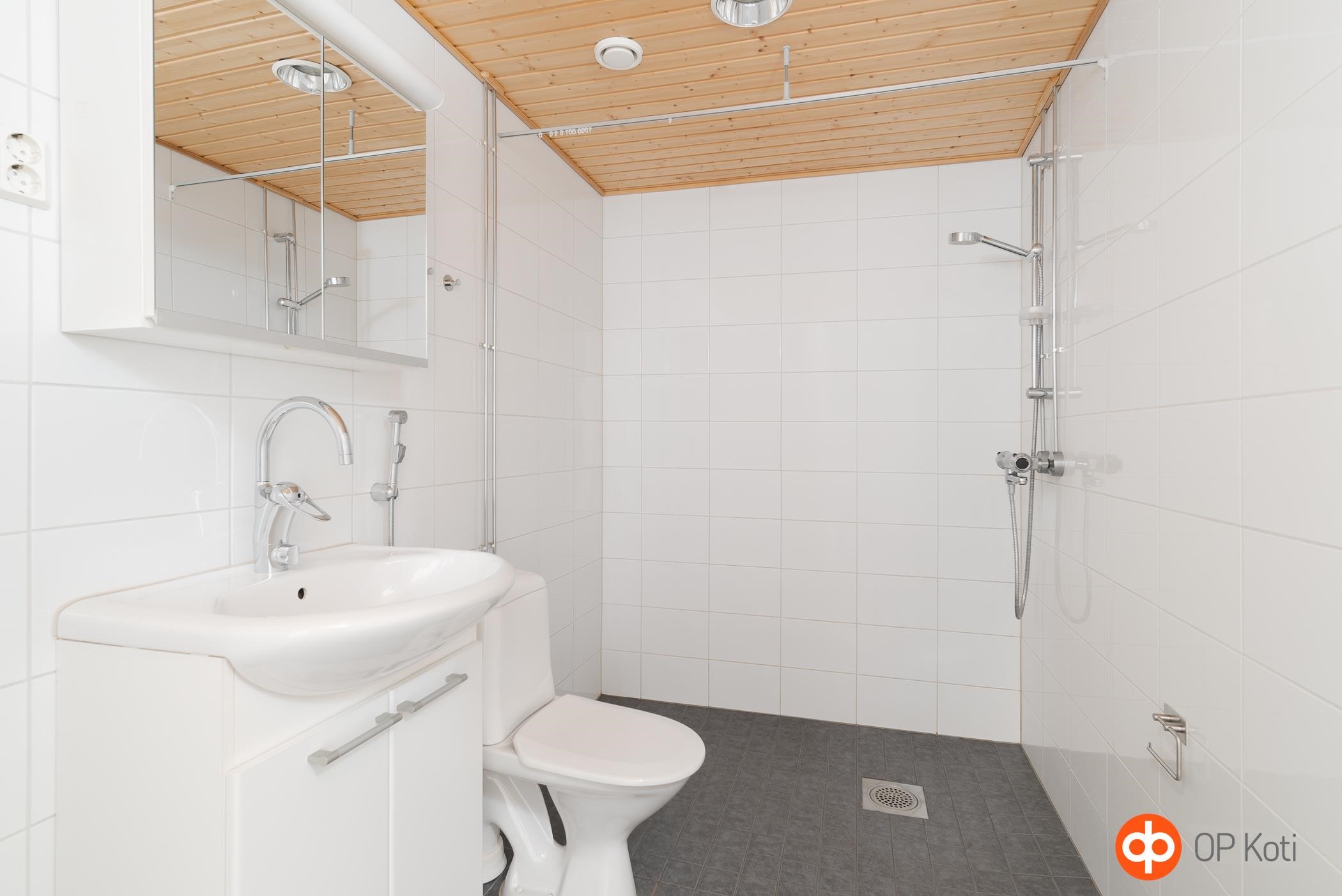 - Kylpyhuone, suihku, peilit, allaskaappi, pesukoneliitäntä, lattialämmitys, kiinteät valaisimet.