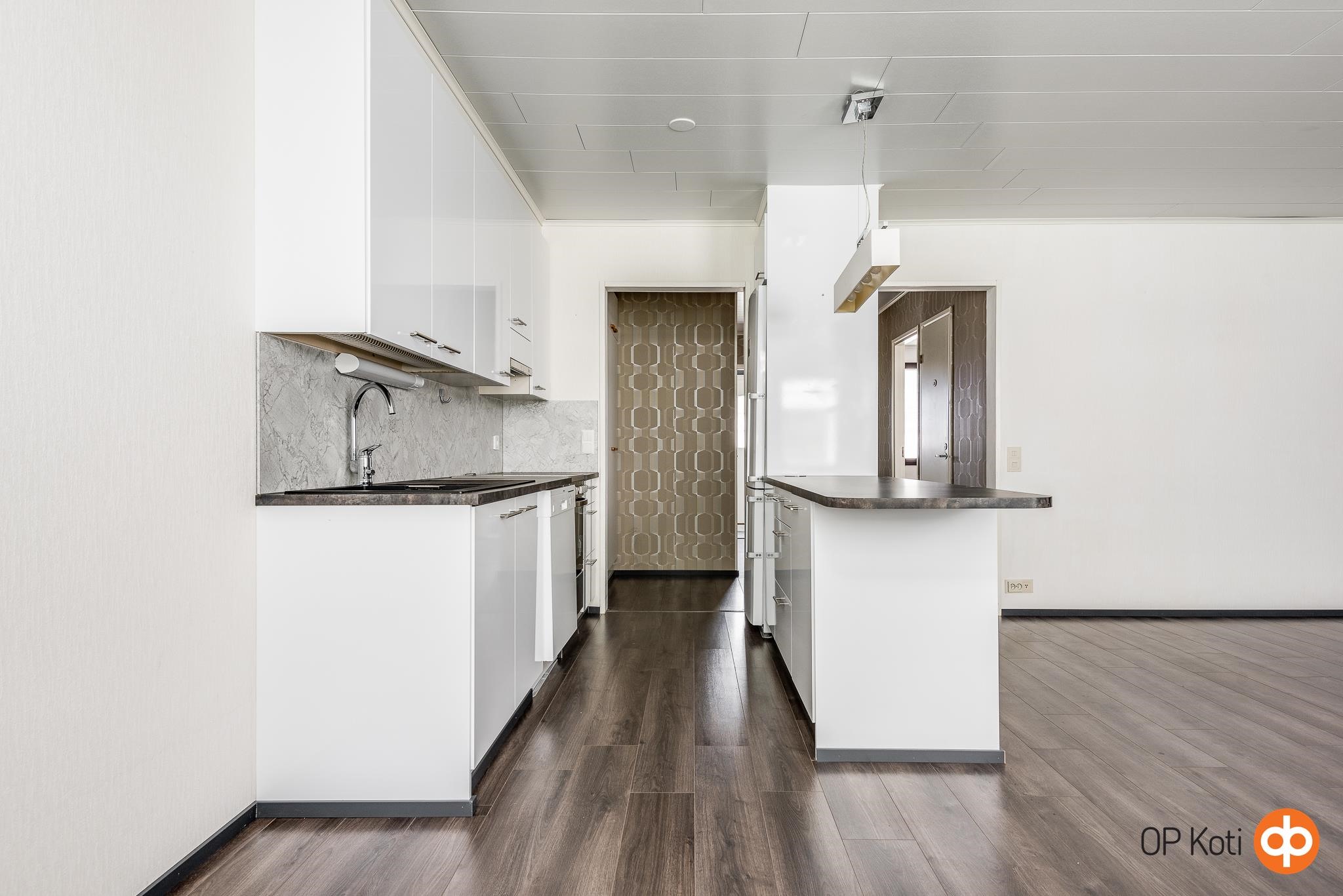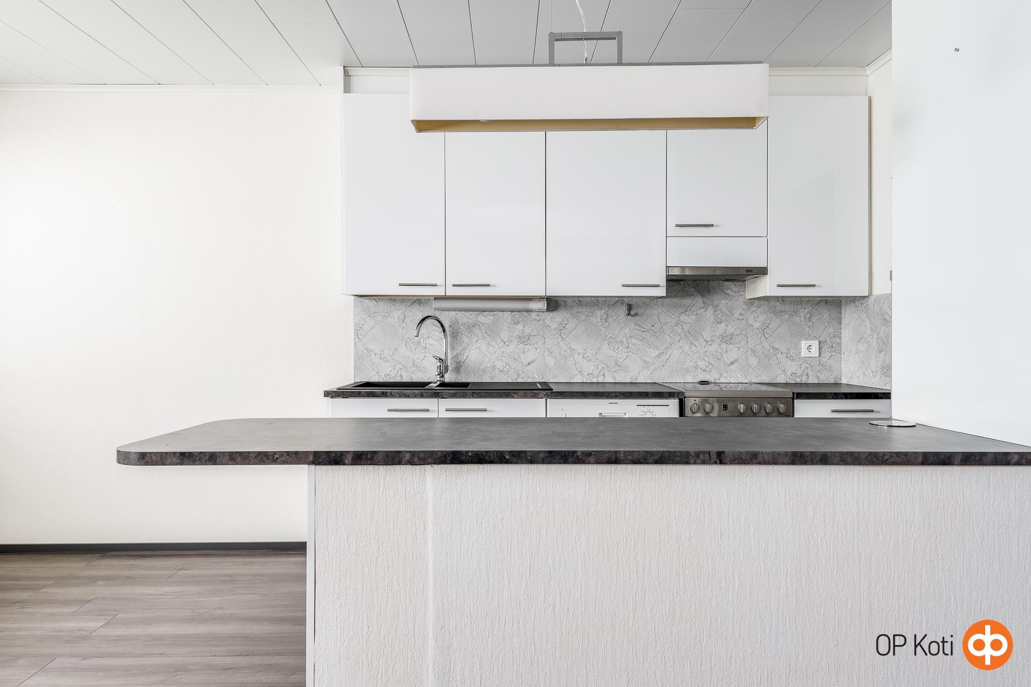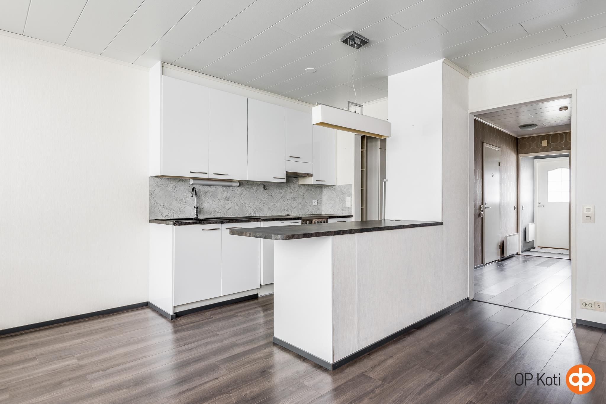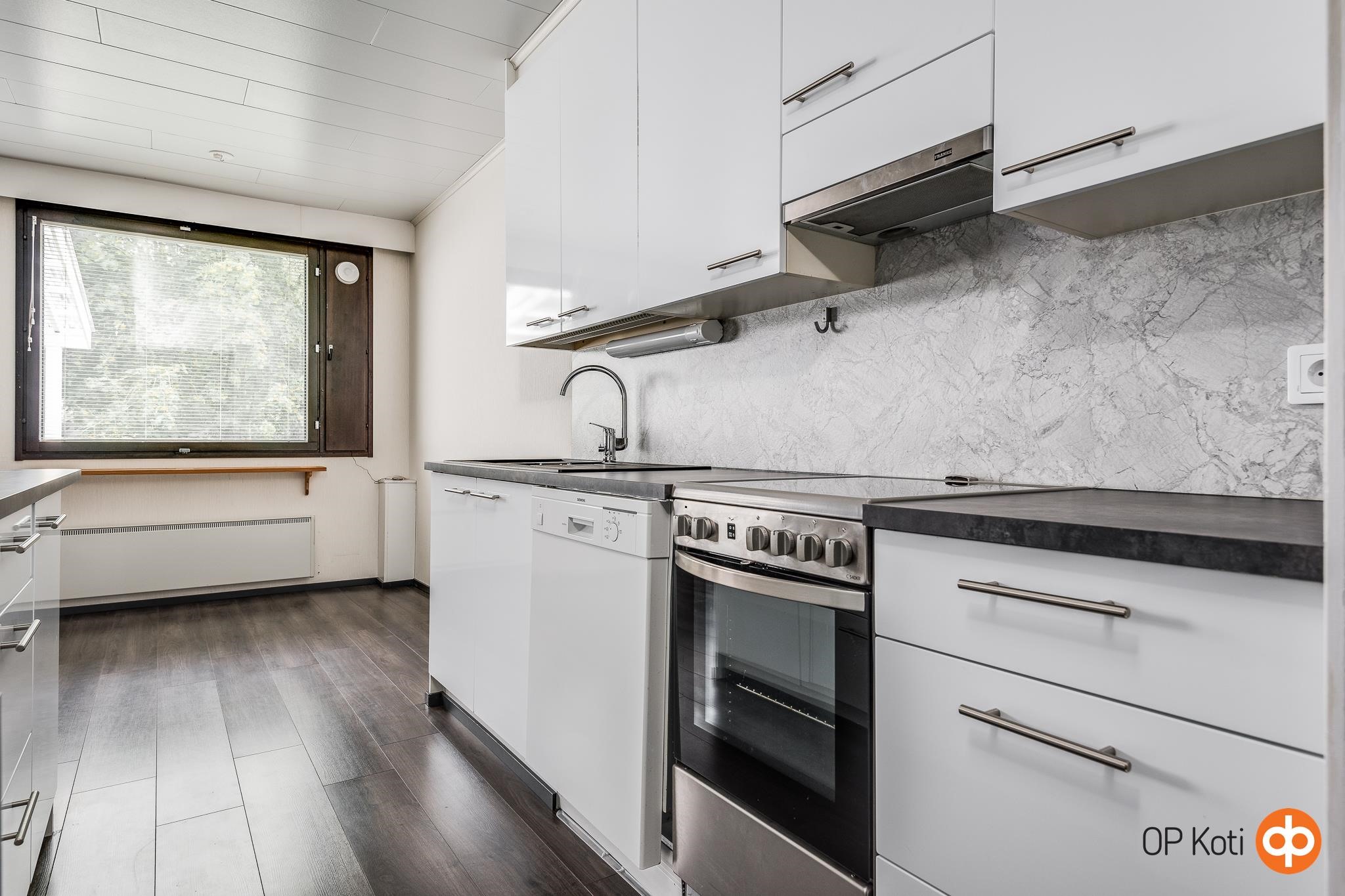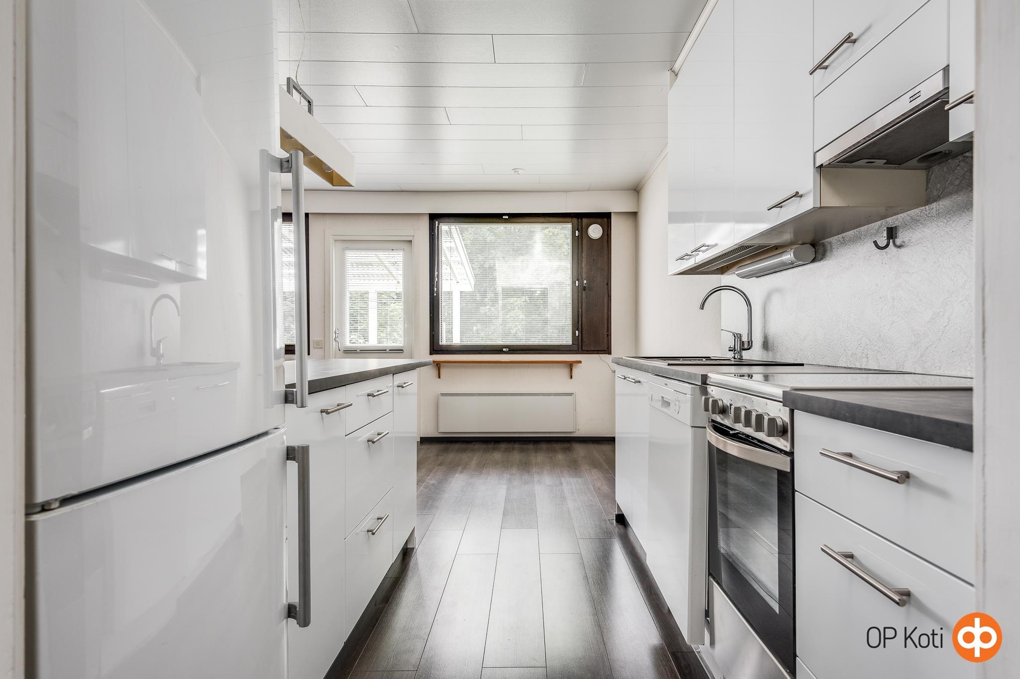 - Jääkaappipakastin, erillisuuni (uusittu 2017), liesitaso (induktiotaso, uusittu 2017), liesituuletin (uusittu 2017), astianpesukone (uusittu 2017), kaapistot (valkoiset Kiilto-ovet), kiinteät valaisimet. Keittiön kaapistojen ovet on uusittu 2017 (Elegia-keittiö), runkoja ei ole uusittu. Keittiössä saareke kaappitiloineen ja tämä asennettu 2017. Keittiön työtasot uusittu 2017 ja samalla asennettu komposiittiallas