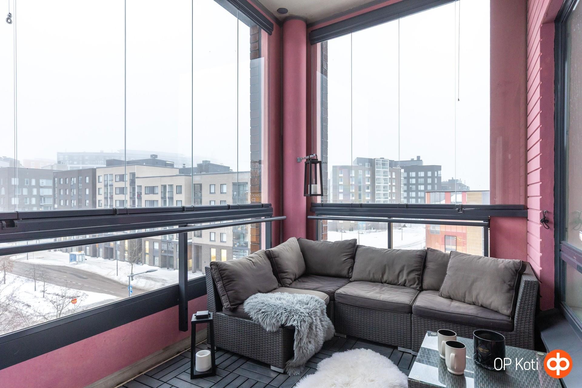 - Tilava kulmaparveke, josta näkymä Kivistön sydämeen.