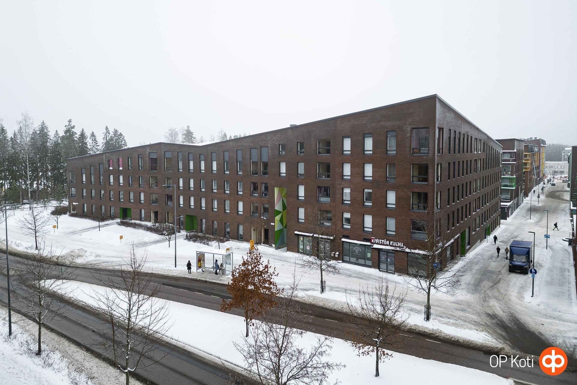 Palvelut: Lähipalvelut: Citymarket n. 400 m, kauppakeskus Kivis 500 m Lähikaupat (Alepa, K-Market 200-300 m), Citymarket n. 400 m, apteekki n. 400 m, kauppakeskus Kivis 500 m (mm. S-market, Lidl, kirjasto, terveysasema, posti, ravintolat). Koulut: Aurinkokiven koulu 300m (1.-9. lk, turvallinen koulumatka, ei tarvitse ylittää isoja teitä). Neuvola Aurinkokiven koululla. Päiväkoti: Alueella useita päiväkoteja. Pilke Hohto 240 m, Norlandia Kaarna 300 m, Touhula Jalokivi 300 m, Ruusupuun päiväkoti 650 m. Taloyhtiössä on pyörävarasto, lastenvaunuvarasto, kuivaushuone, kerhotila, varattava sauna, saunalounge ja kuntosali. Omassa pihassa on pieni leikkialue ja grilli. Lähistöllä on useita leikkipuistoja ja pallokenttiä. Muskari- ja liikuntaharrastuksia tarjolla lapsille ja aikuisille lähikouluilla. Neuvola Aurinkokiven koululla. Kivistön kirjastossa erinomainen lastenosasto ja puuhanurkkaus. Loistavat pyöräilyreitit ja ladut lähtevät talon takaa kävelytieltä. Liikenneyhteydet: Bussipysäkki talon vieressä ja toinen Helsingin suuntaan parin korttelin päässä. Kivistön juna-asemalta pääsee päärautatieasemalle alle puolessa tunnissa.