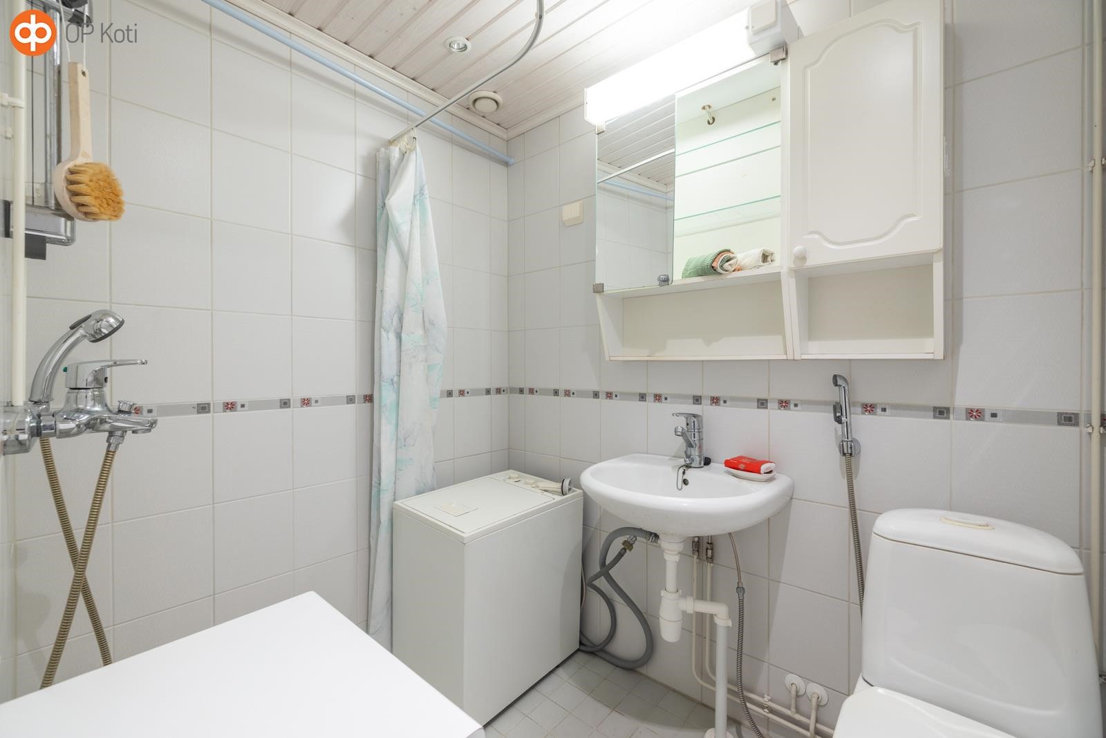 - Kylpyhuone, suihku, peilikaappi, allaskaappi, pesukoneliitäntä, kiinteät valaisimet.