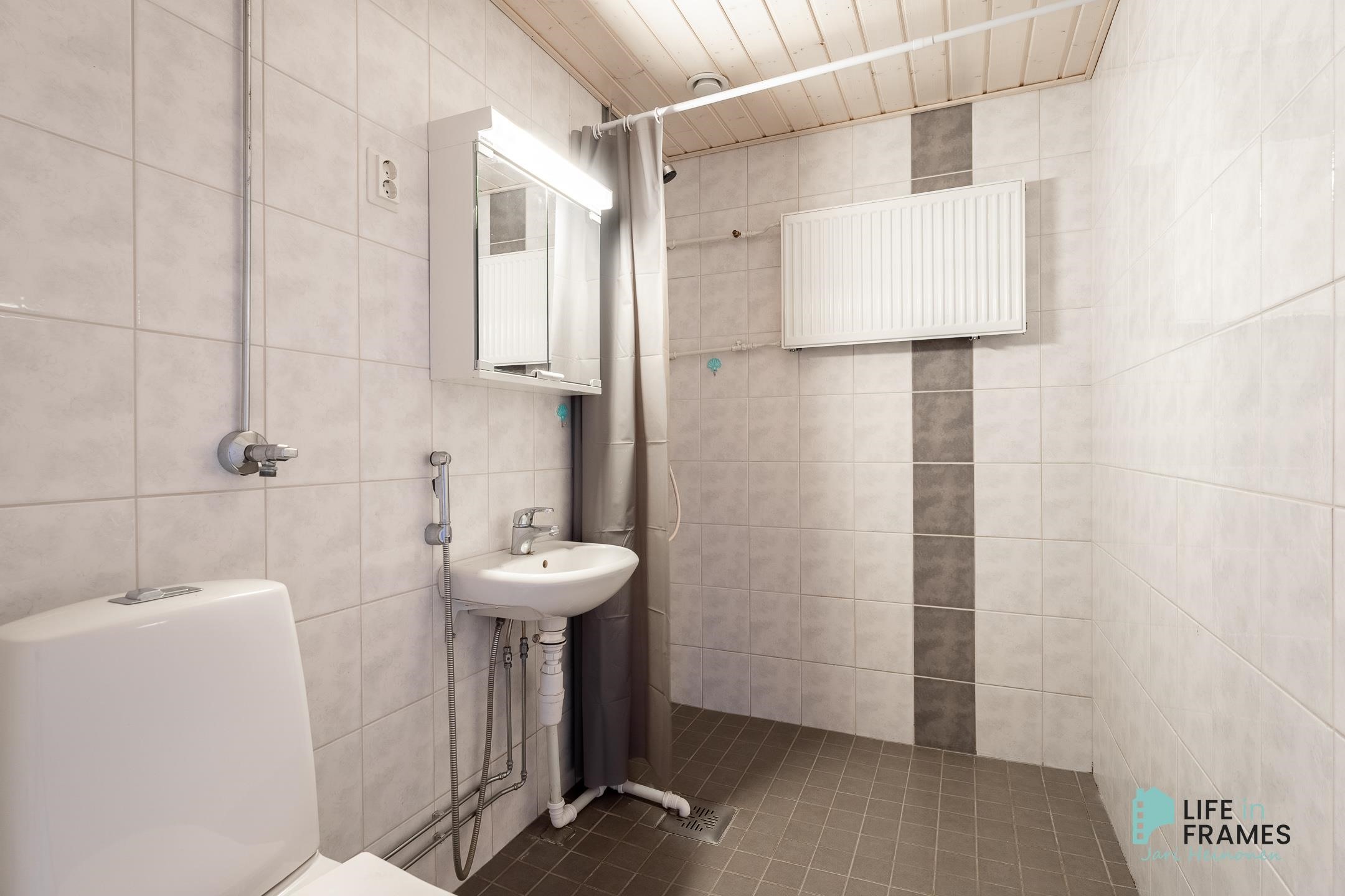 - Suihku, peilikaappi, pesukoneliitäntä, kiinteät valaisimet.