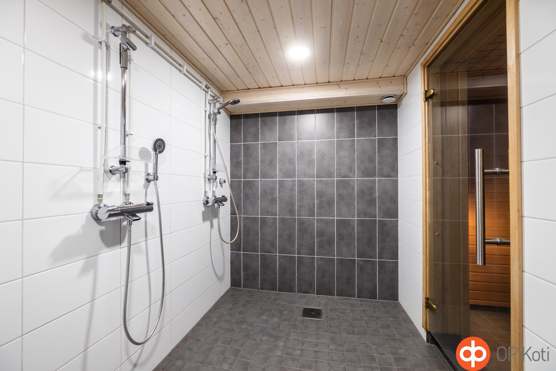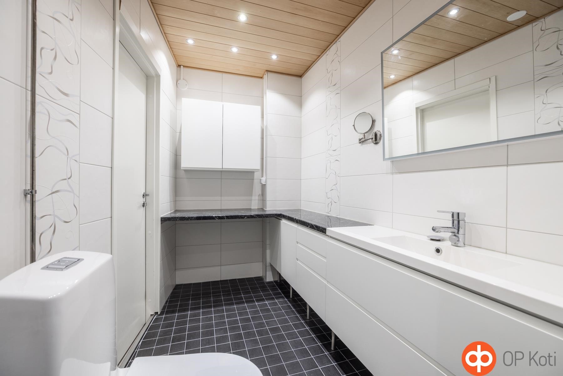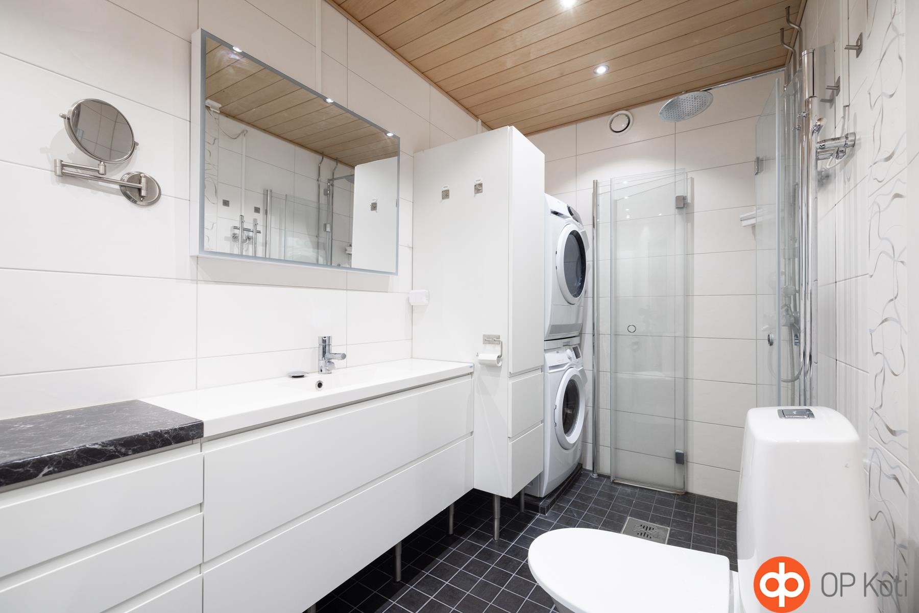 - Suihku, suihkuseinä, peilit, kaapit, allaskaappi, pesukoneliitäntä, lattialämmitys, kiinteät valaisimet, . Pyyhekuivain