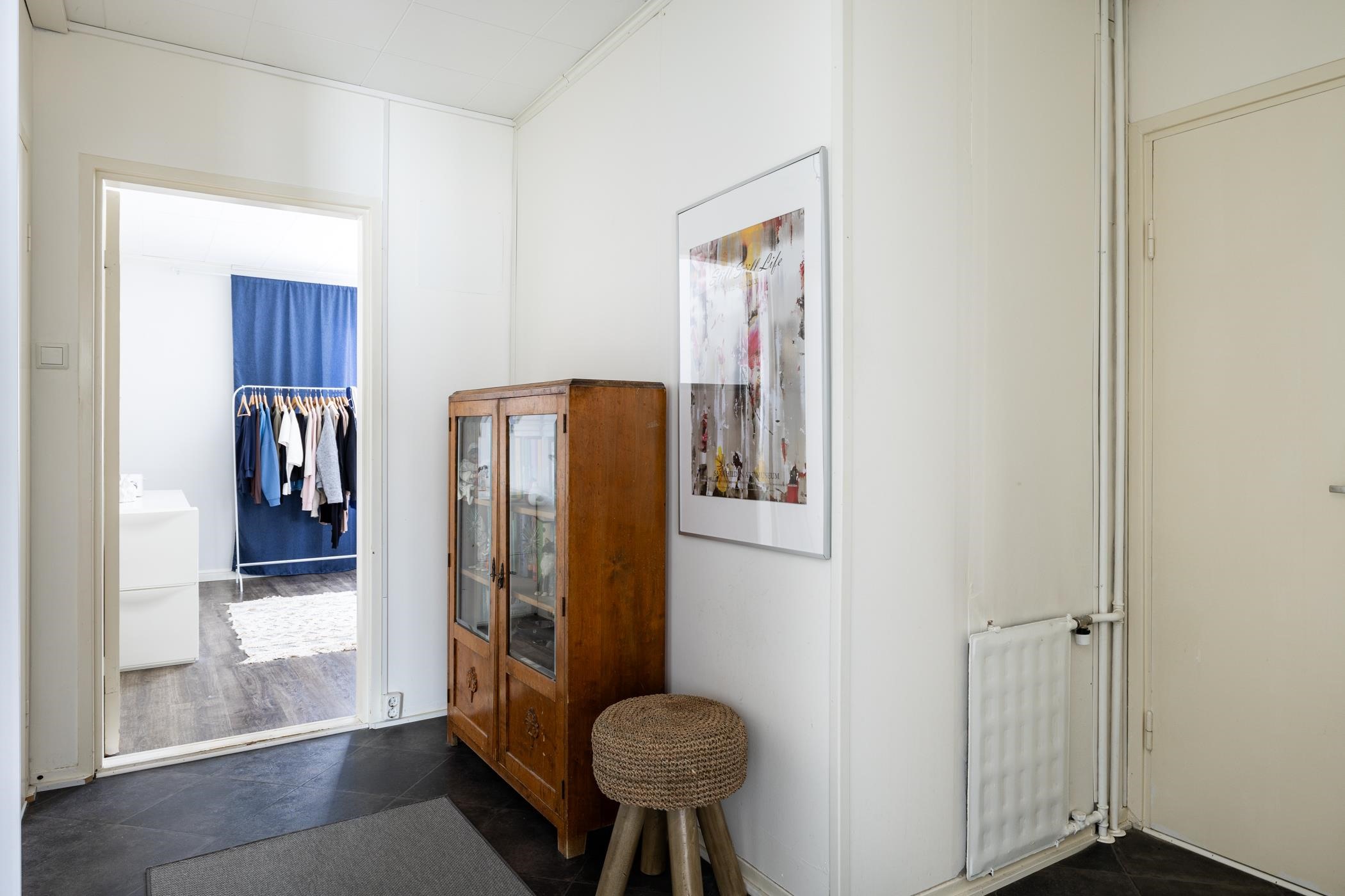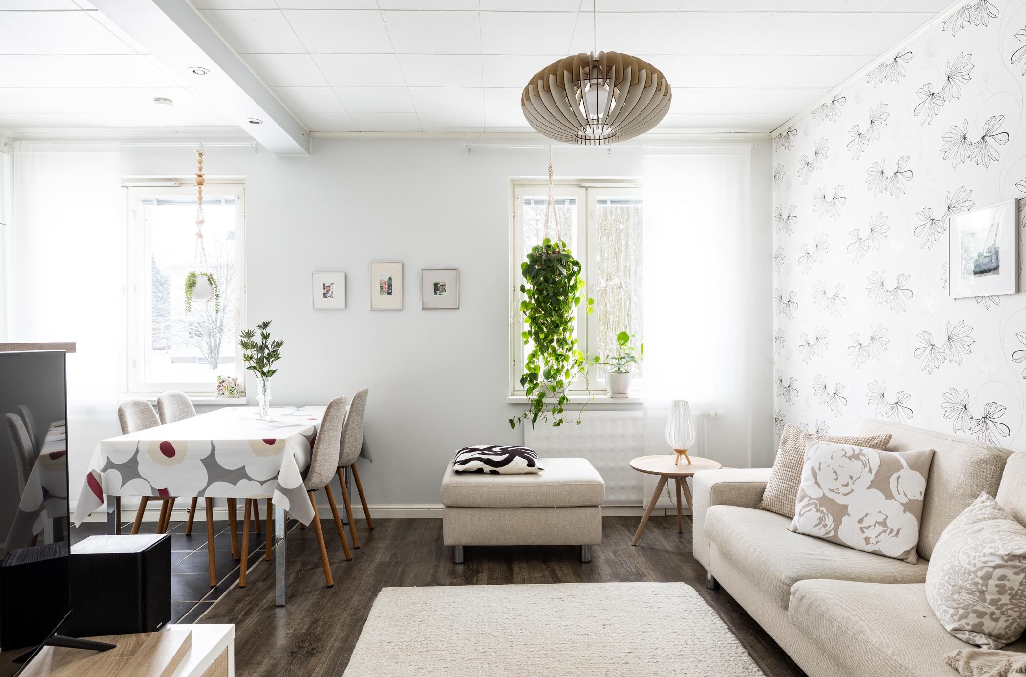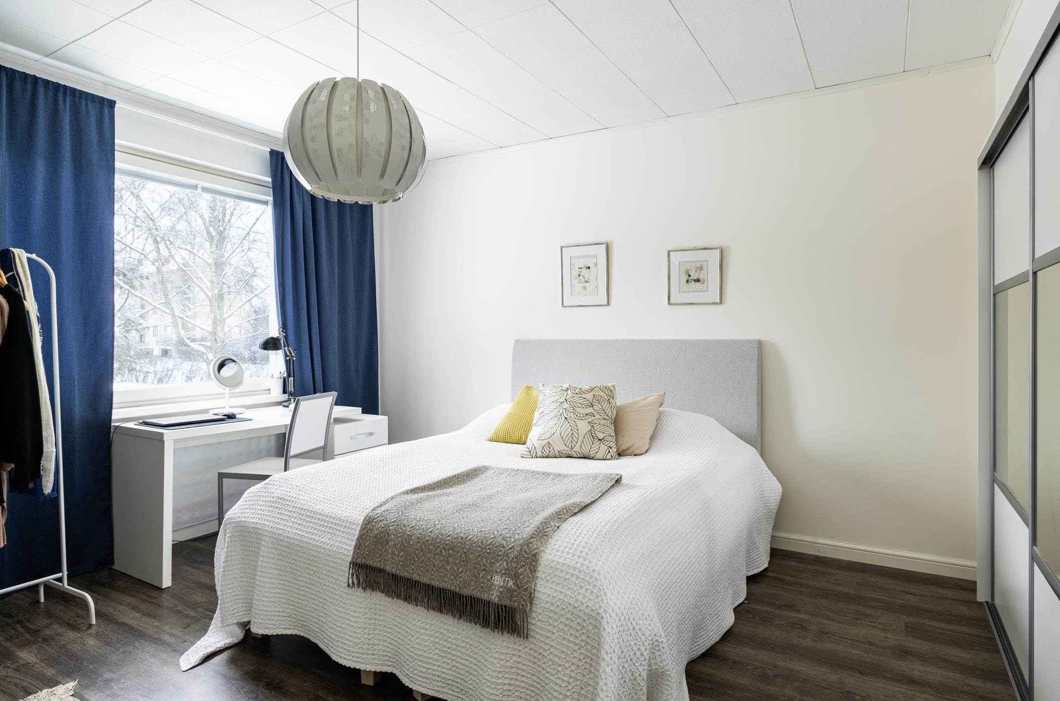 Keittiö: laatta, maali. Olohuone: laminaatti, maali/tapetti. Makuuhuone 1: laminaatti, maali. Kylpyhuone: laatta, laatta.