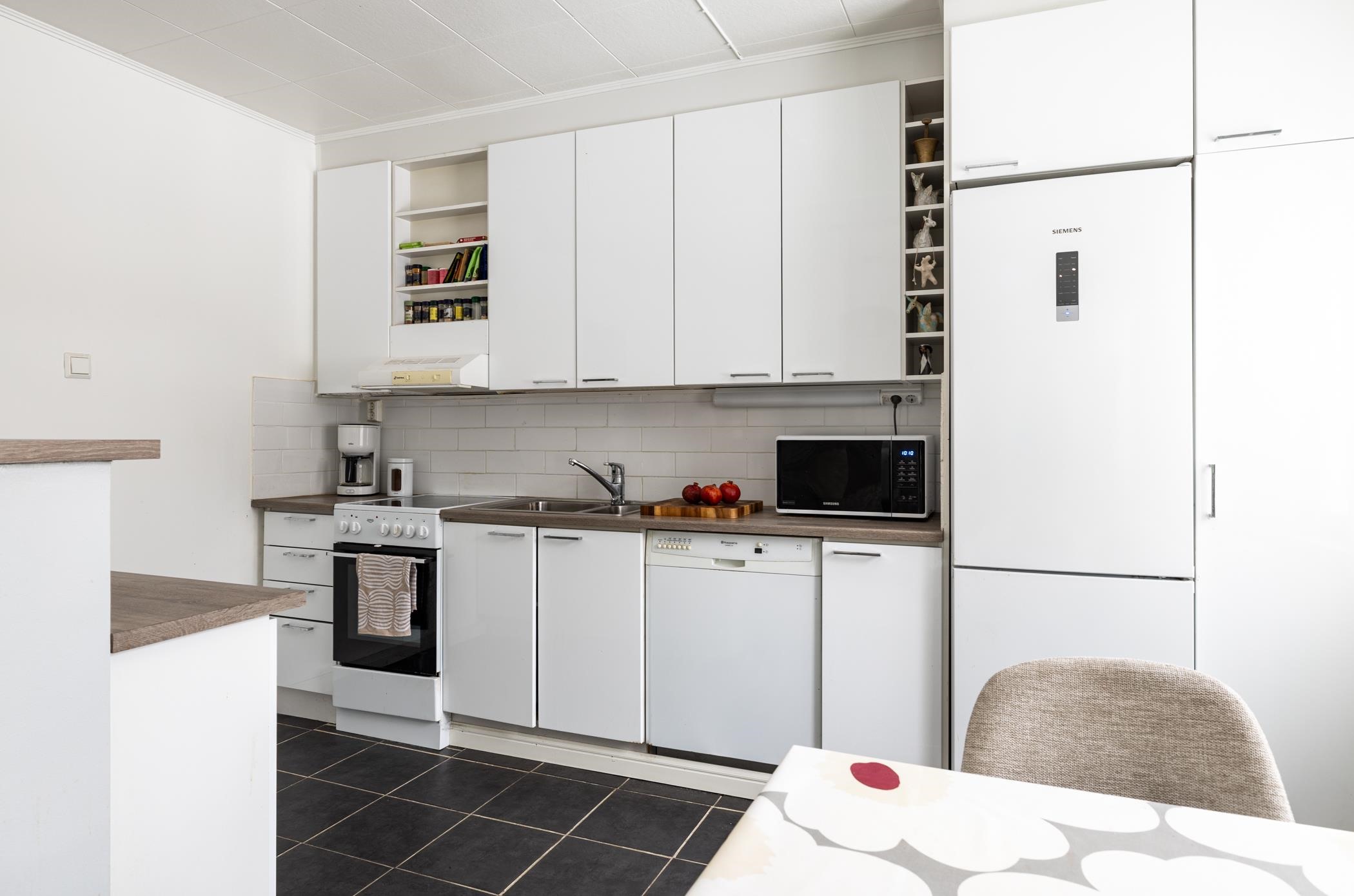 - Jääkaappipakastin v.2018, keraaminen liesi v.2018, liesituuletin, astianpesukone, kaapistot, kiinteät valaisimet.