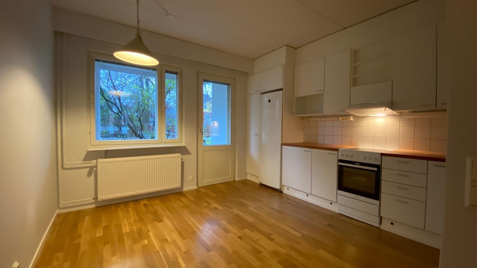 - Jääkaappi, keraaminen liesi, liesituuletin, astianpesukone, kaapistot, kiinteät valaisimet.