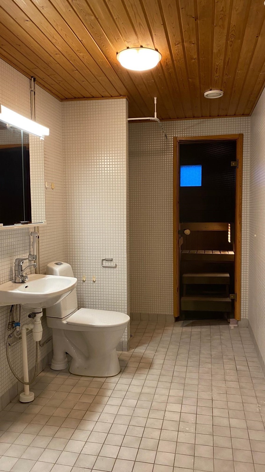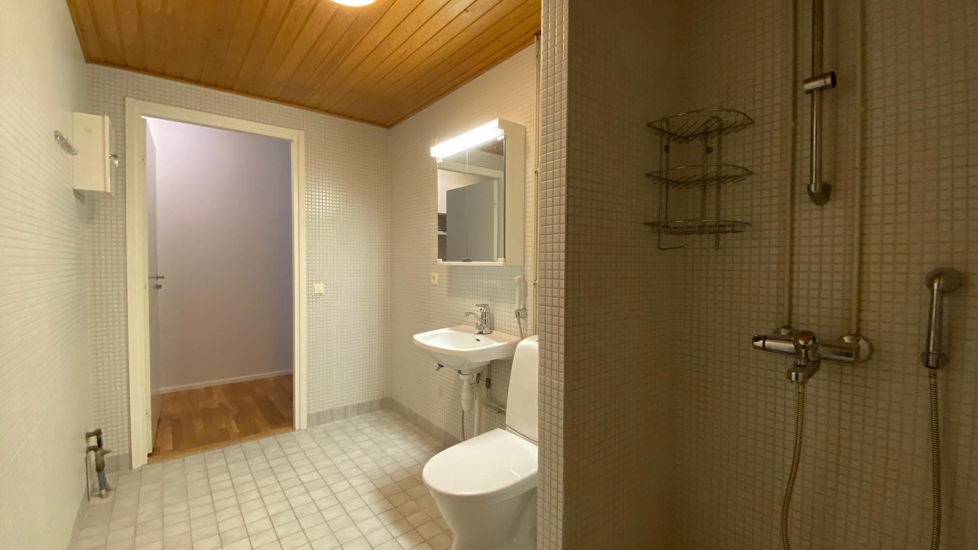 - Sauna, kylpyhuone, suihku, suihkuseinä, peilikaappi, pesukoneliitäntä, lattialämmitys, kiinteät valaisimet.