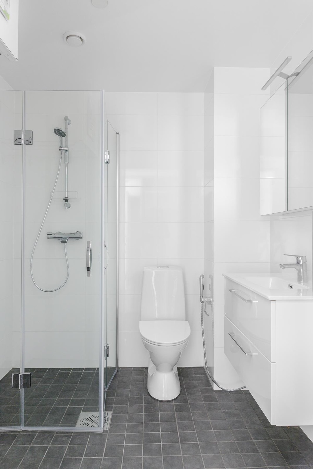 - Kylpyhuoneen varusteet: Valkoiset Olive- kaapistot, Oras Oras Optima suihkusetti, suihkuseinä, valaistu peilikaappi, allaskaappi integroidulla altaalla, Oras Vega Bidetta -bidesuihku, Oras Vega ekonappihana, pesukoneliitäntä omalla poistoputkella Oras/Faluplast. Wc -istuin IDO Seven D/Glow. Osassa huoneistoissa on seinään integroitu wc- istuin. Sähkötoiminen lattialämmitys.