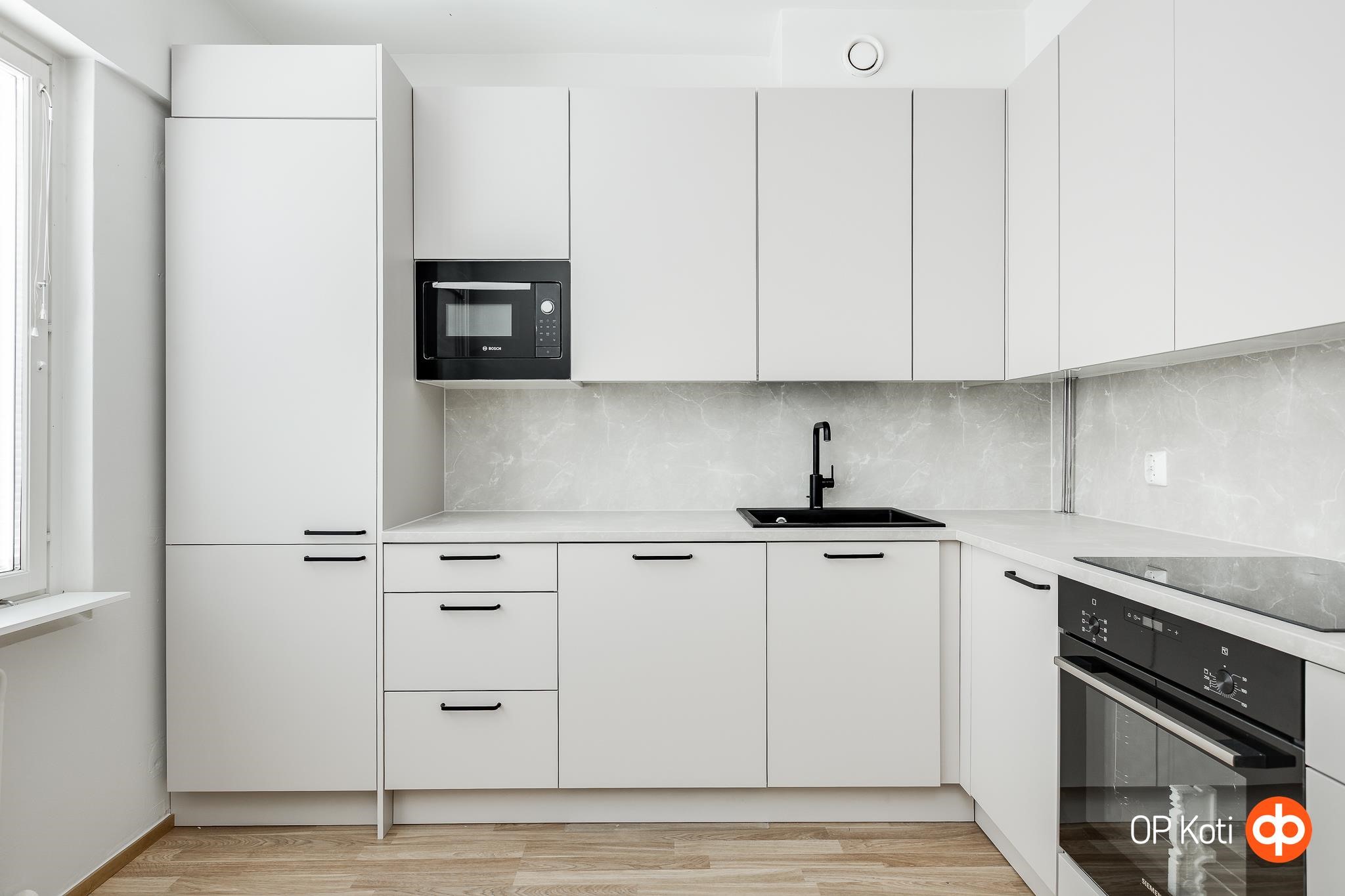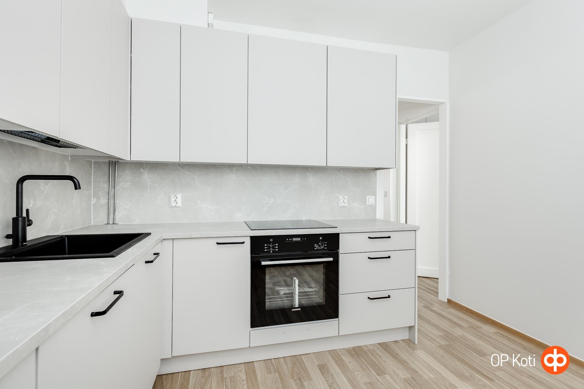 - Jääkaappipakastin, erillisuuni, liesitaso, induktioliesi, liesituuletin, astianpesukone, kaapistot, kiinteät valaisimet.