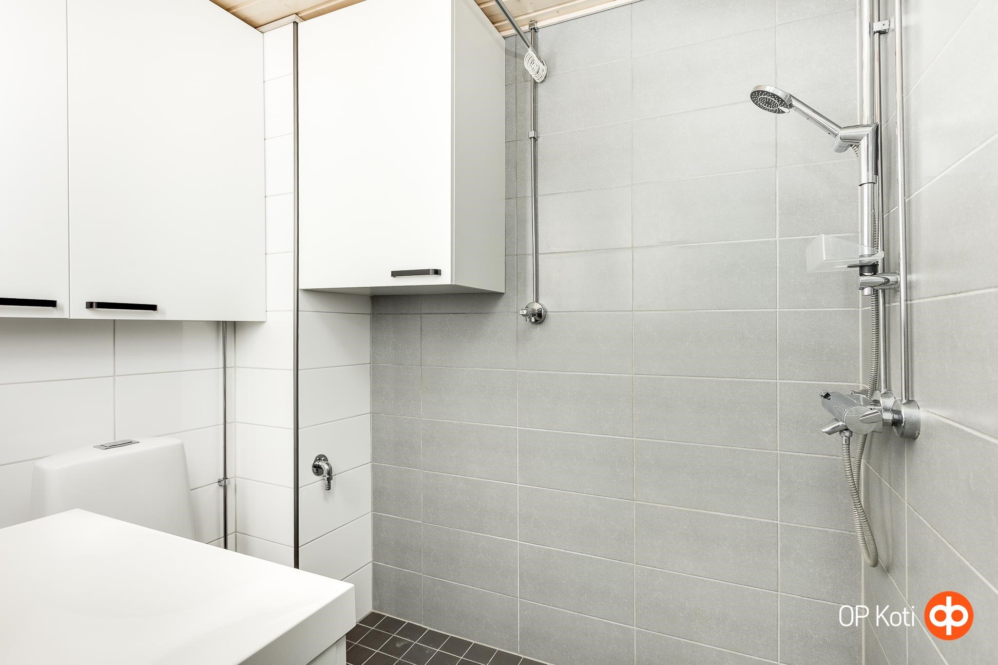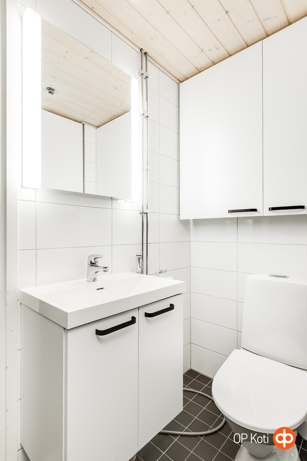 - Kylpyhuone, suihku, peilit, kaapit, allaskaappi, pesukoneliitäntä, kiinteät valaisimet.