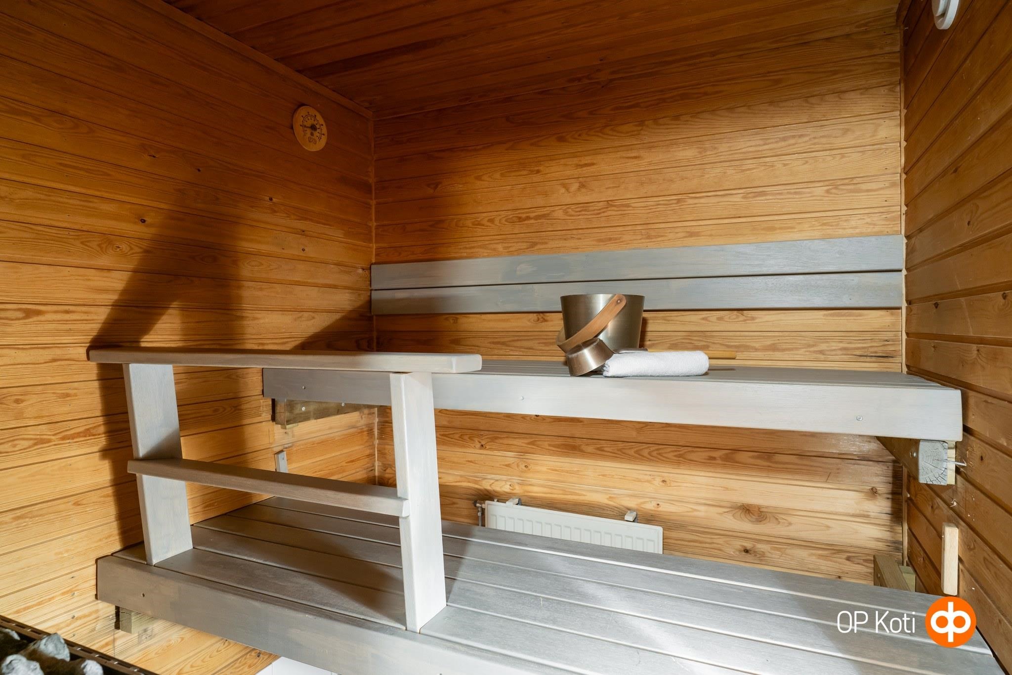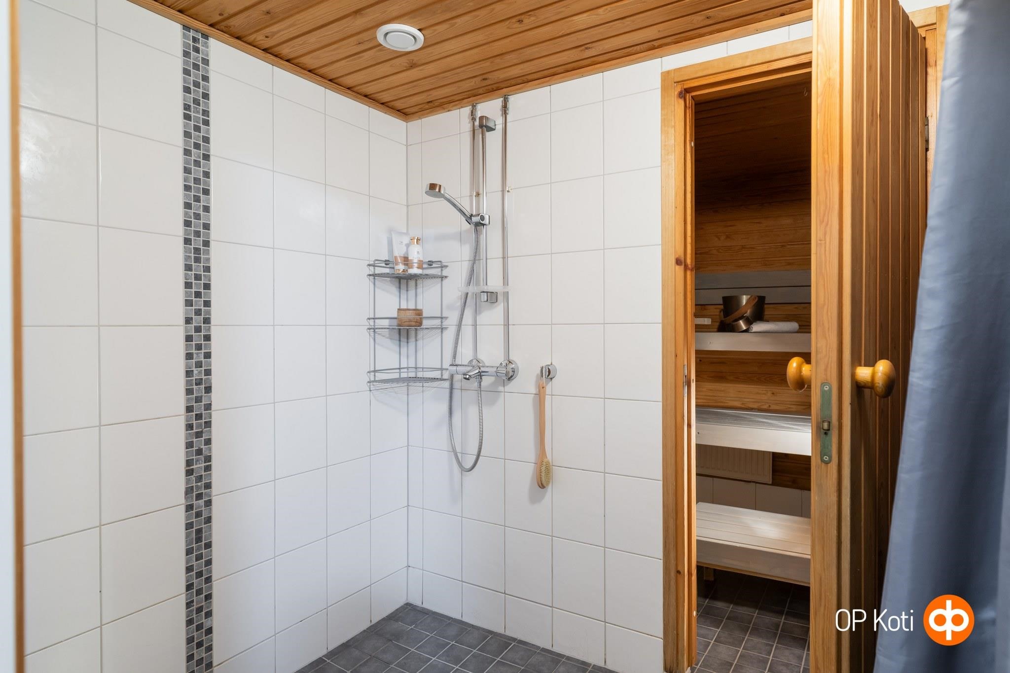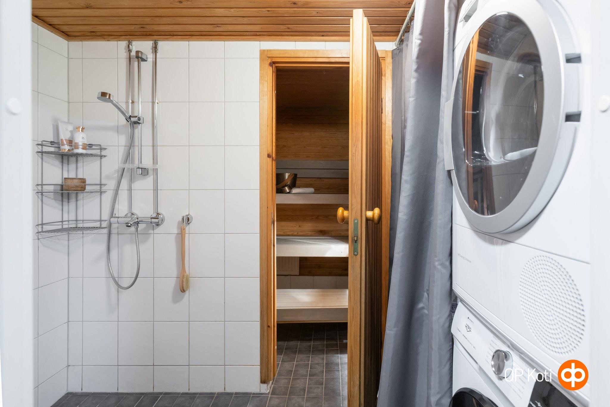 - Sauna, sähkökiuas, kylpyhuone, erillinen wc, suihku, peilikaappi, pesukoneliitäntä alakerran kh:ssa sekä yläkerran wc:ssä, lattialämmitys kosteissa tiloissa, kiinteät valaisimet. Kylpyhuone remontoitu edellisen asukkaan toimesta v. 2006. Yläkerran wc:ssä on tila tehdä kodinhoitohuone tai suihkutila, suihkulle on paikkansa.