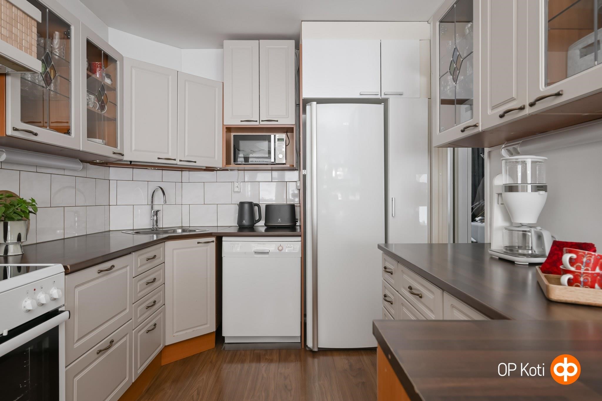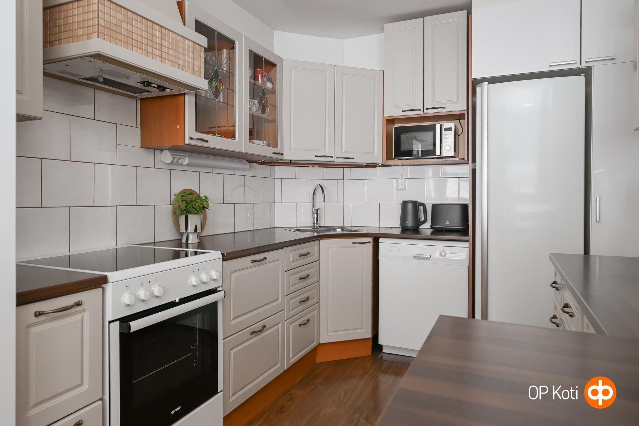 - Jääkaappi, pakastekaappi, erillisuuni, liesitaso, keraaminen liesi, liesituuletin, astianpesukone, kaapistot, kiinteät valaisimet. Keittiö remontoitu v. 2011. Siisti edelleenkin.