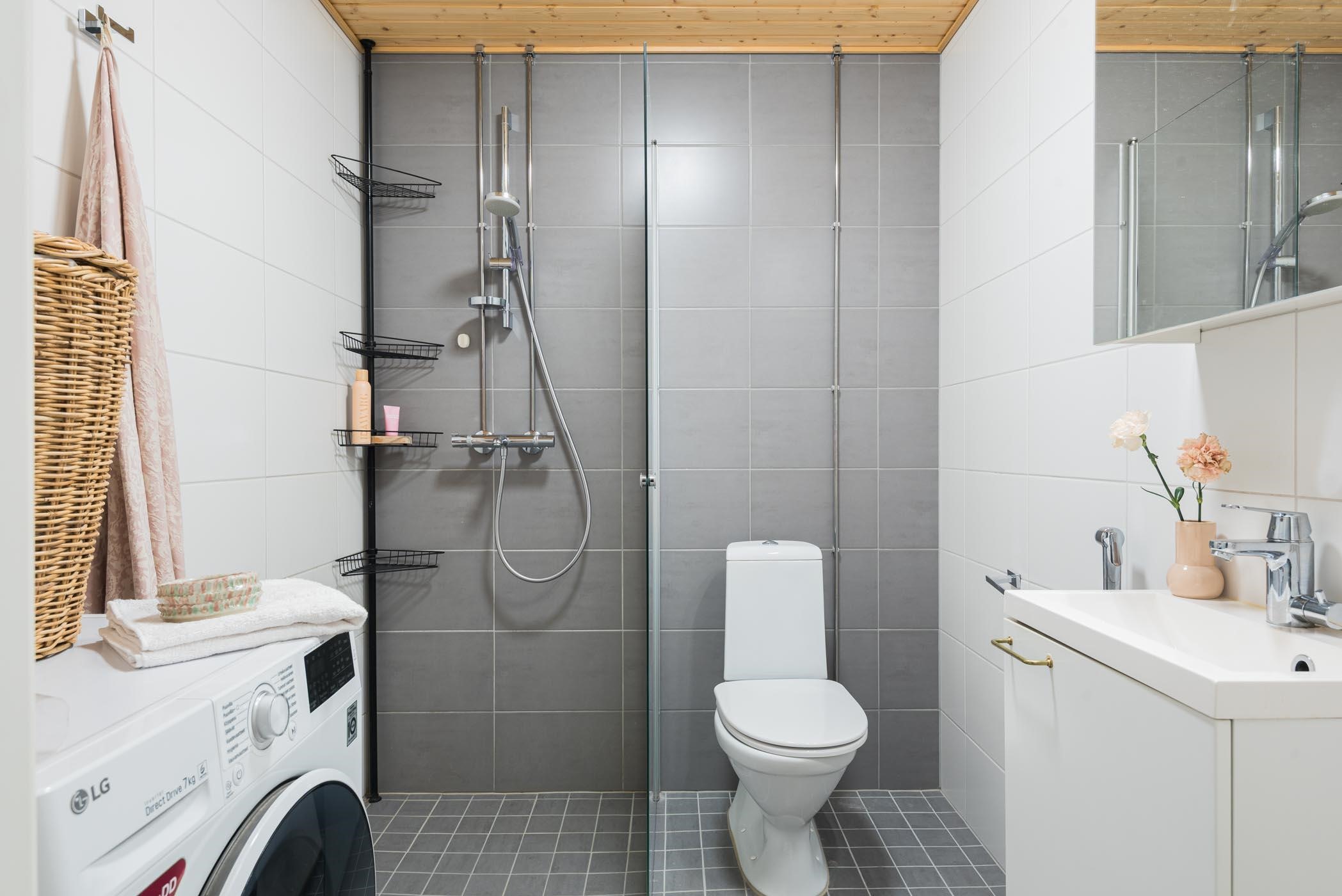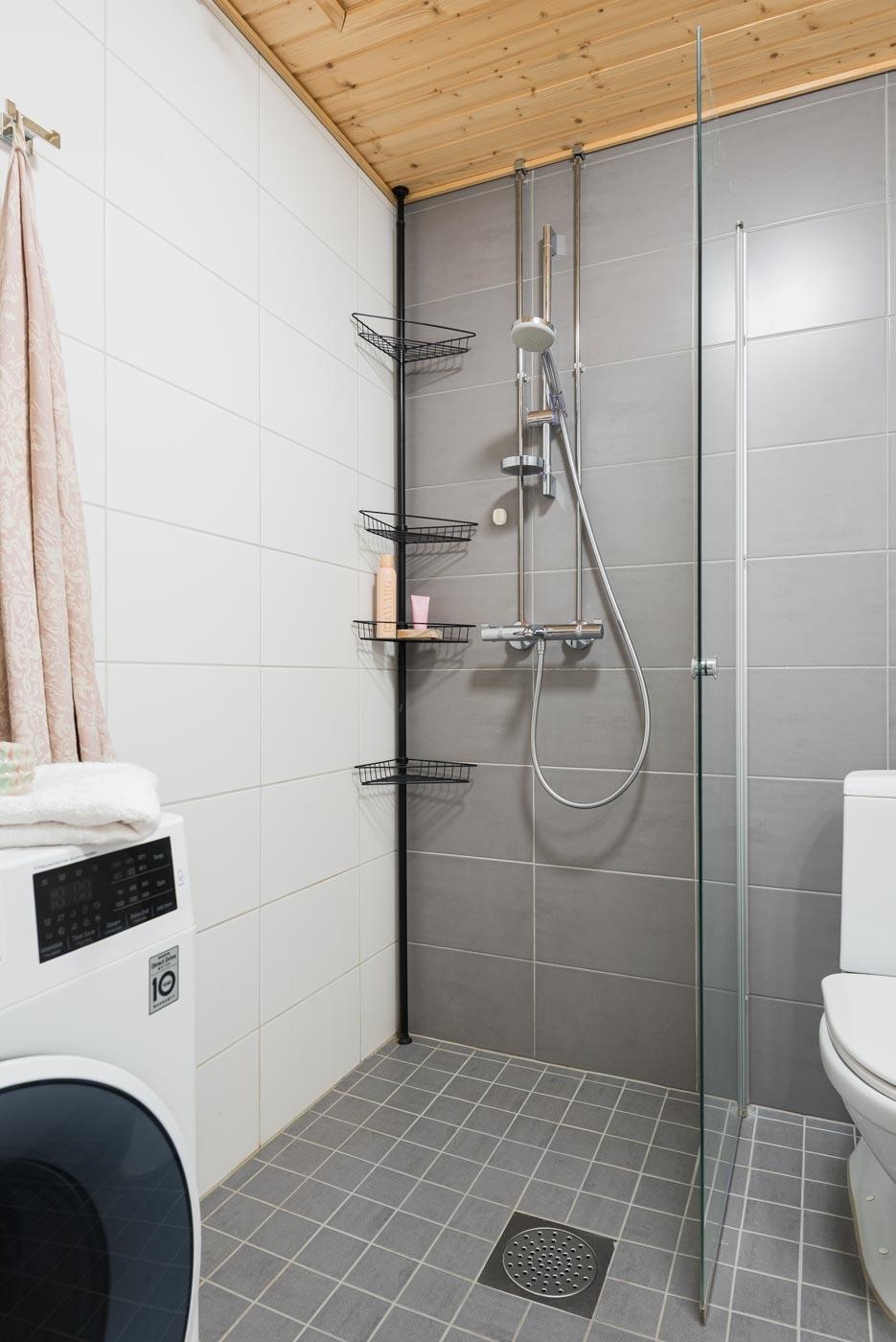 - Kylpyhuone suihkuseinä, peili- ja allaskaappi, pesukoneliitäntä, lattialämmitys, kiinteät valaisimet.