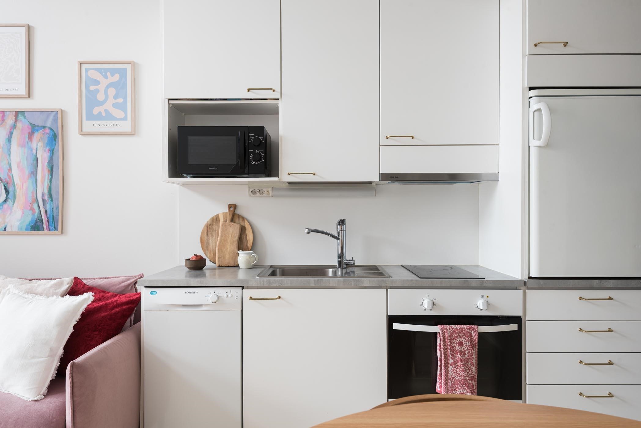 - Keittiössä jääkaappi, erillisuuni, liesitaso keraaminen, liesituuletin, astianpesukone, kaapistot, kiinteät valaisimet.