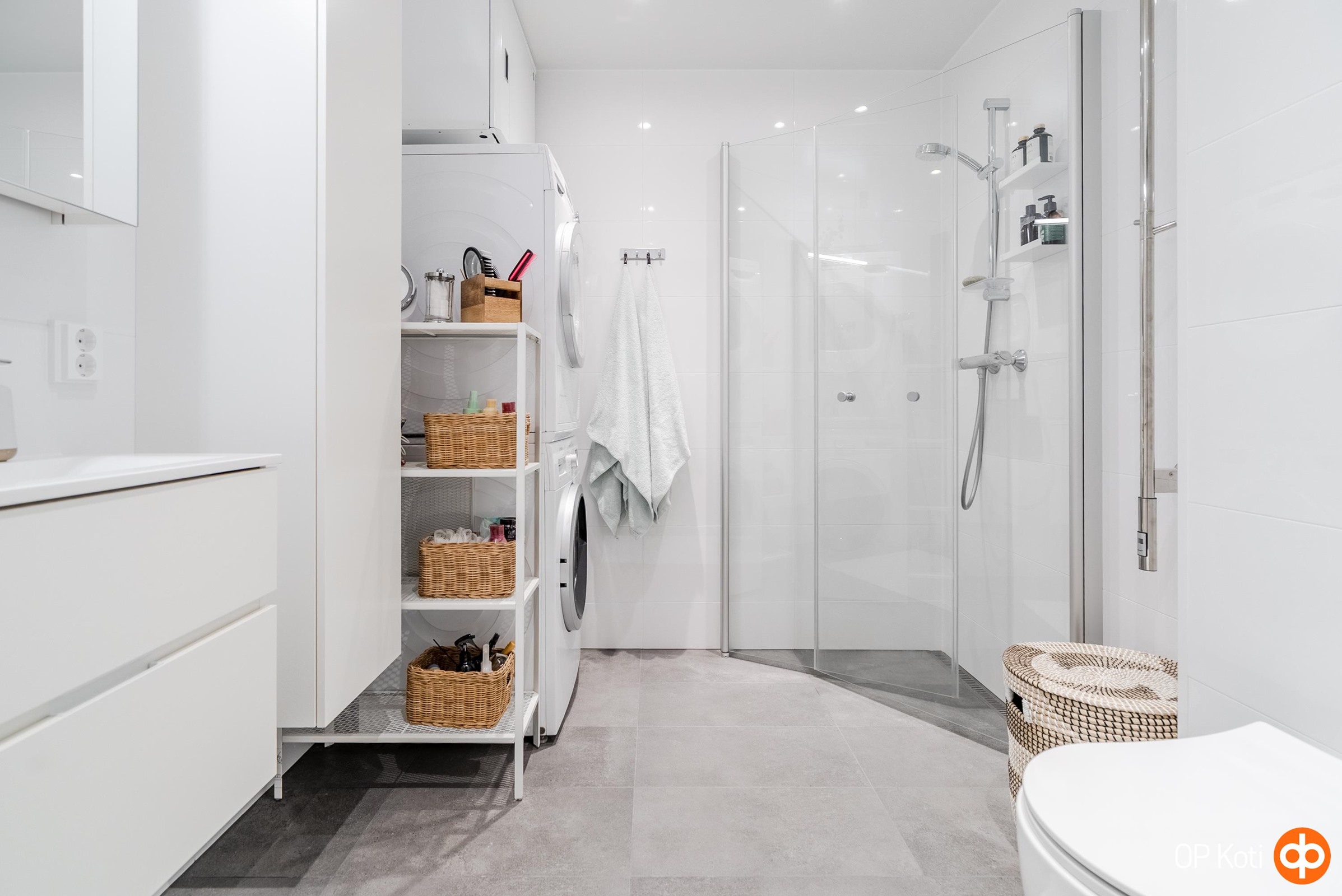 - Kylpyhuone, suihku, suihkuseinä, peilikaappi, kaapit, allaskaappi, pesukoneliitäntä, lattialämmitys sähköinen lattialämmitys, kiinteät valaisimet. pyyhekuivain sähköinen, seinäwc