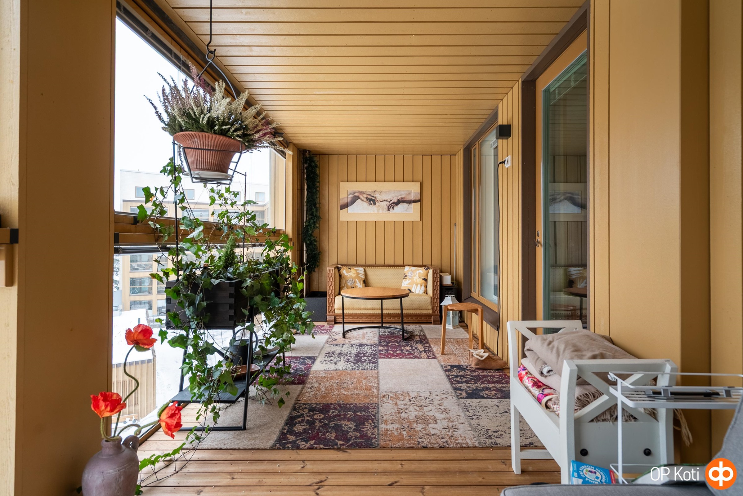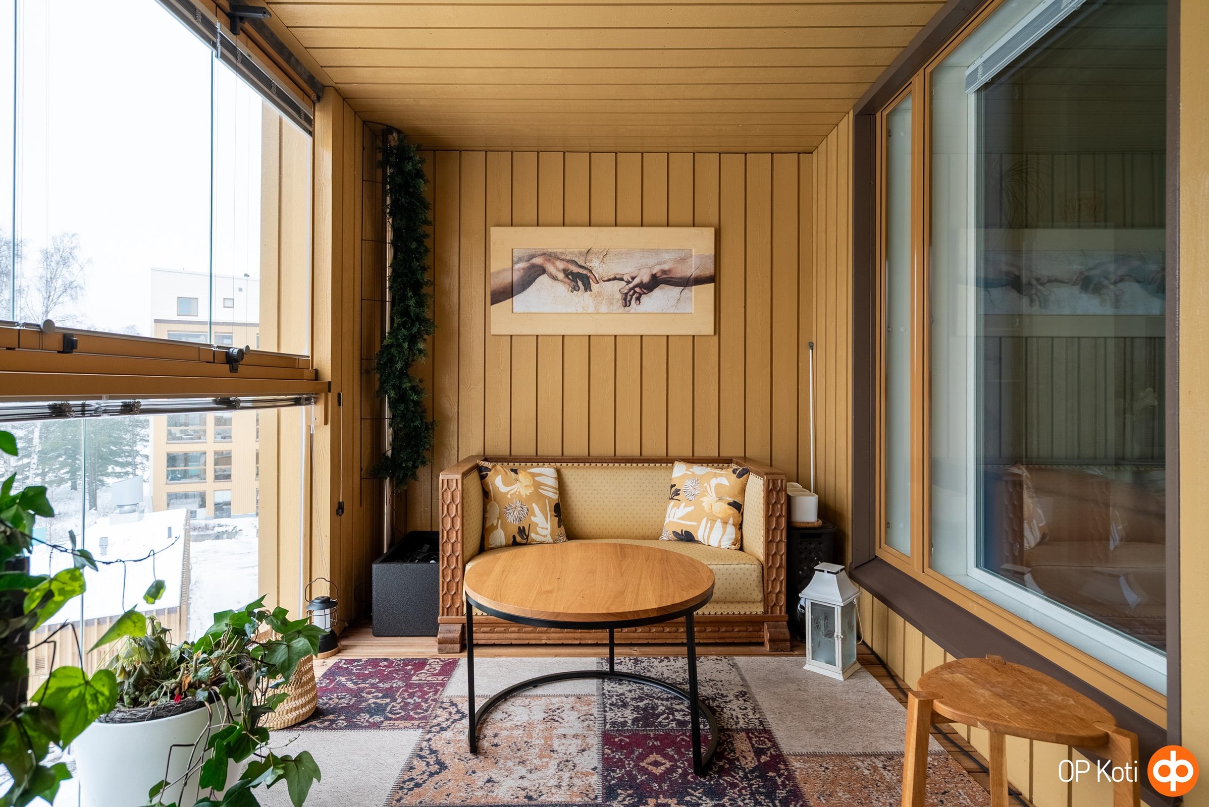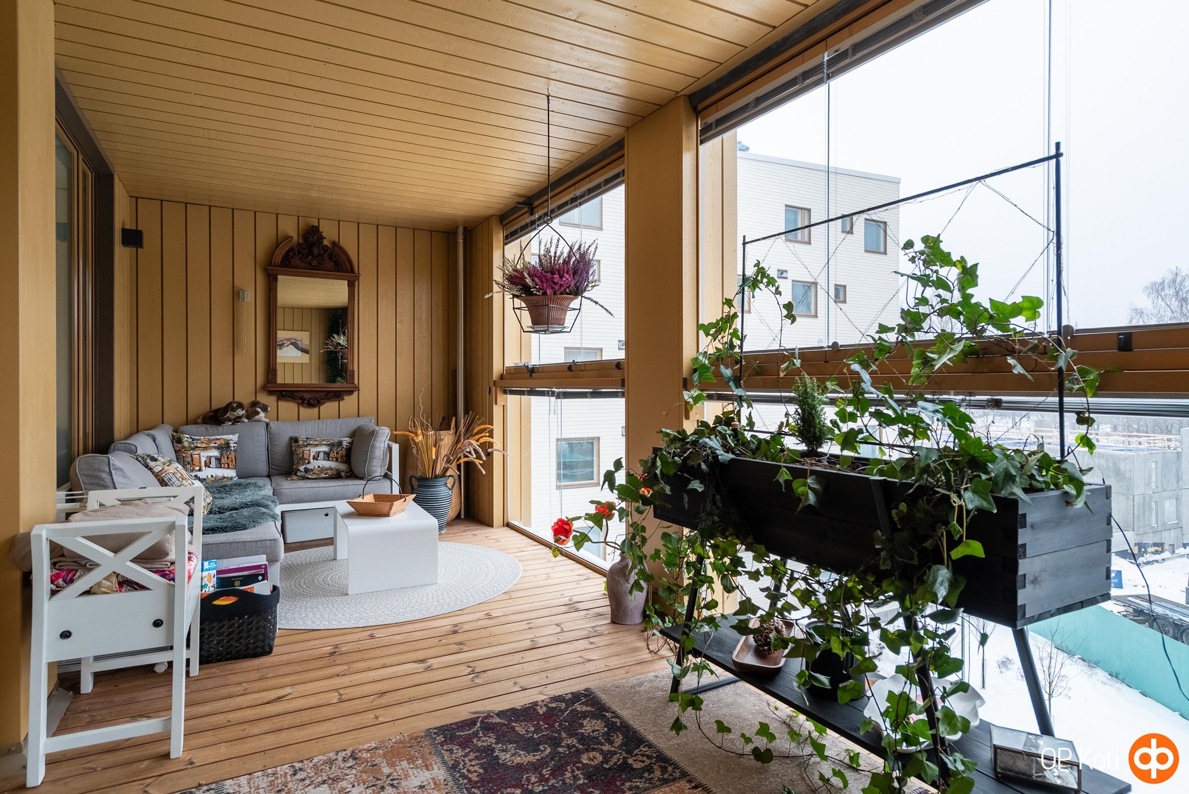 - Kaikki ikkunat länteen. Leveä, noin 15 m2 lasitettu länsiparveke.