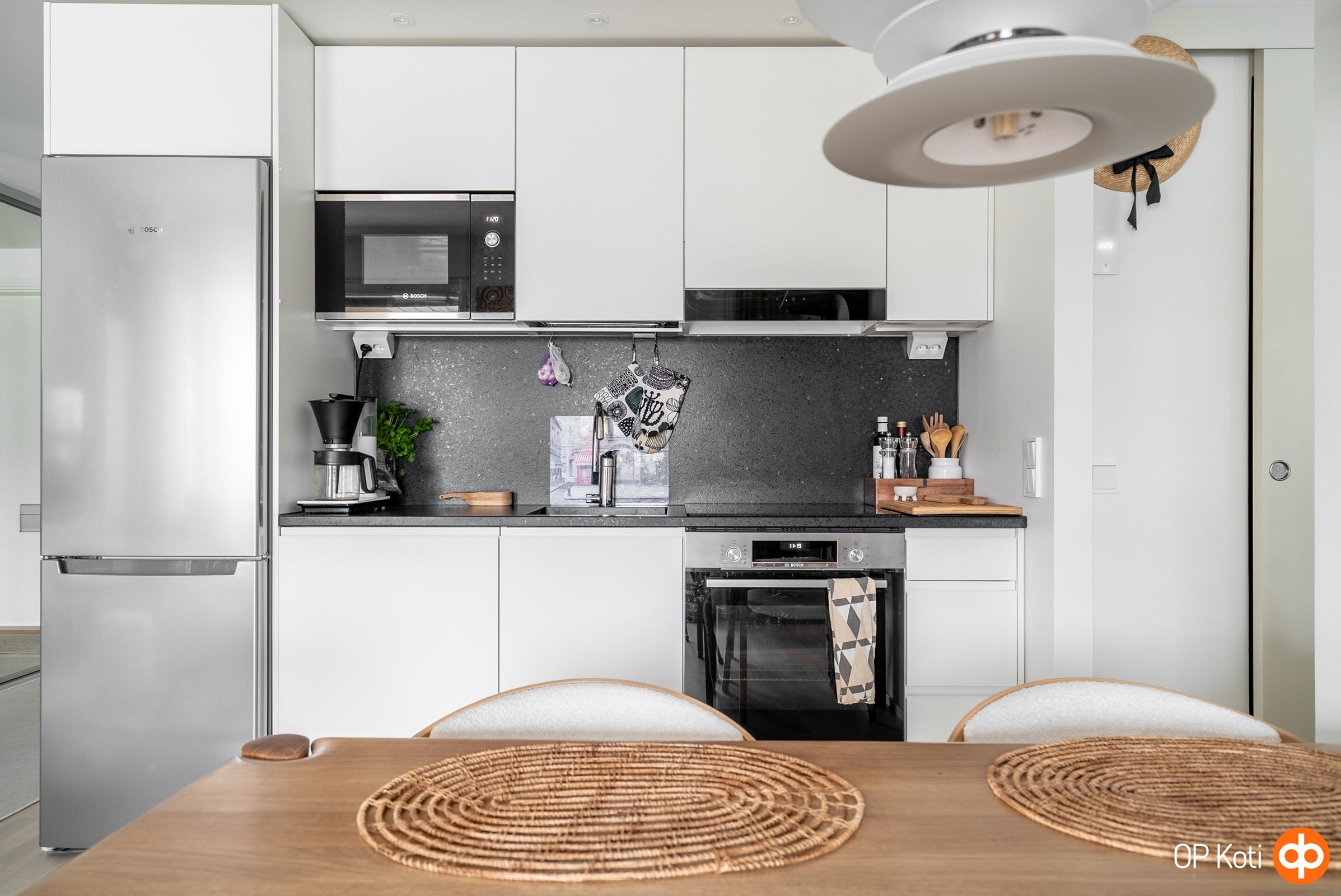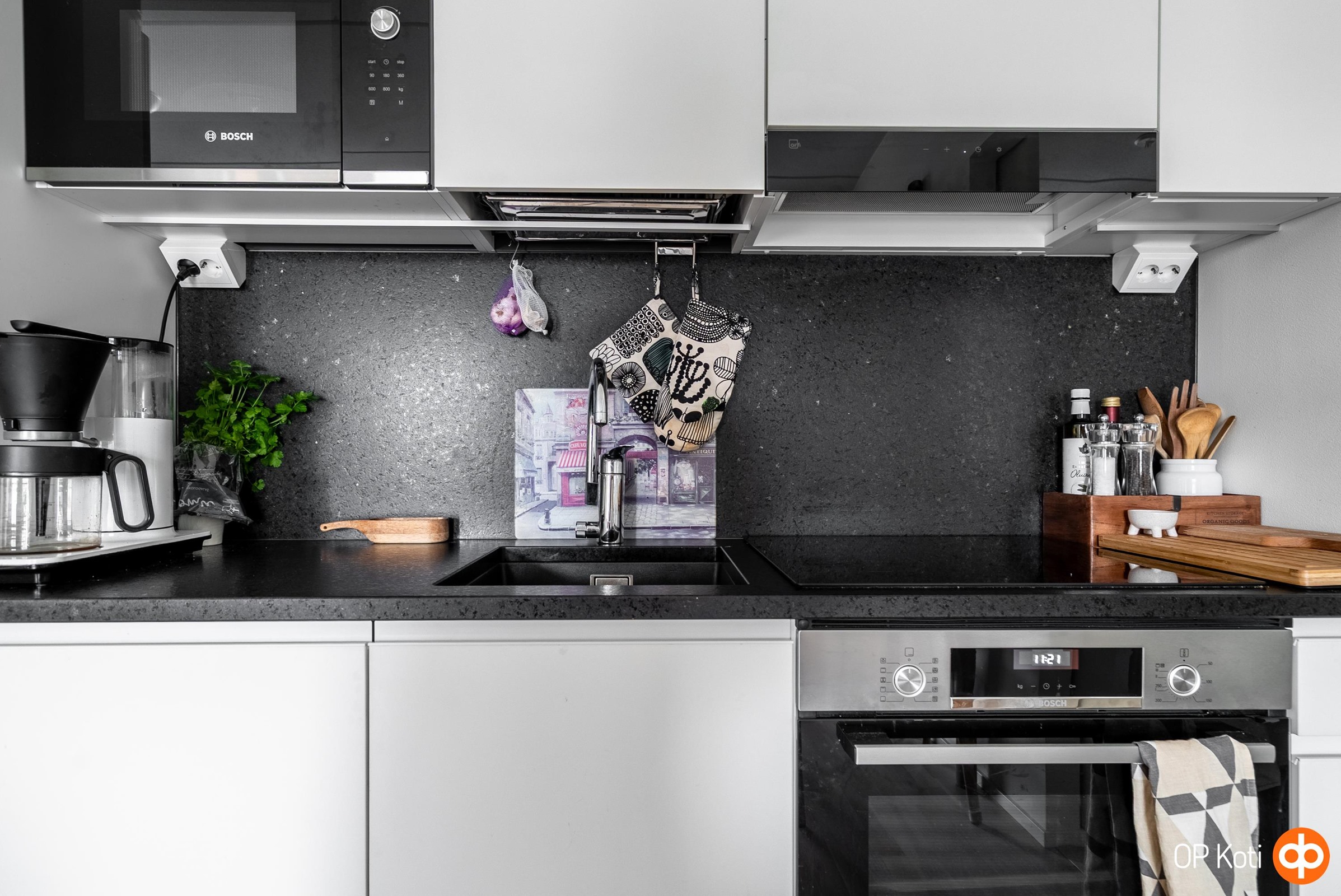 - Jääkaappipakastin, erillisuuni, induktioliesi, liesikupu, mikroaaltouuni integroitu, astianpesukone integroitu, kaapistot, kiinteät valaisimet. Bocsh kodinkoneet ja Puustellin kaapistot