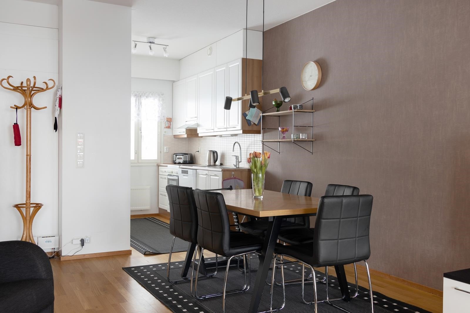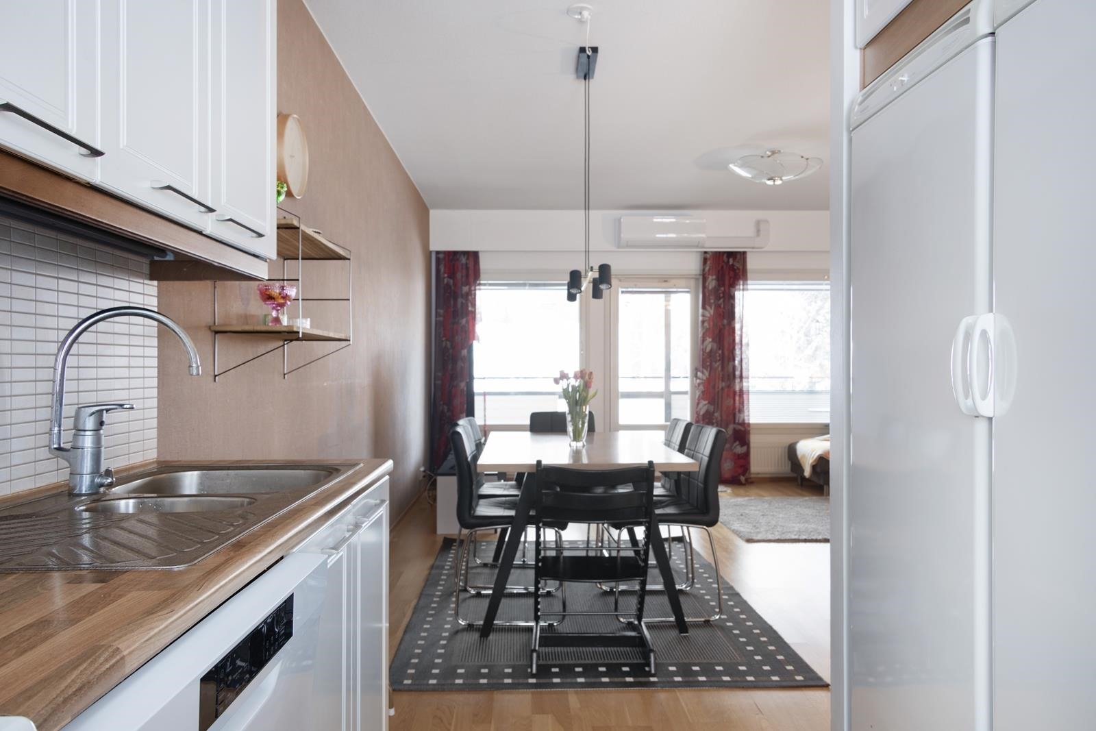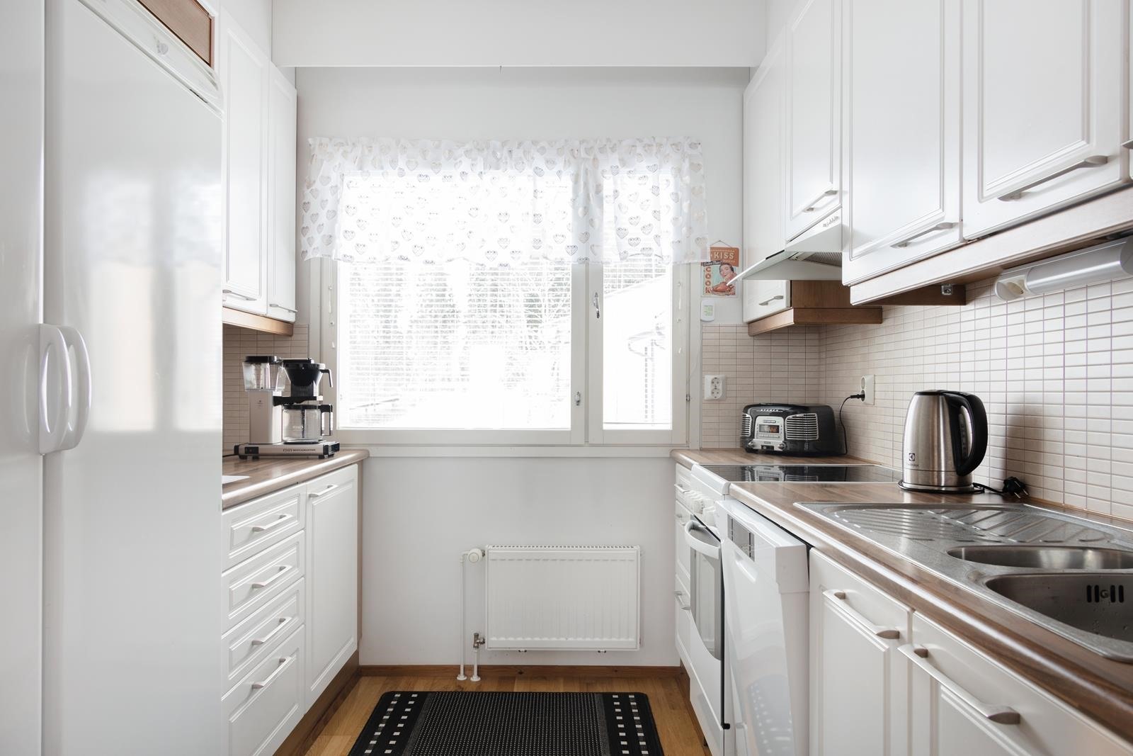 - Jääkaappi, pakastekaappi, lattialiesi, keraaminen liesi, liesituuletin, astianpesukone, kaapistot.