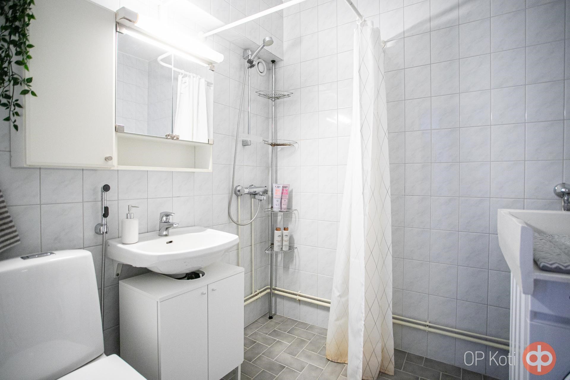 - Kylpyhuone, suihku, peilikaappi, pesukoneliitäntä, kiinteät valaisimet.