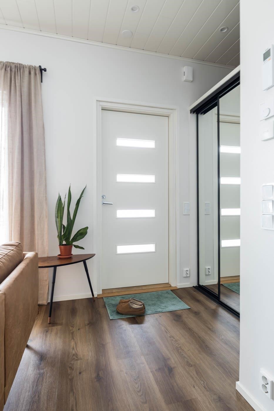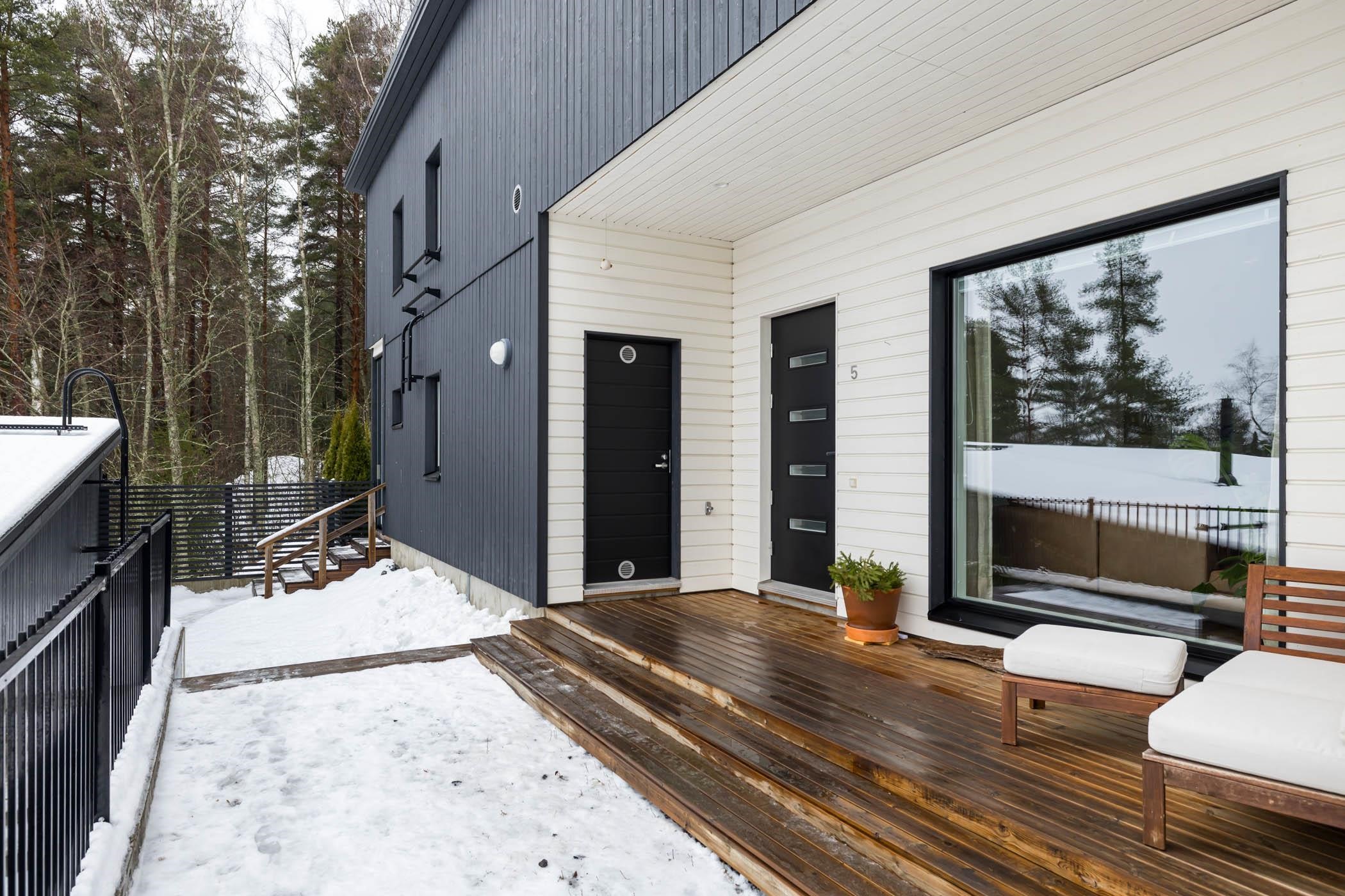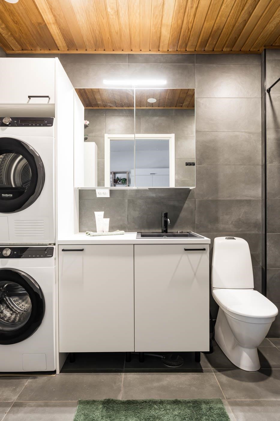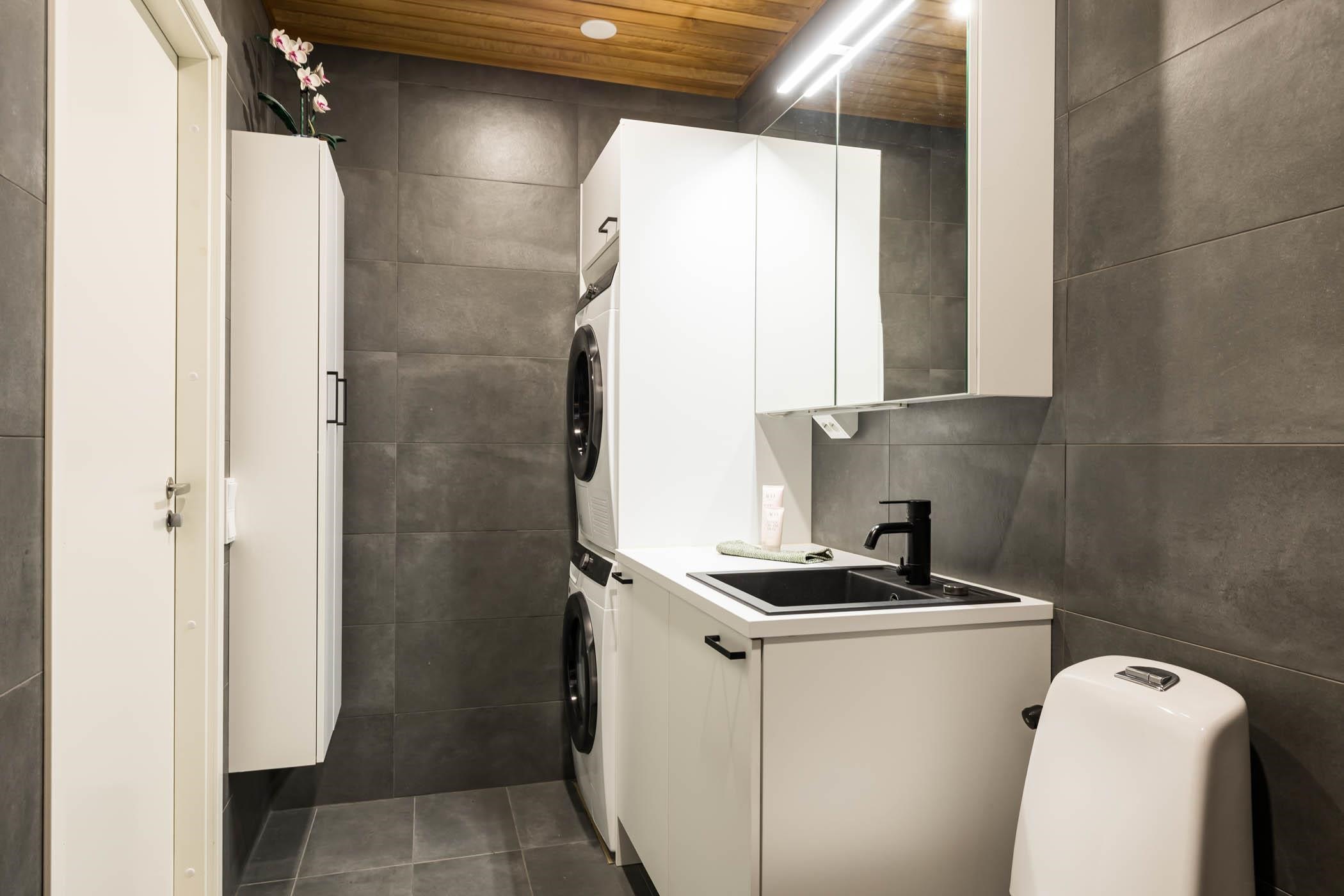 Takapihan kalliomaisema tuo suojaa ja rauhaa, luoden täydellisen puitteen rentoutumiselle. Puustellin keittiö ja olohuone muodostavat harmonisen kokonaisuuden, jossa vinyylilankkulattia tuo lämpöä ja tunnelmaa.Kylpyhuoneessa Puustellin kalusteet joiden sijoittelu mahdollistaa vaivattoman pyykkihuollon.