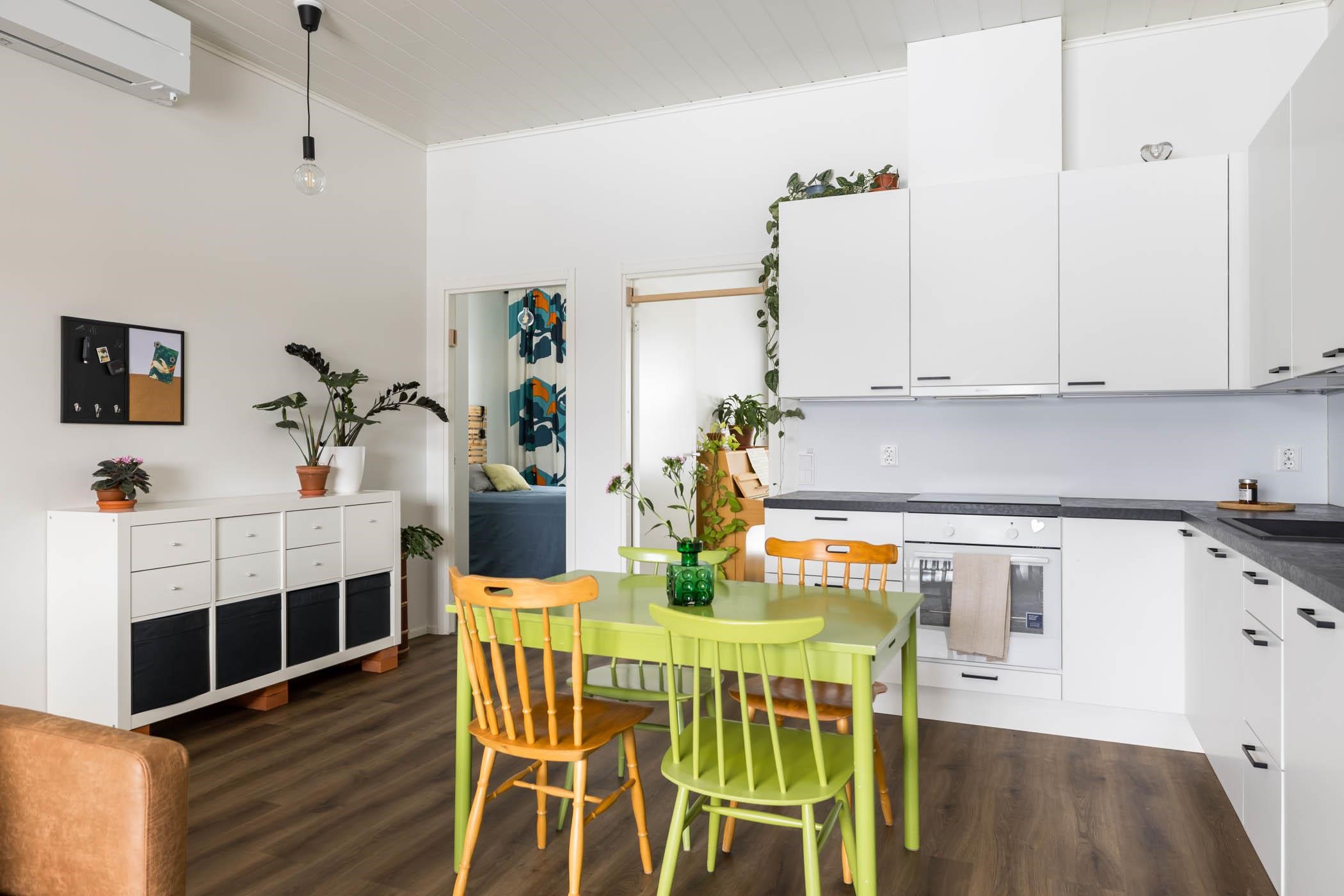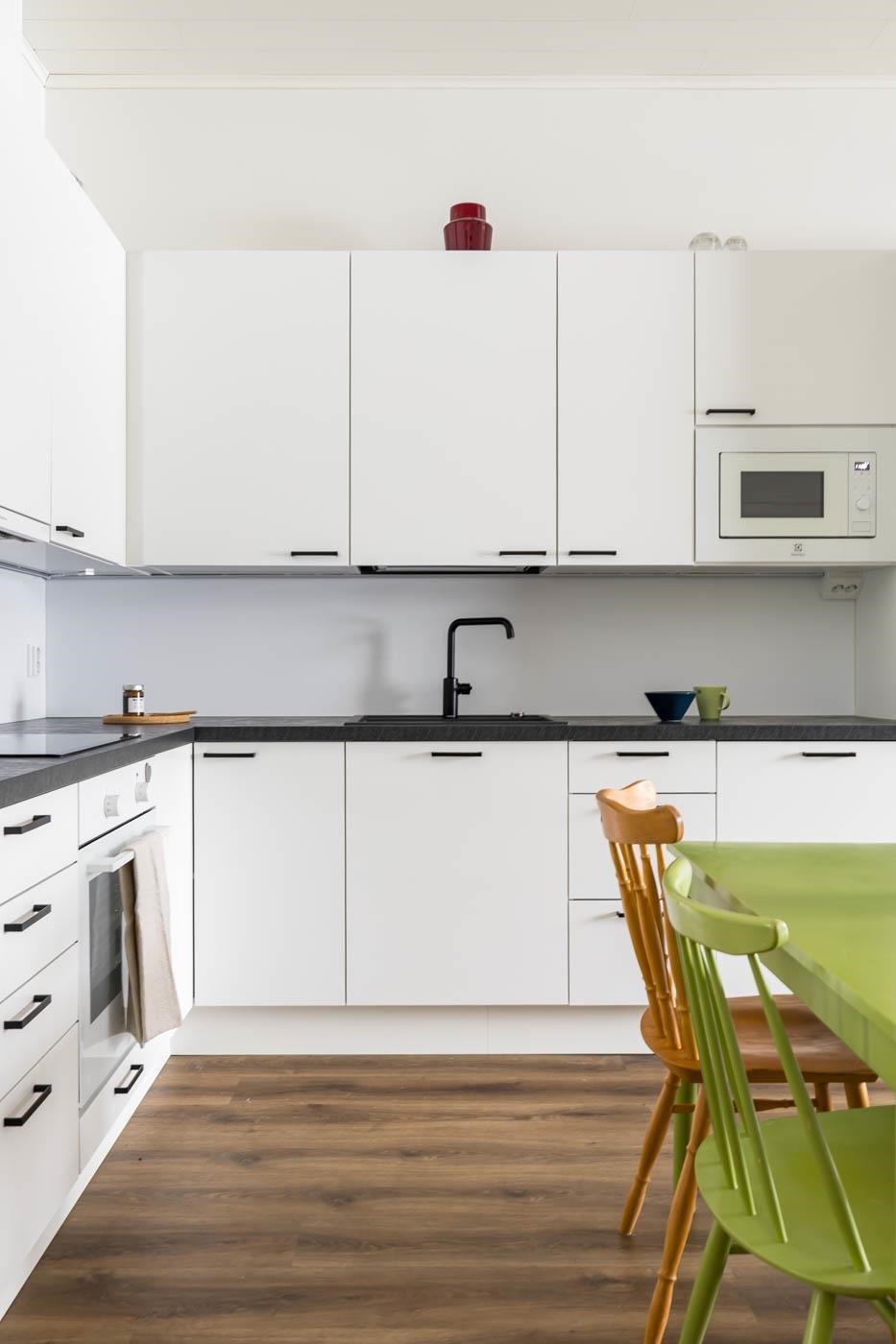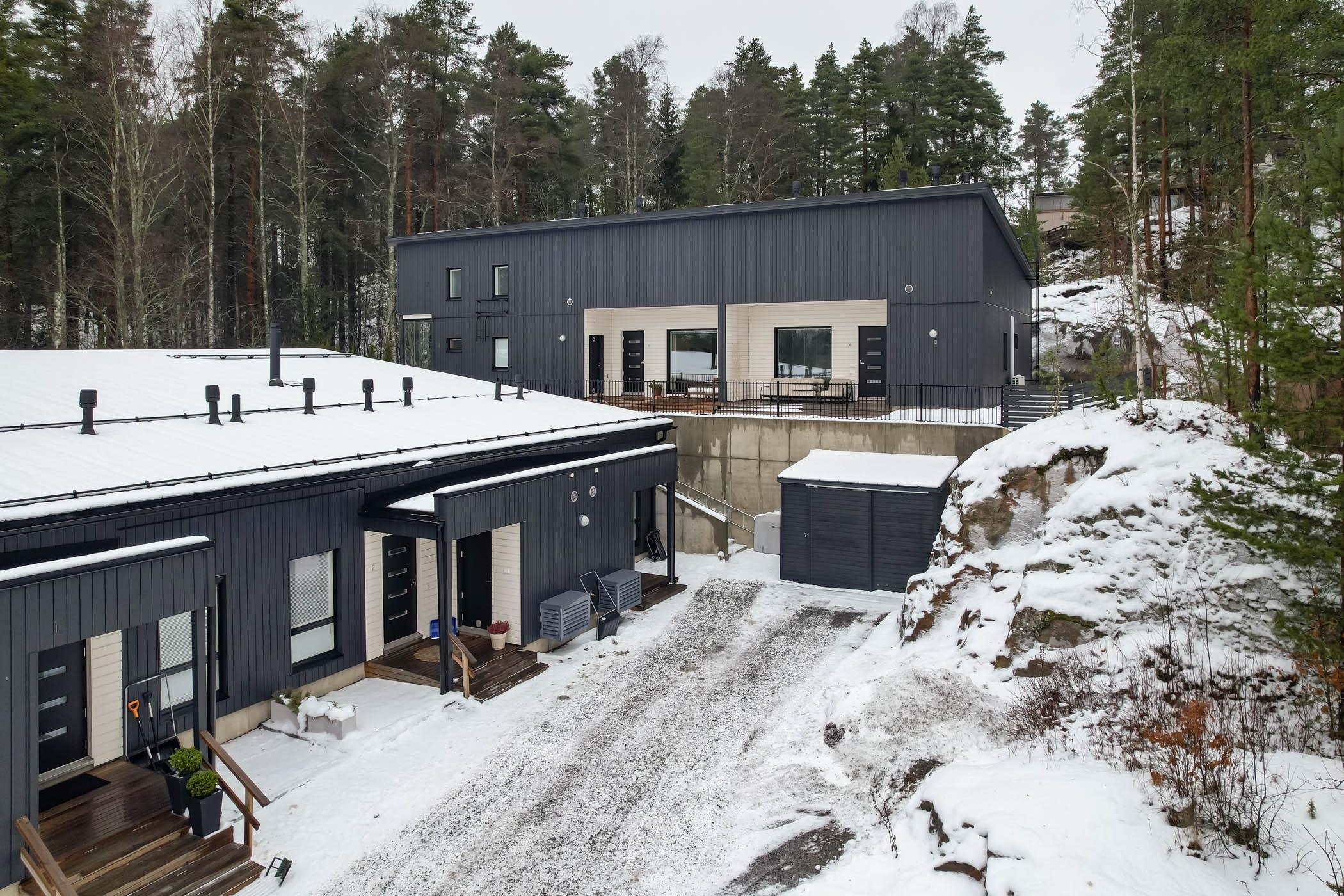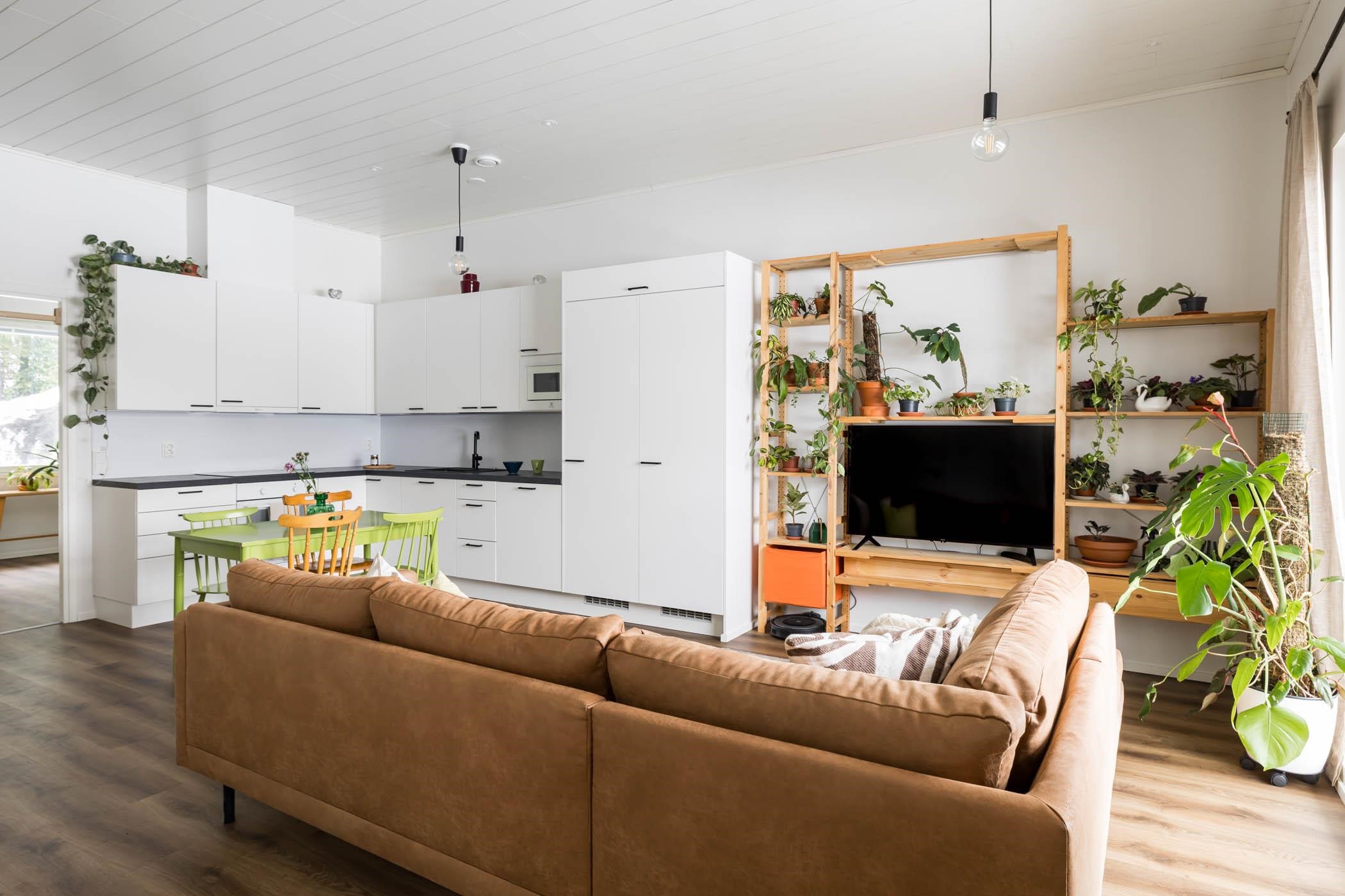 Takapihan kalliomaisema tuo suojaa ja rauhaa, luoden täydellisen puitteen rentoutumiselle. Puustellin keittiö ja olohuone muodostavat harmonisen kokonaisuuden, jossa vinyylilankkulattia tuo lämpöä ja tunnelmaa.Kylpyhuoneessa Puustellin kalusteet joiden sijoittelu mahdollistaa vaivattoman pyykkihuollon.