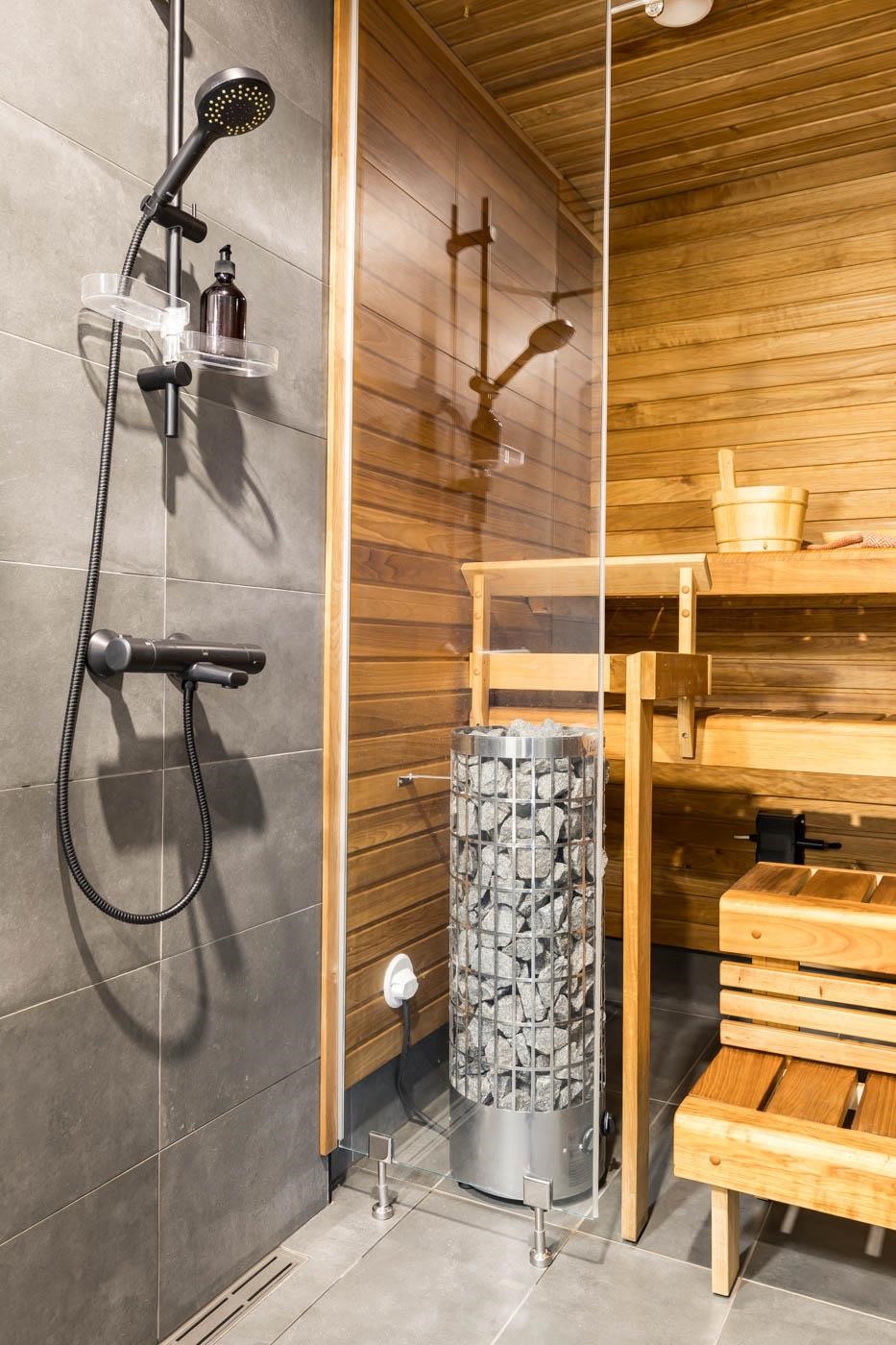 - Saunassa on sähkökiuas, kylpyhuoneessa suihku, peilikaappi, allaskaappi, pesukoneliitäntä, lattialämmitys ja kiinteät valaisimet.