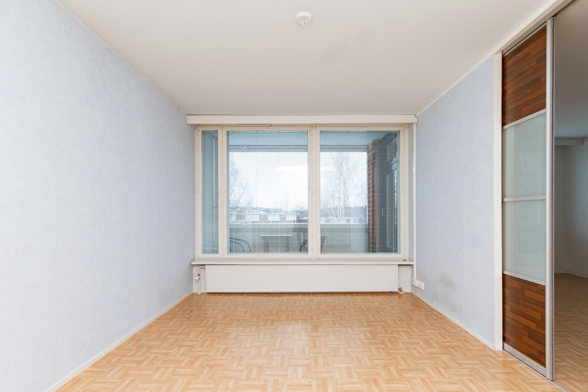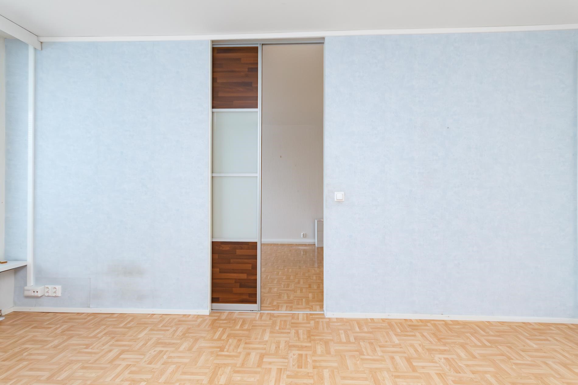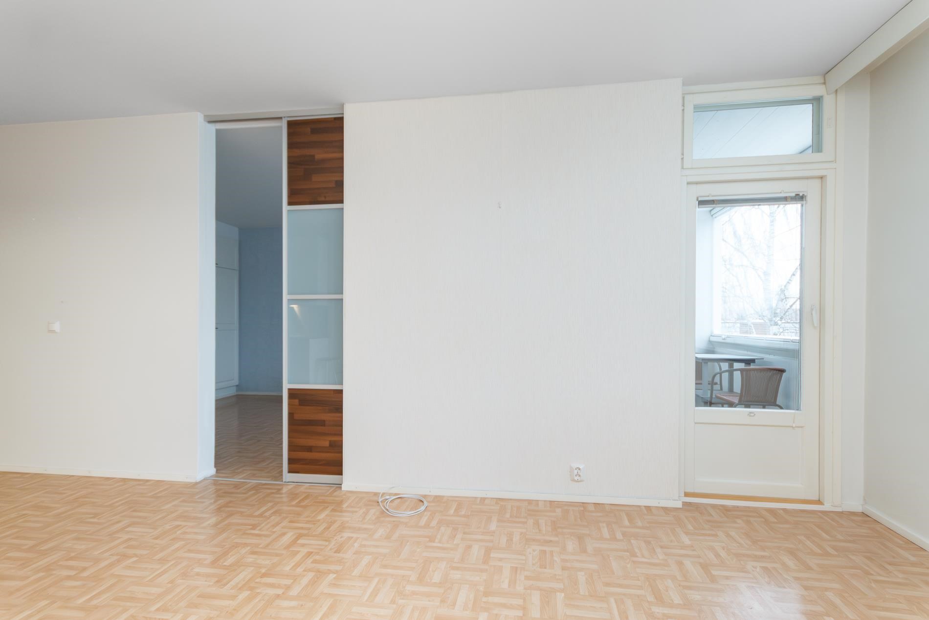 Keittiö ja olohuone ovat yhtenäistä tilaa ja makuuhuone on myös hyvänkokoinen. Huoneistolla on myös tilava lasitettu parveke. Kylpyhuoneessa on paikka pyykinpesukoneelle.