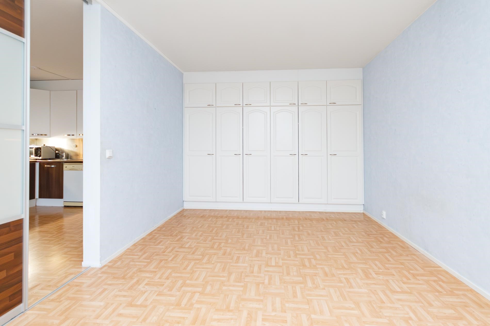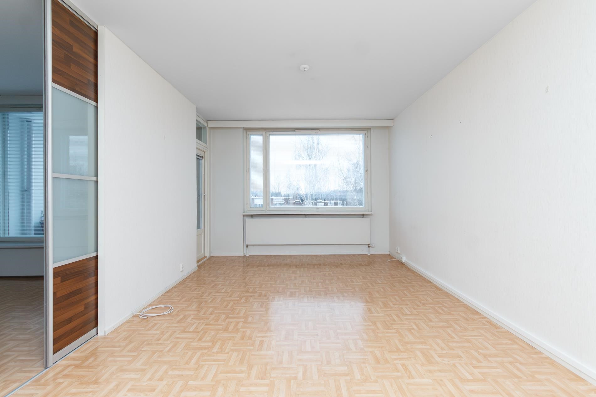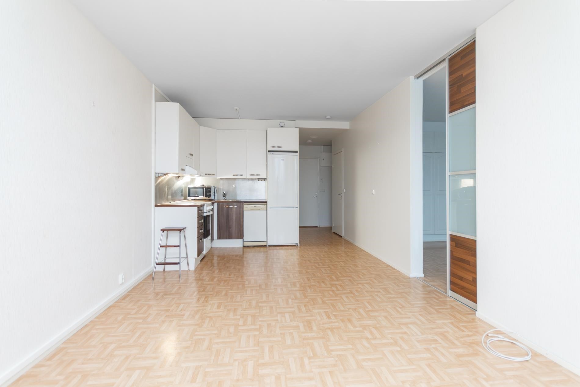 Keittiö ja olohuone ovat yhtenäistä tilaa ja makuuhuone on myös hyvänkokoinen. Huoneistolla on myös tilava lasitettu parveke. Kylpyhuoneessa on paikka pyykinpesukoneelle.