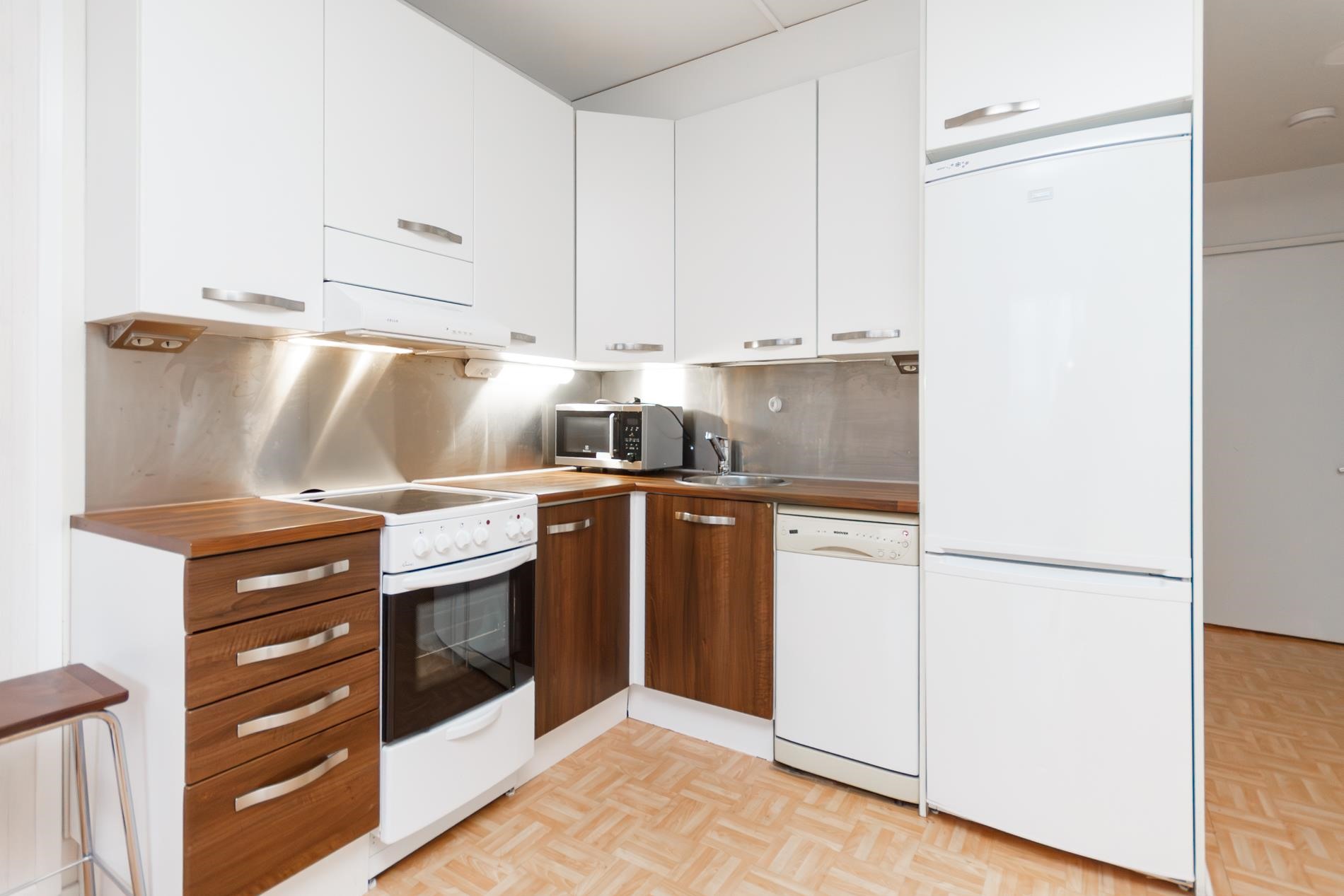 - Jääkaappipakastin, sähköliesi, liesituuletin, mikroaaltouuni, astianpesukone, kaapistot, irralliset kaapistot, kiinteät valaisimet.
