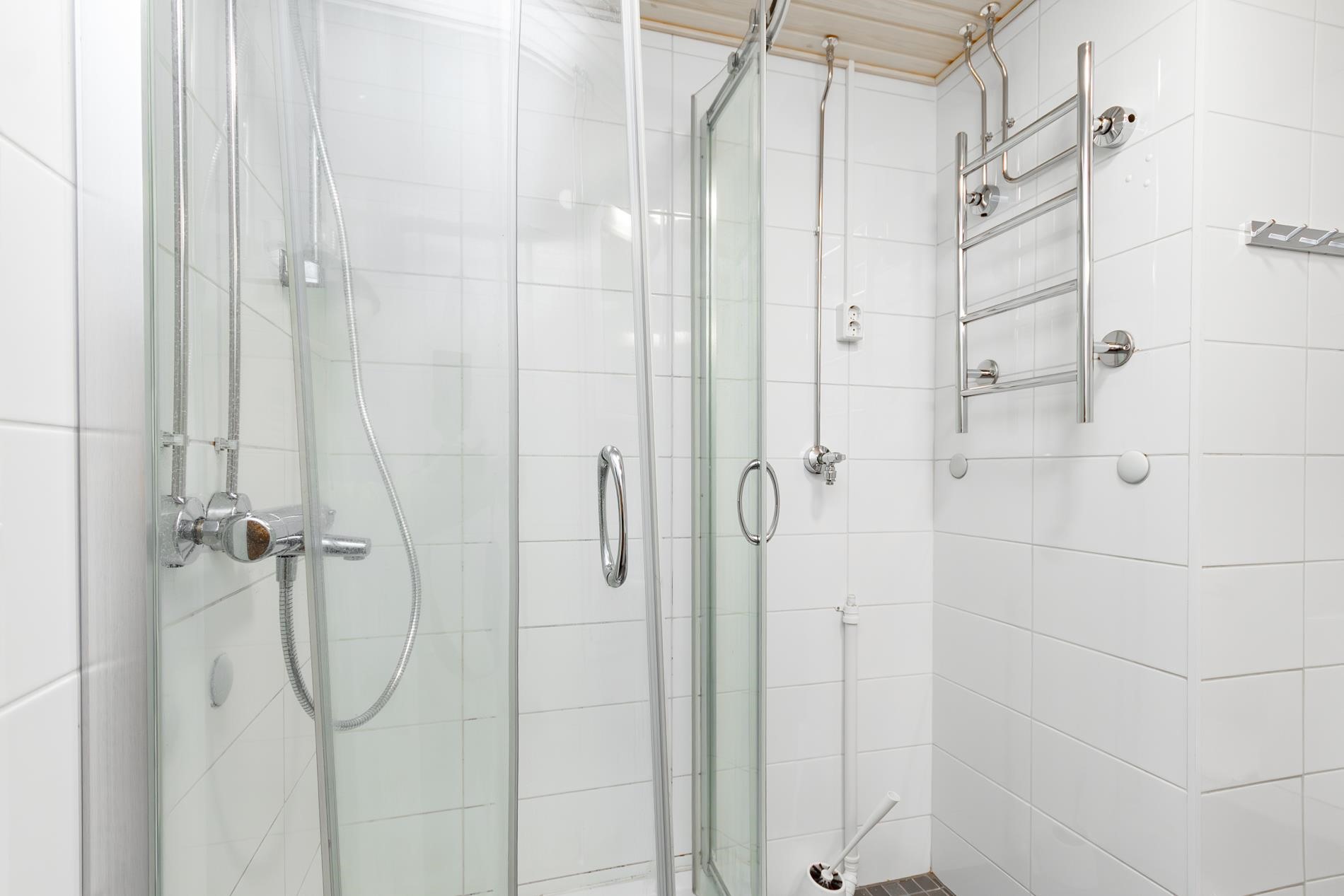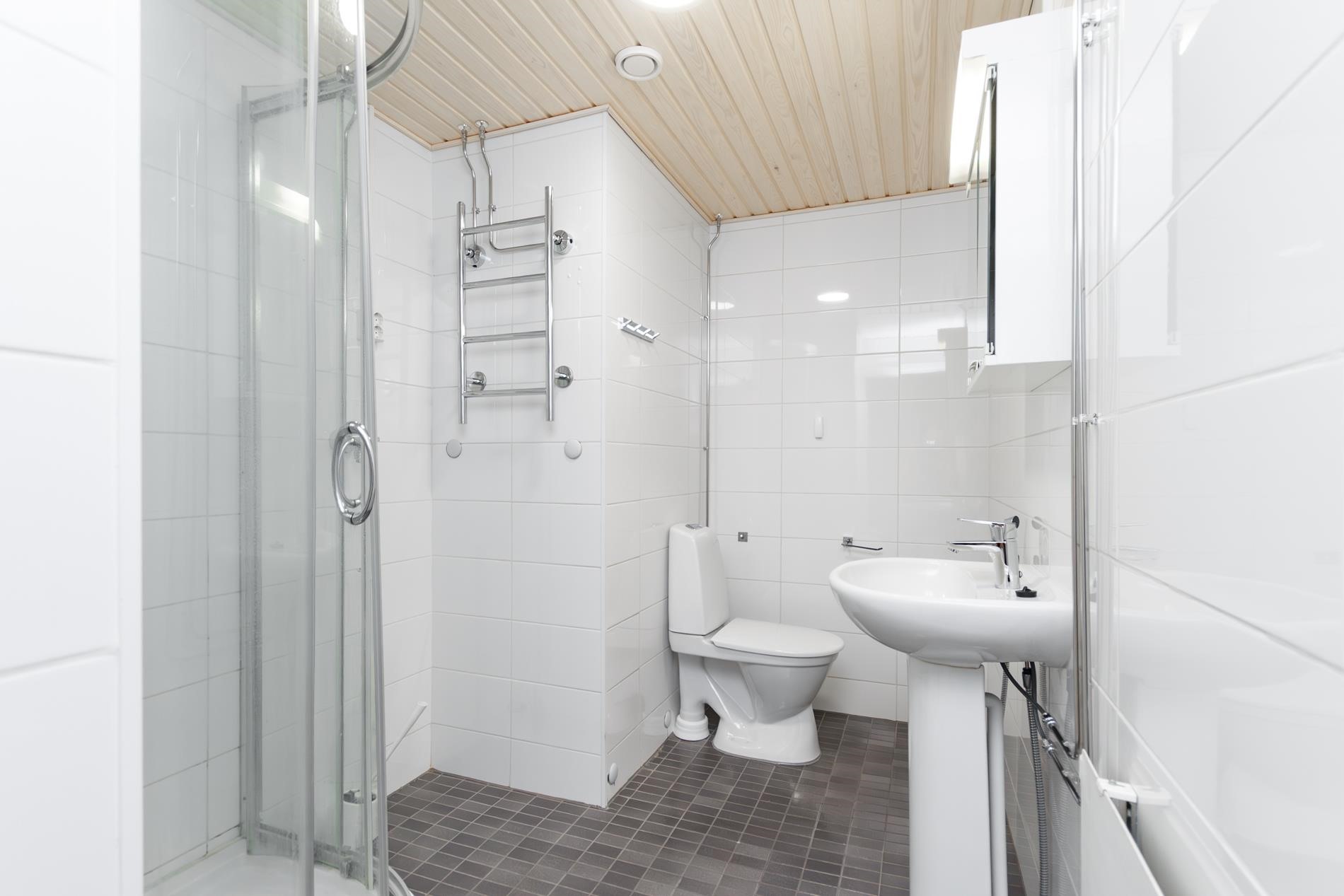 - Kylpyhuone, suihku, suihkukaappi, peilikaappi, pesukoneliitäntä, lattialämmitys, kiinteät valaisimet, Pyyhepatteri.