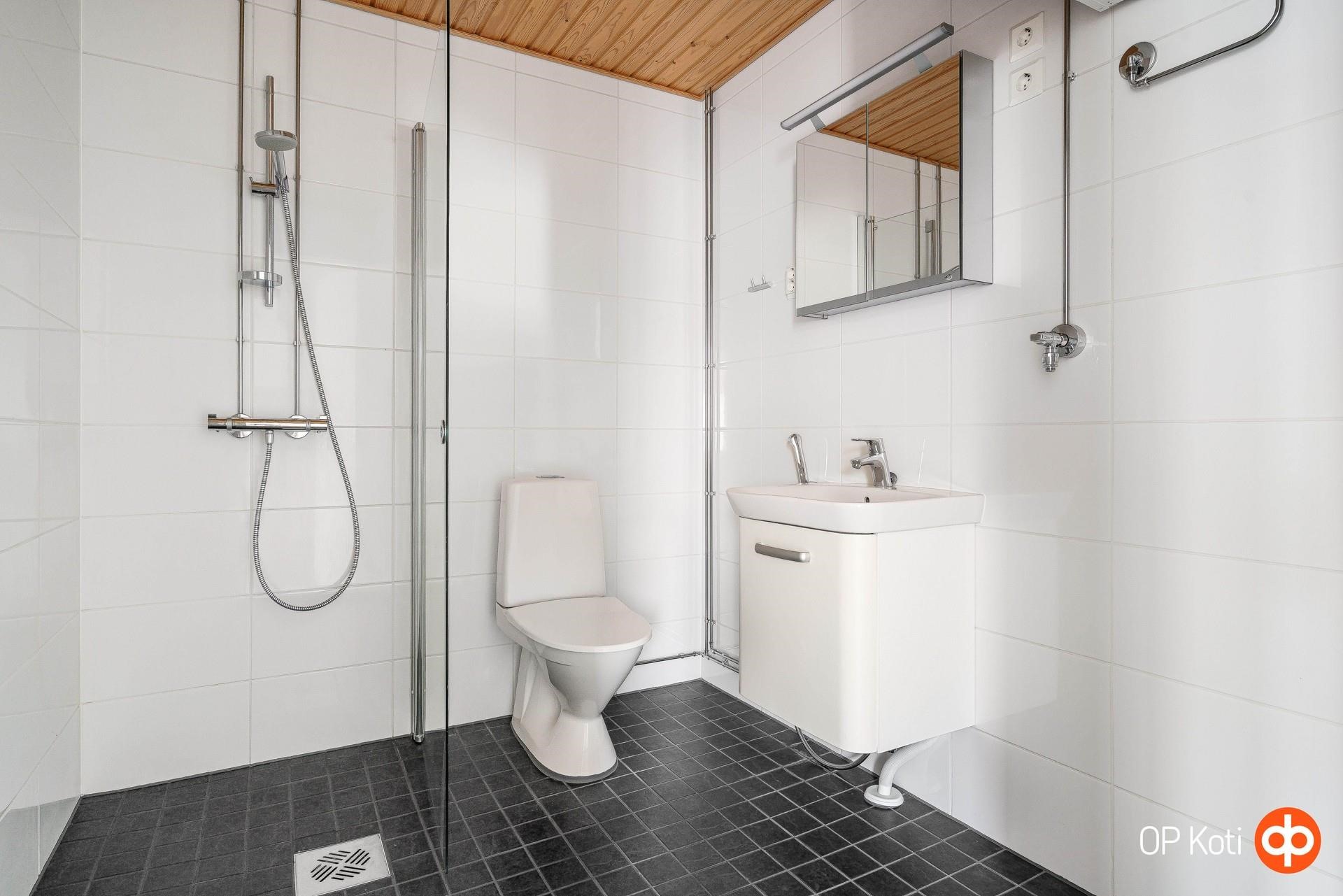 - Suihku, suihkuseinä, peilikaappi, allaskaappi, pesukoneliitäntä, lattialämmitys (mukavuuslattialämmitys sähköllä), kiinteät valaisimet.